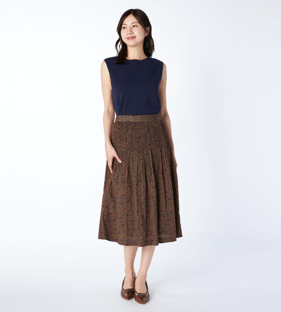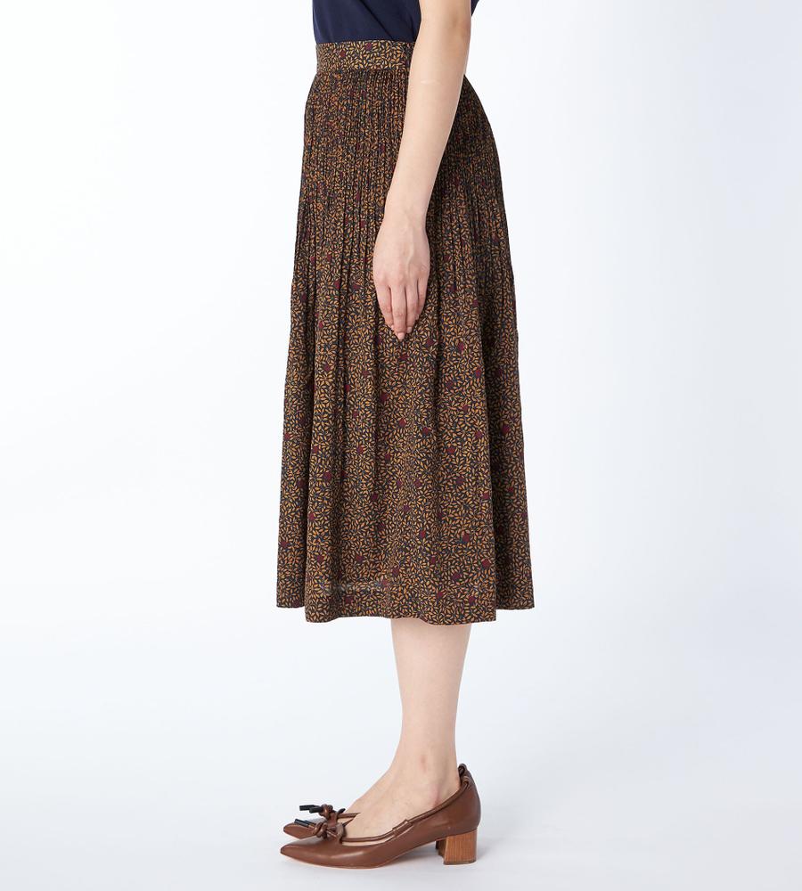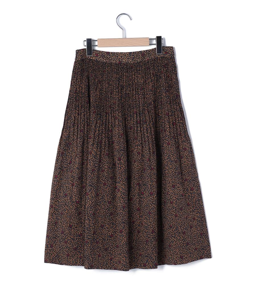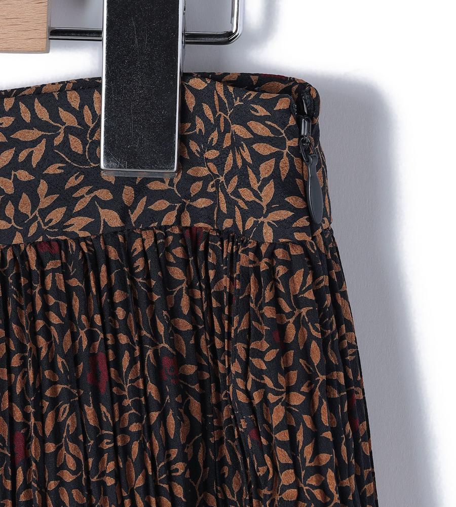 シックな配色でナチュラル感のあるリーフ柄をデザインしたスカート。フラワーモチーフもバランス良くあしらわれています。細かな柄使いで上品にまとまり、幅広いシーンで重宝するアイテム。ソフトプリーツによって女性らしさも加わっています。ひざが隠れる丈感はお出かけコーディネートにもぴったりです。