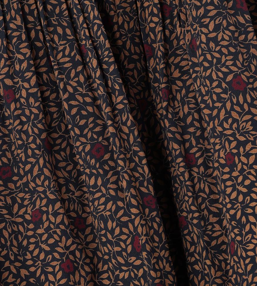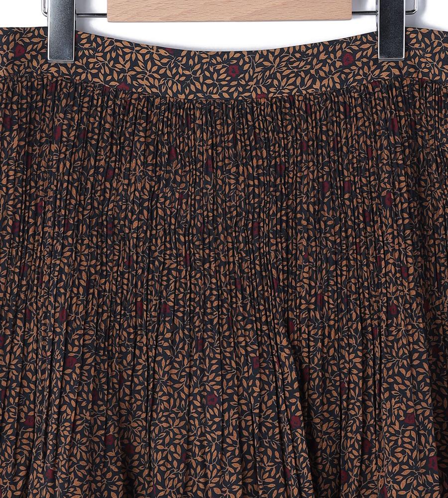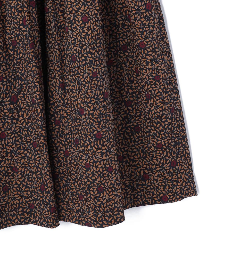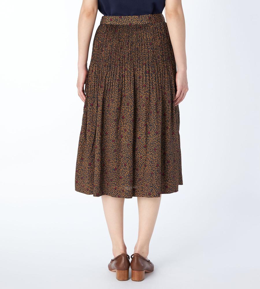 シックな配色でナチュラル感のあるリーフ柄をデザインしたスカート。フラワーモチーフもバランス良くあしらわれています。細かな柄使いで上品にまとまり、幅広いシーンで重宝するアイテム。ソフトプリーツによって女性らしさも加わっています。ひざが隠れる丈感はお出かけコーディネートにもぴったりです。