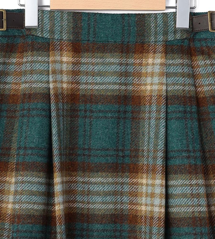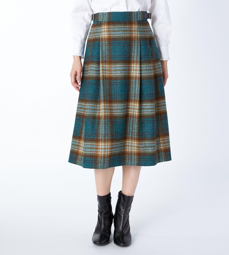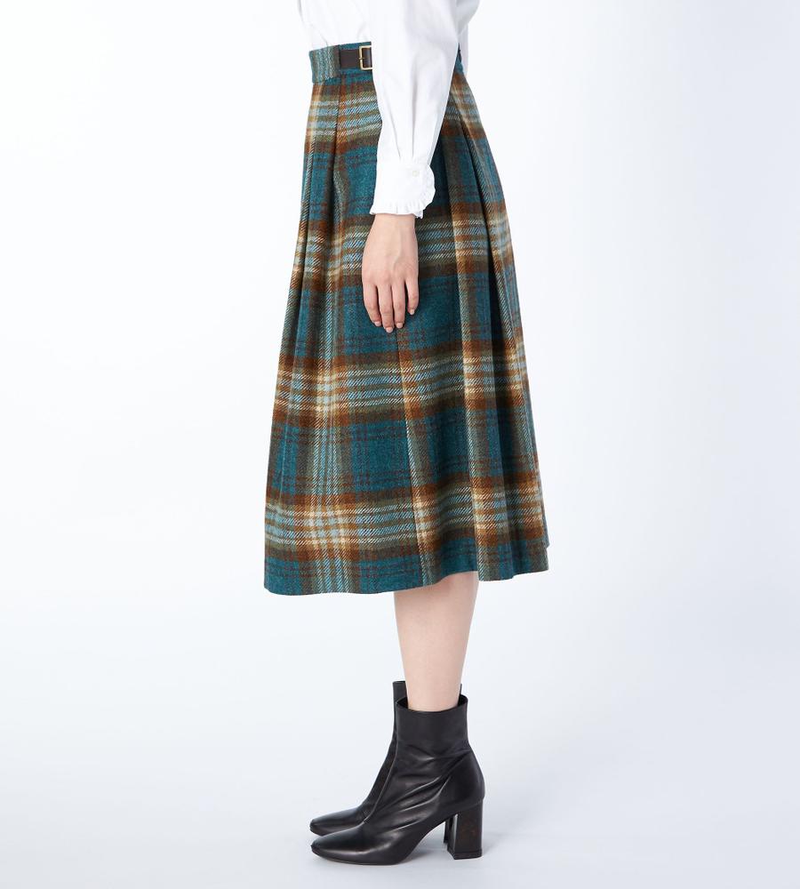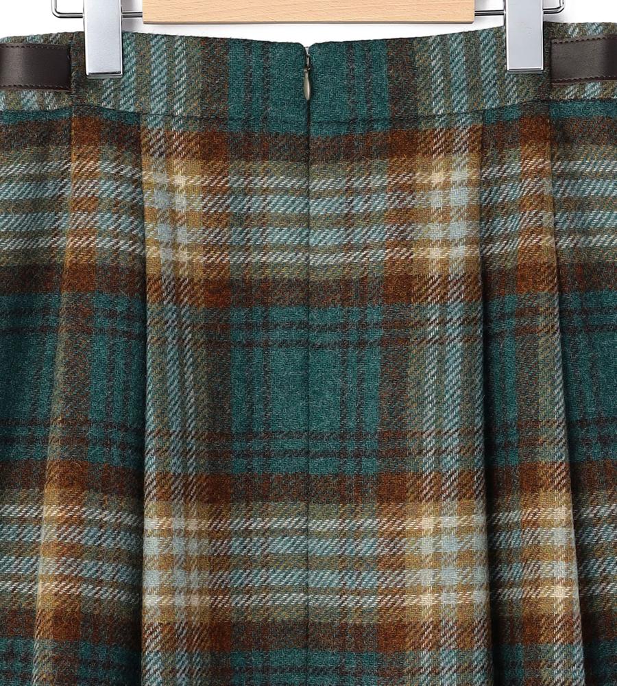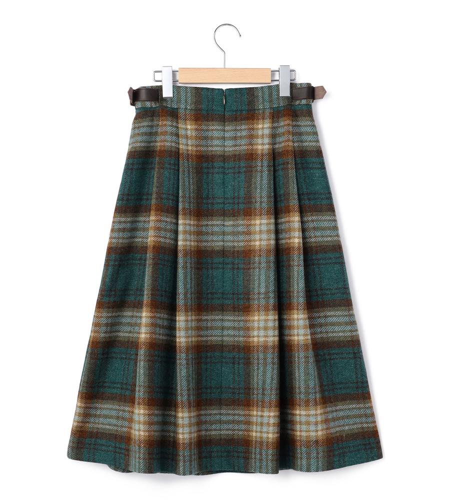 タータンチェック柄のミディ丈スカート。ウエストサイドのレザーベルトがおしゃれなデザインアクセント。フレアに広がる、タック入りでドレープ感のあるシルエットがフェミニンなポイント。毛100%のあたたかな生地感で秋冬シーズンらしい着こなしに最適。スタイリッシュなお出かけコーディネートが完成する一枚です。