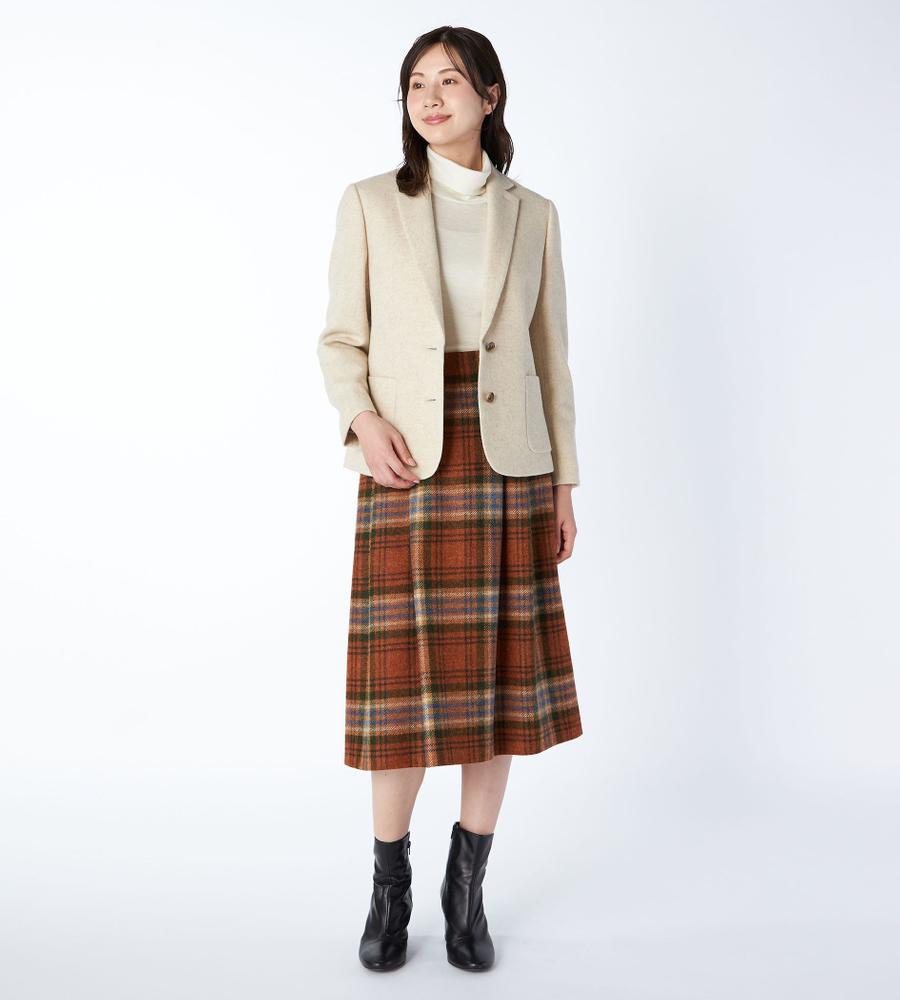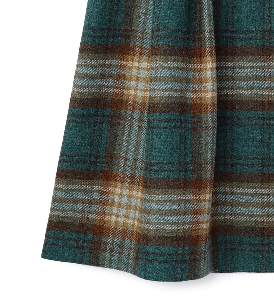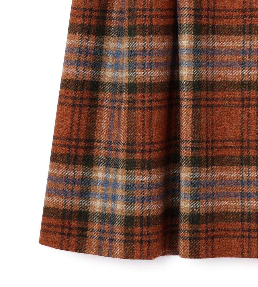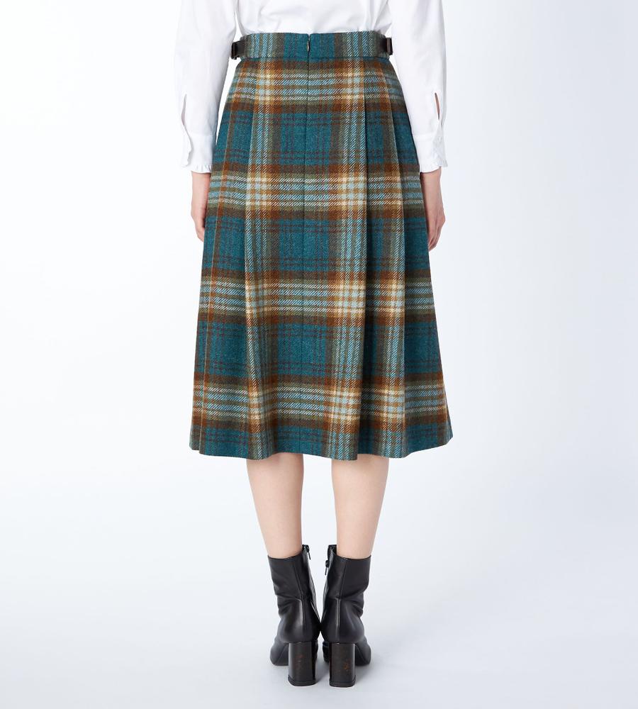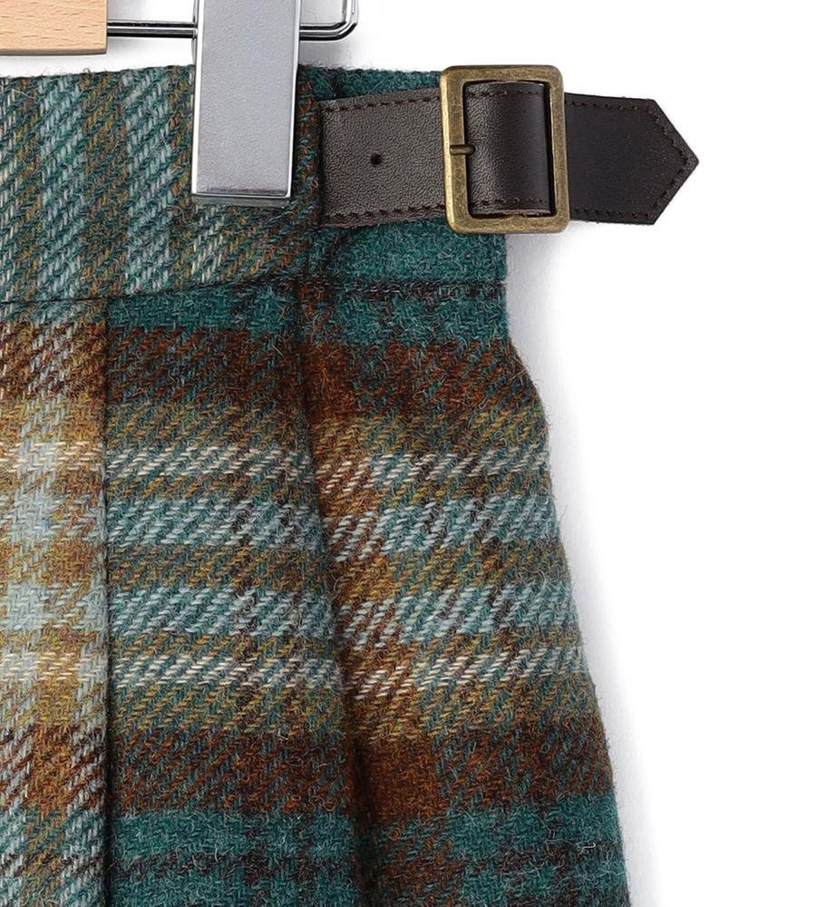 タータンチェック柄のミディ丈スカート。ウエストサイドのレザーベルトがおしゃれなデザインアクセント。フレアに広がる、タック入りでドレープ感のあるシルエットがフェミニンなポイント。毛100%のあたたかな生地感で秋冬シーズンらしい着こなしに最適。スタイリッシュなお出かけコーディネートが完成する一枚です。