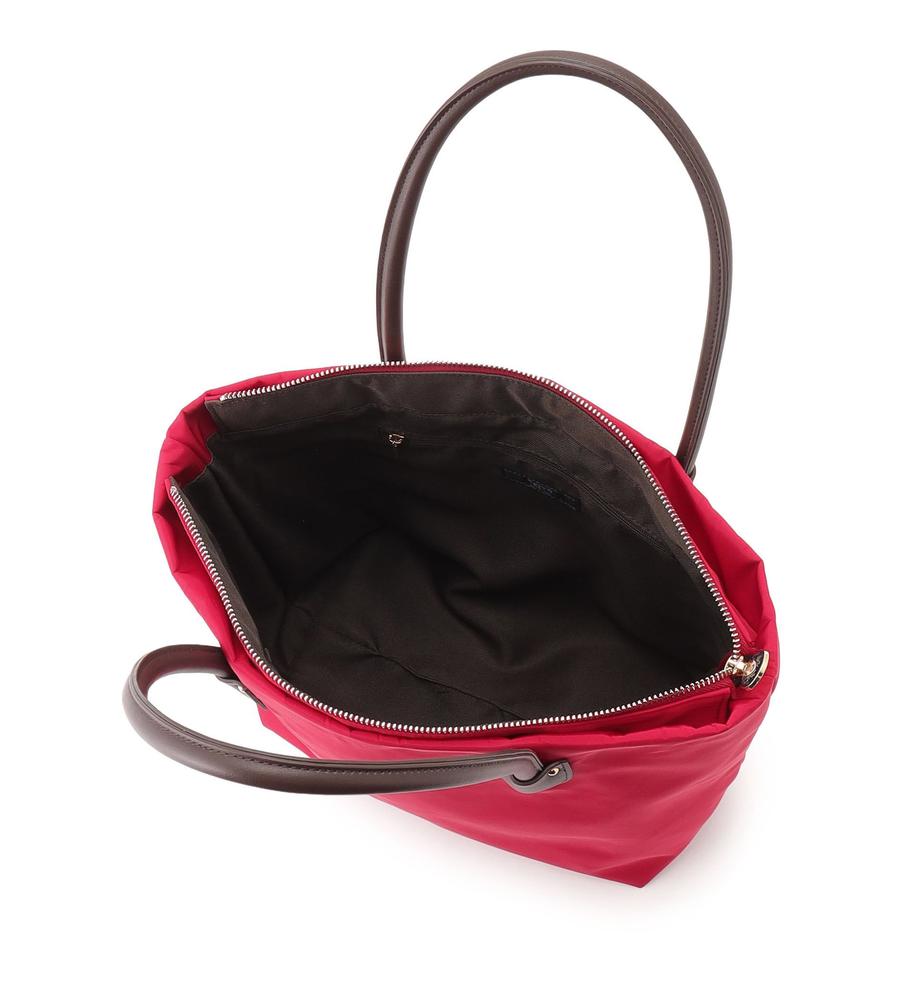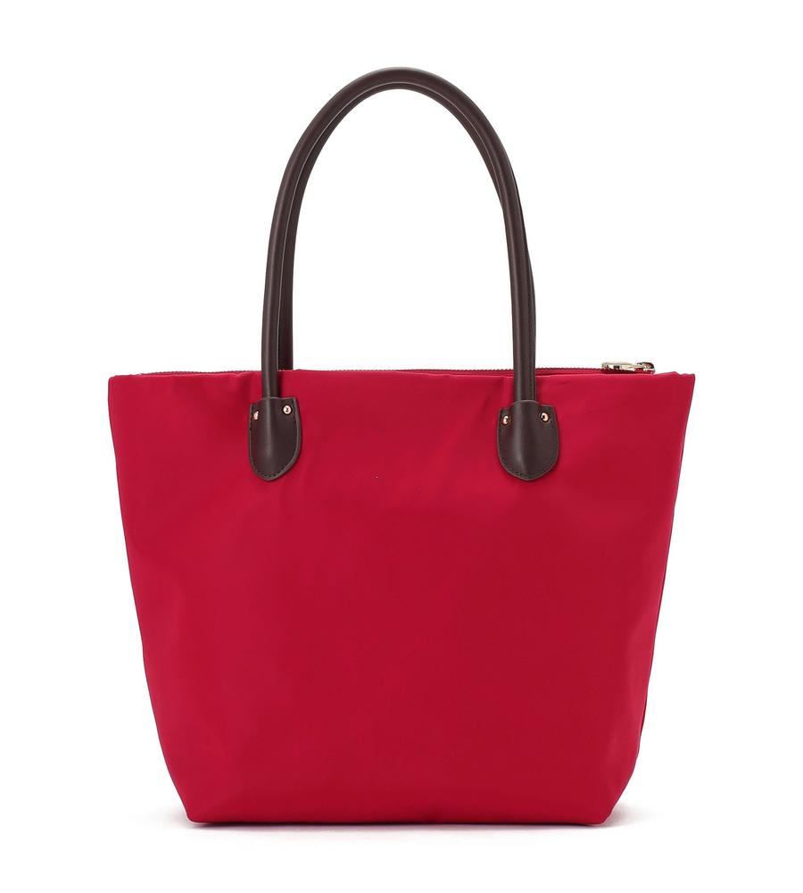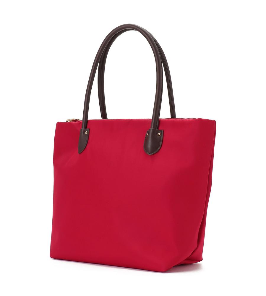 カジュアルさと品の良さを兼ね備えたトートバッグ。本体は色鮮やかなナイロン、ハンドルは上品な合成皮革を使用しています。A4サイズが入る収納力に加え、広めの底マチやファスナー式の間口、大きな内ポケットなどもポイント。シンプルな無地デザインで合わせやすく、オンオフ兼用で幅広くお使いいただけます。