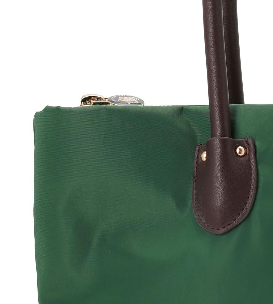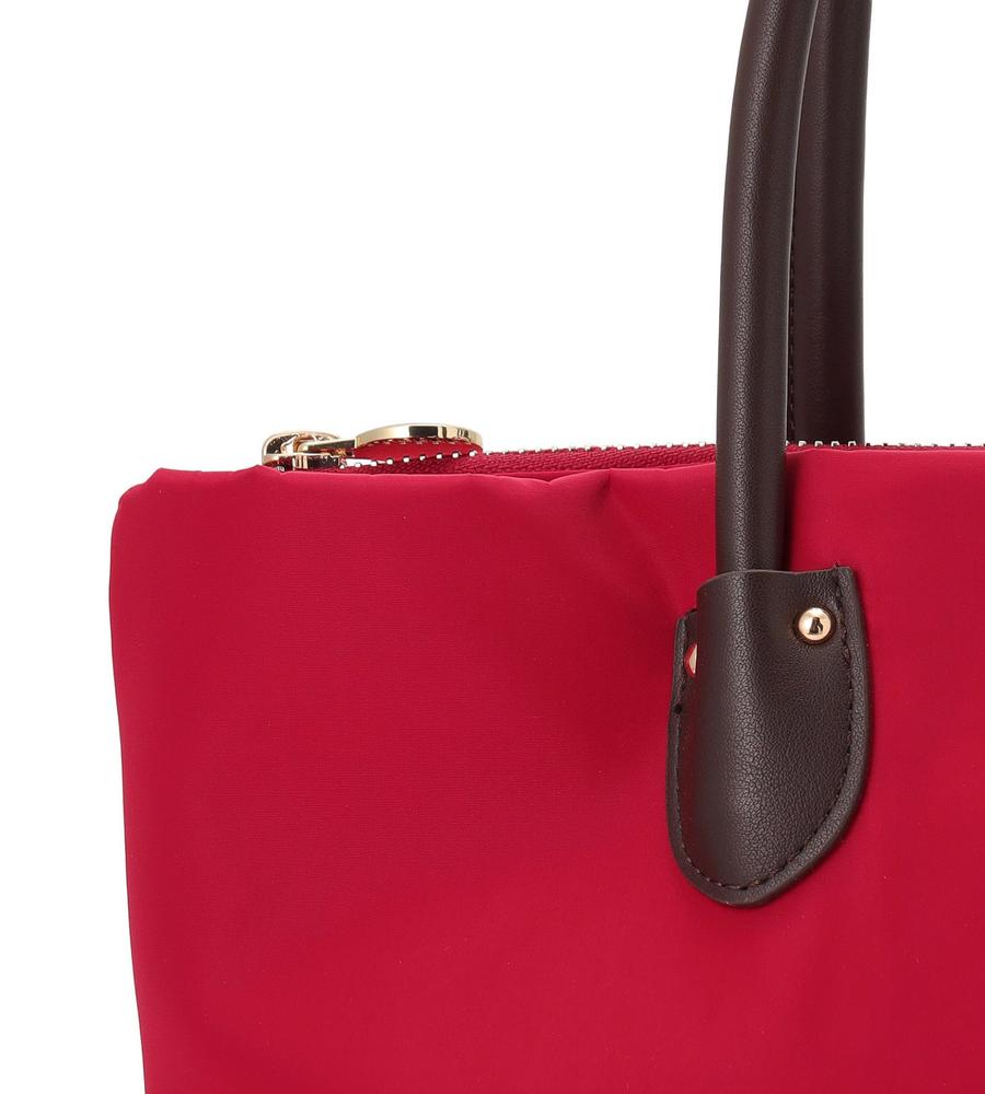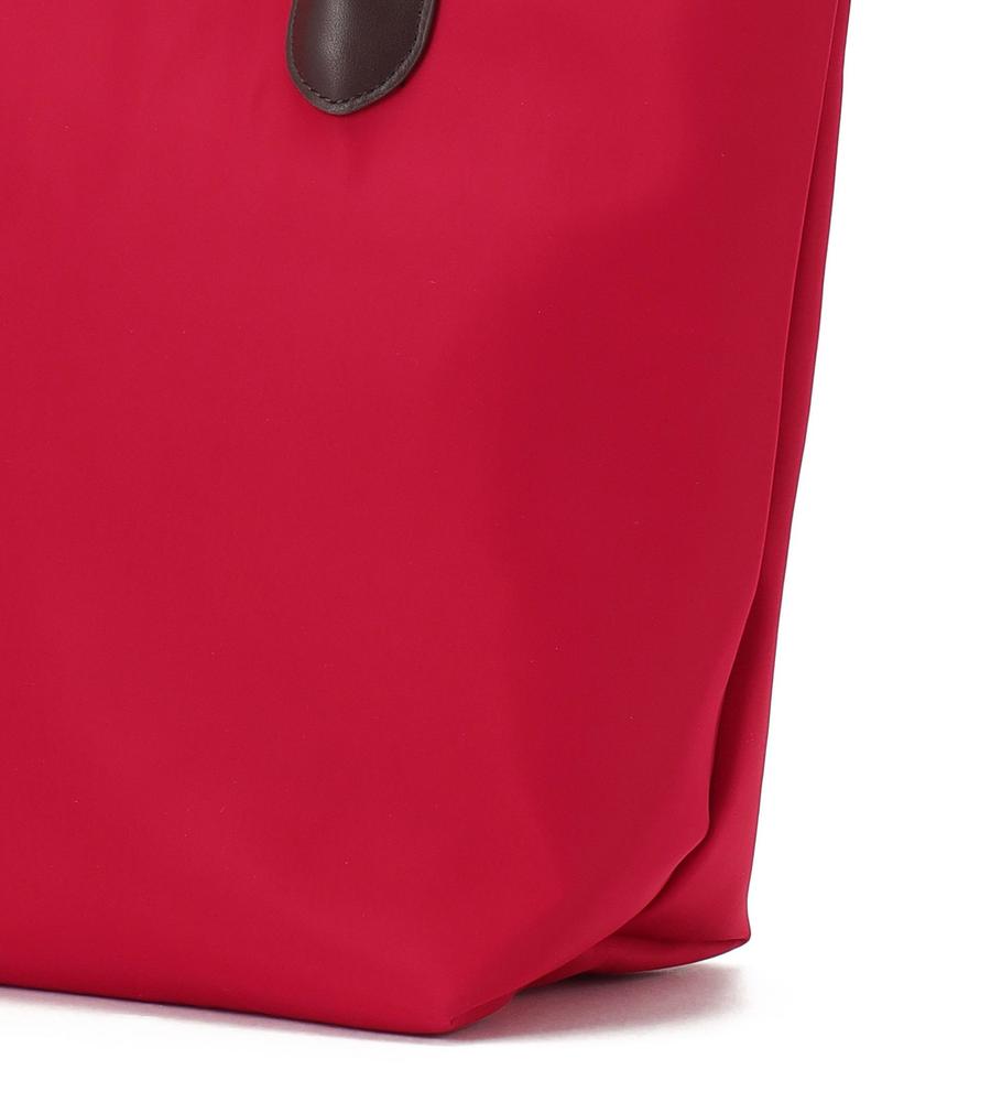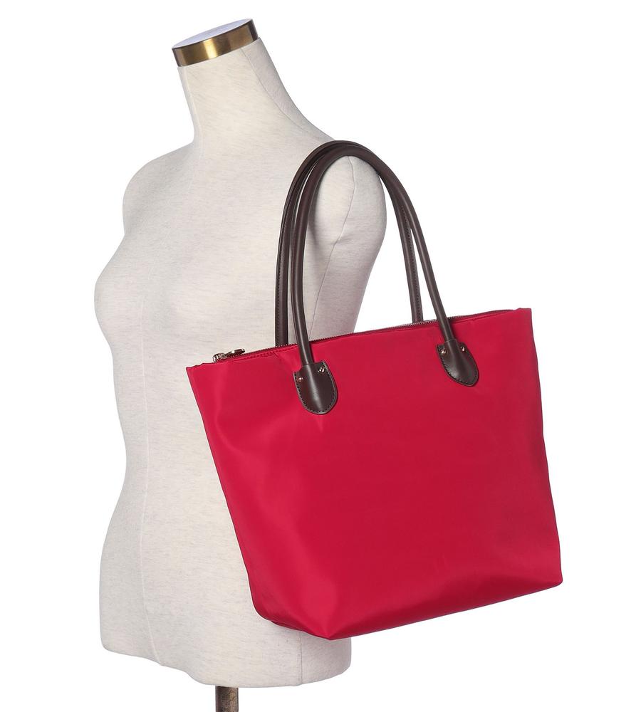 カジュアルさと品の良さを兼ね備えたトートバッグ。本体は色鮮やかなナイロン、ハンドルは上品な合成皮革を使用しています。A4サイズが入る収納力に加え、広めの底マチやファスナー式の間口、大きな内ポケットなどもポイント。シンプルな無地デザインで合わせやすく、オンオフ兼用で幅広くお使いいただけます。