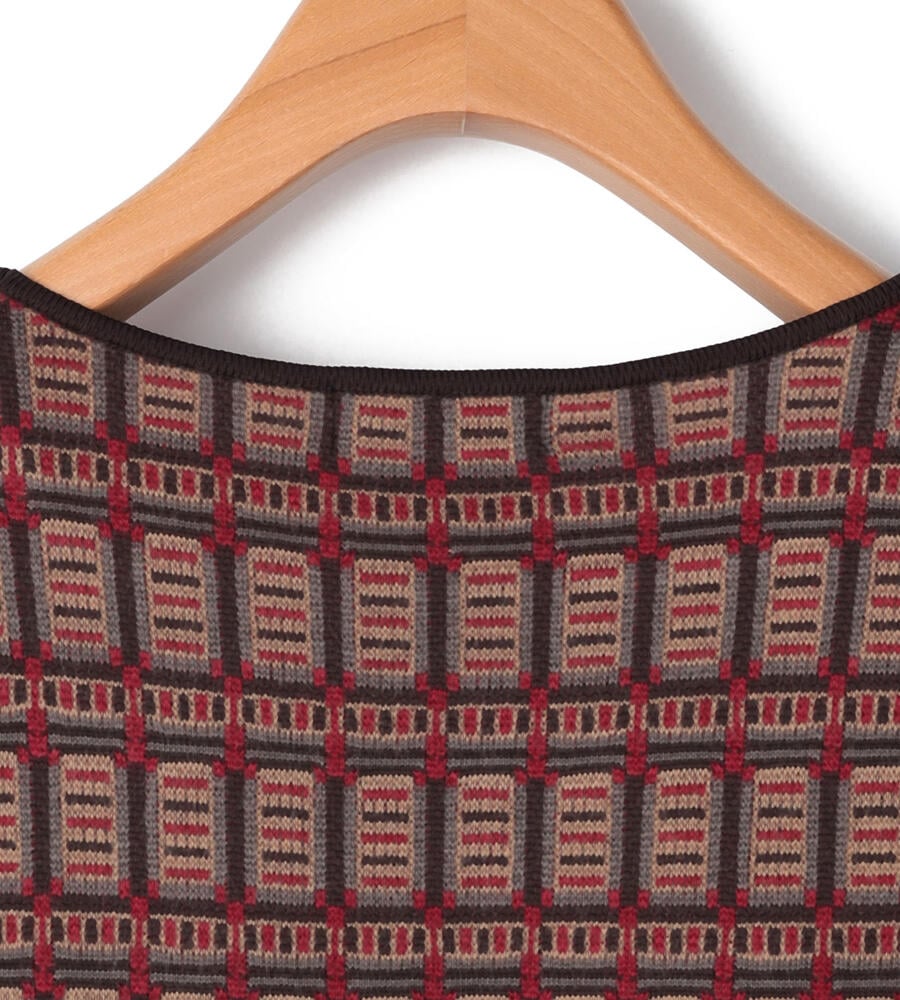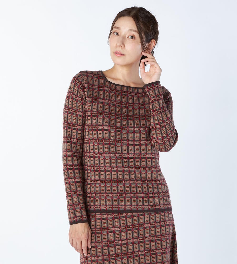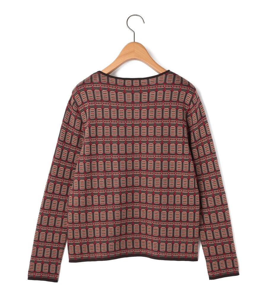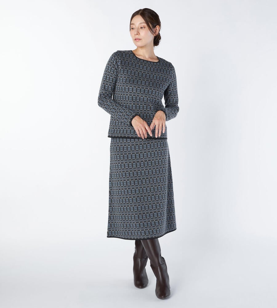幾何学的な柄使いが印象的なジャカードニットを用いたトップス。スクエアネックを採用して、柄の美しさを引き立てる仕上がりになっています。袖口やネックライン、裾をトリミングしており、全体を引き締めているのもポイント。同素材のスカートを合わせたセットアップスタイルもお楽しみいただけます。