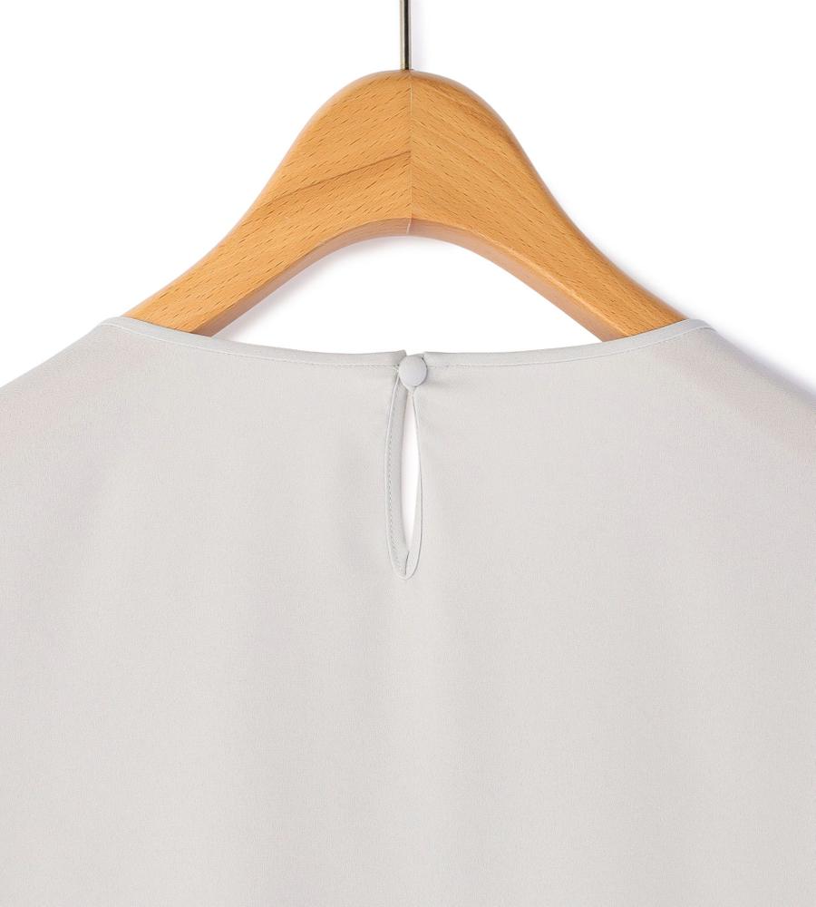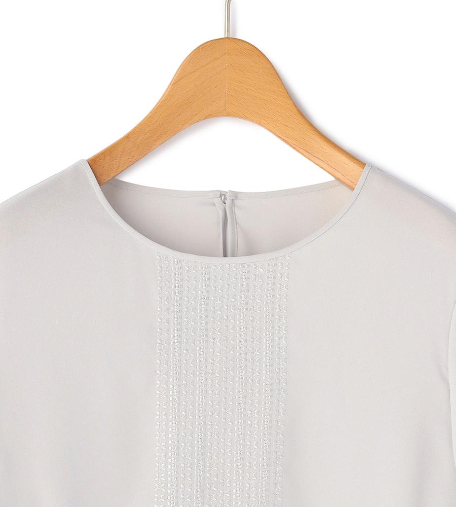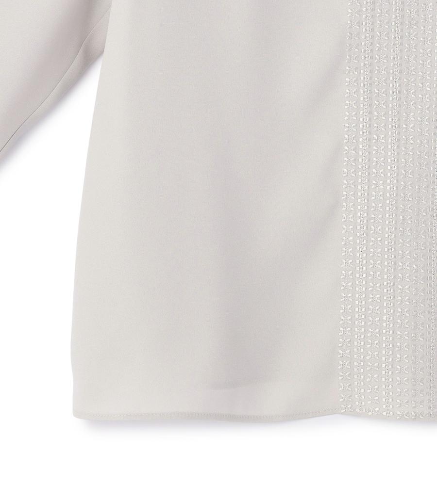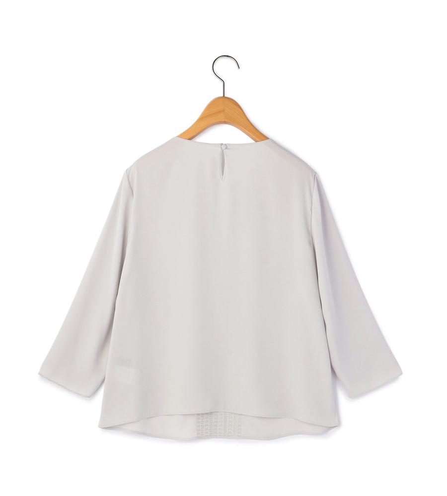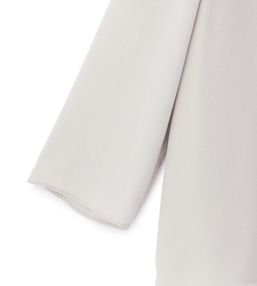 サテン生地で仕立てたエレガントなムードを演出する7分袖丈ブラウス。シンプルなデザインにフロントのセンターラインのディテールの細かな刺繍、背中のくるみボタンがさりげなくおしゃれなアクセント。落ち着いたカラーでボトムを選ばずマッチします。毎日のコーディネートで活躍するアイテムです。