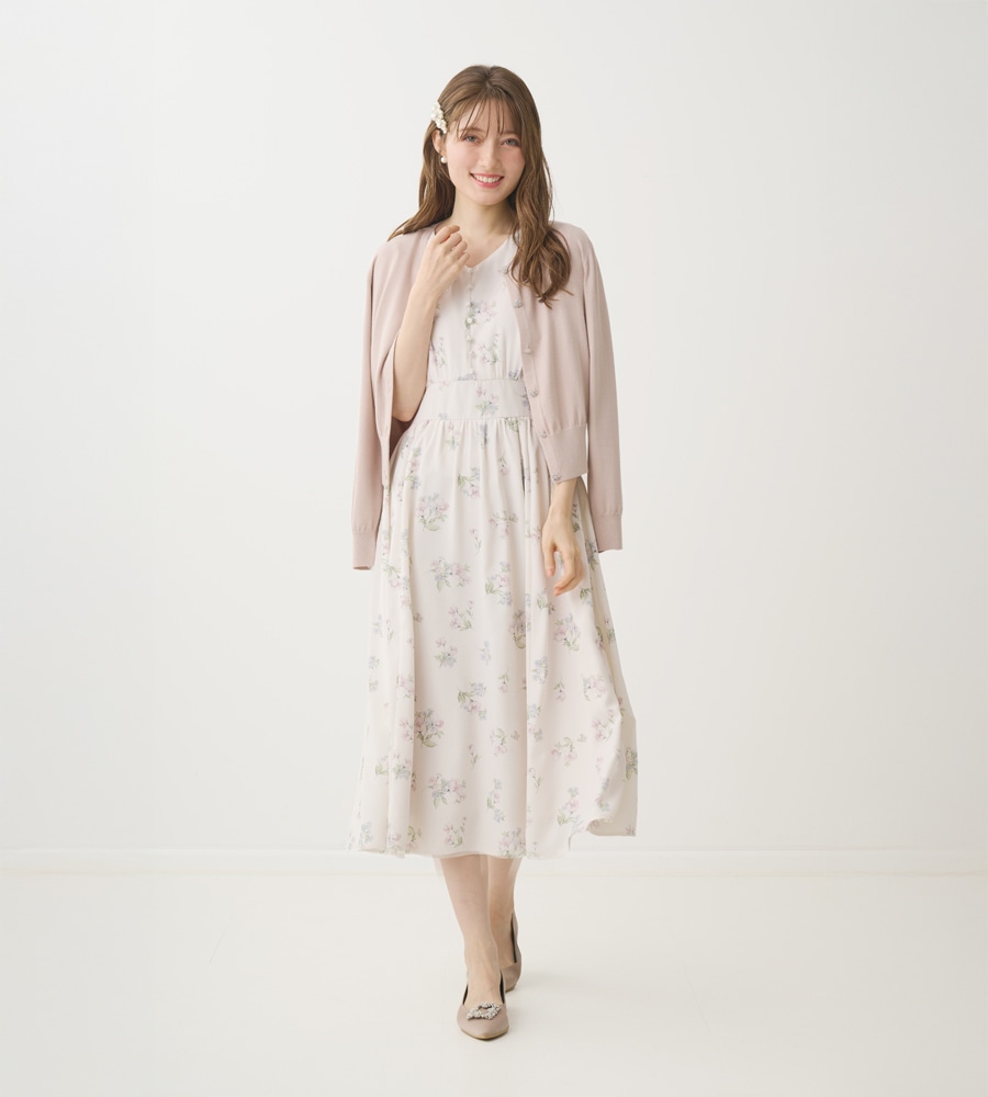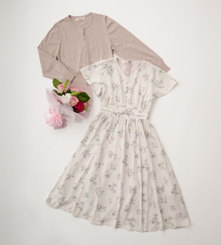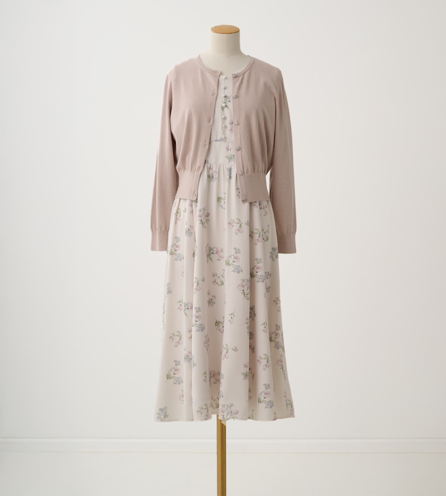 春が待ち遠しくなる、優しい色合いのフラワープリントのワンピースと、肌触りのいい素材を使用した、長袖カーディガンセットの受注予約を開始します。