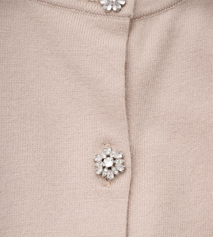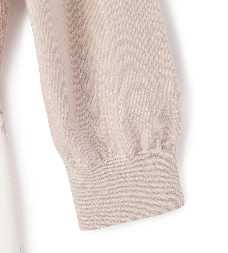 ニットカーディガンは、春先から夏まで着ていただけるレッセ・パッセの定番素材を使用し、プリントのお花に合わせた2種類のフラワービジューボタンをあしらいました。