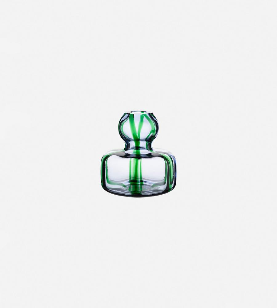 コロンとしたフォルムの手吹きガラスのフラワーベース。透明なガラスにカラーラインのあしらいがスタイリッシュなデザイン。丸みのあるモダンで印象的なシルエットも魅力。花を生けるのにはもちろん、キャンドルフォルダーとしても使える優れもの。インテリアスタイリングのアクセントにぴったりなアイテムです。