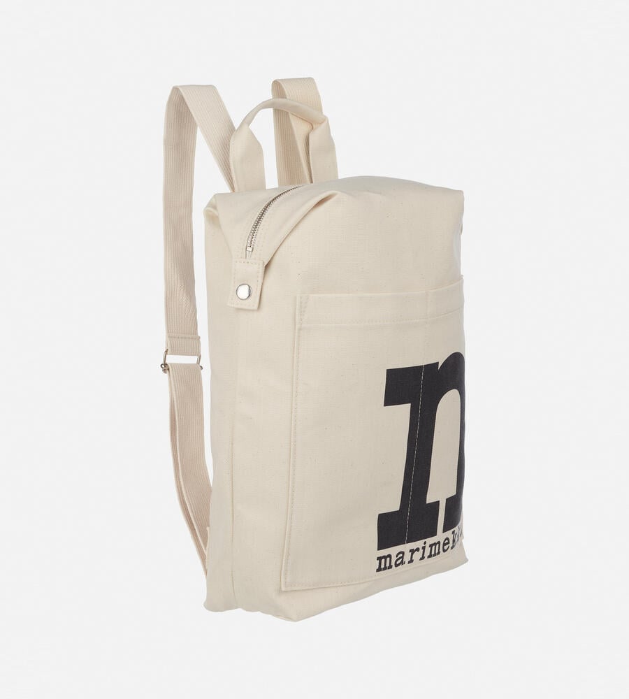 Marimekkoの頭文字を大きくプリントした、スタイリッシュなデザインのバックパック。サイドにスナップボタンをあしらった、スクエア型のフォルムも印象的。ジップ部分にもブランドロゴで細部までこだわりを感じられるデザイン。フロントと内側にポケットを配し、荷物の整理がしやすく使い勝手も抜群のアイテムです。