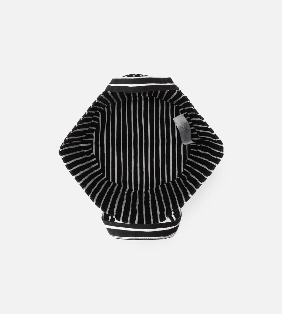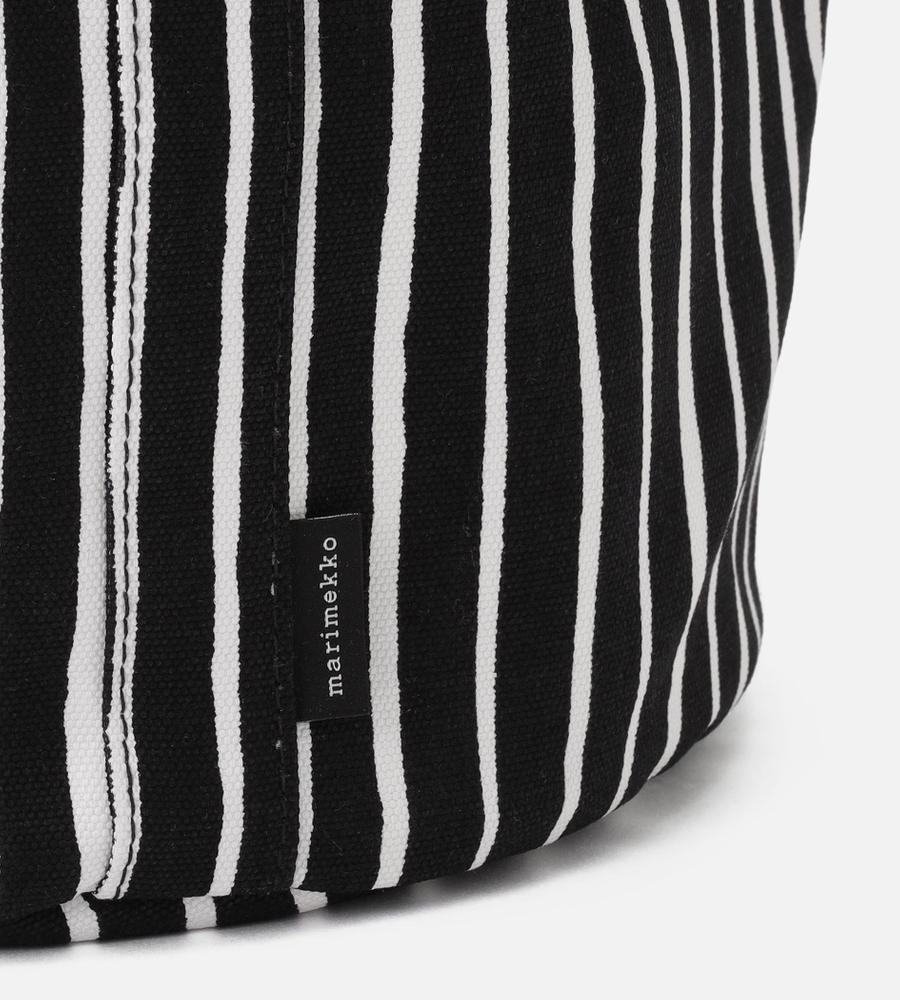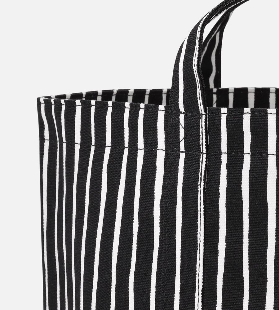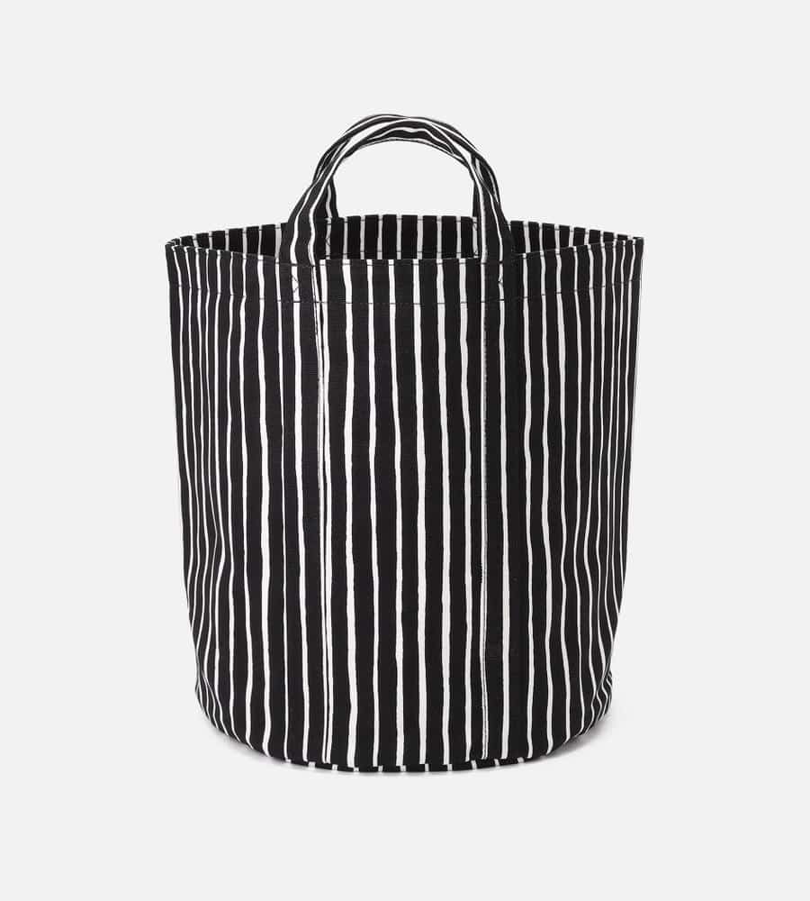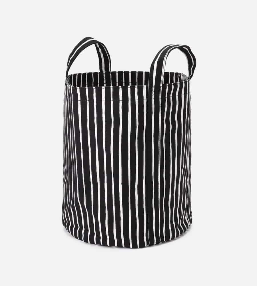 どんな装いにも似合う、スタイリッシュなストライプ柄のコンテナ。深さがあるため、見た目以上に収納力があるのがうれしい。ランドリーバッグとしてなど、お部屋にさりげなく置いておいても絵になるアイテムです。