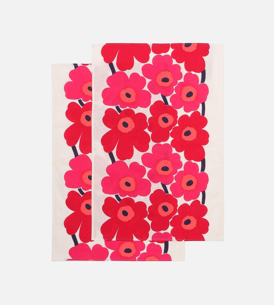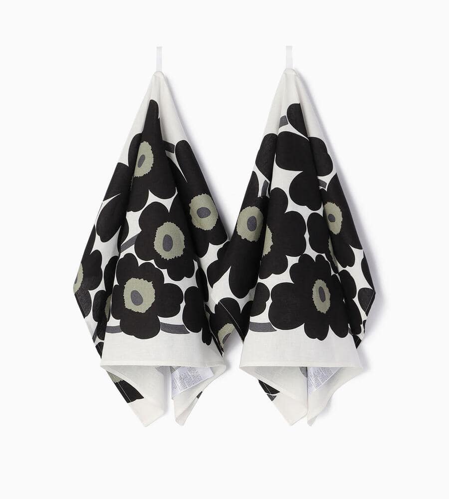 花をモチーフにしたUnikko(ウニッコ)柄のティータオルセット。毎日使うものだからこそ、2枚備えておくと重宝します。さらりとした風合い、薄手で扱いやすいのもポイント。フックに掛けられるループ付き。華やかさと実用性を兼ね備えたアイテムは、ギフトとしてもおすすめです。