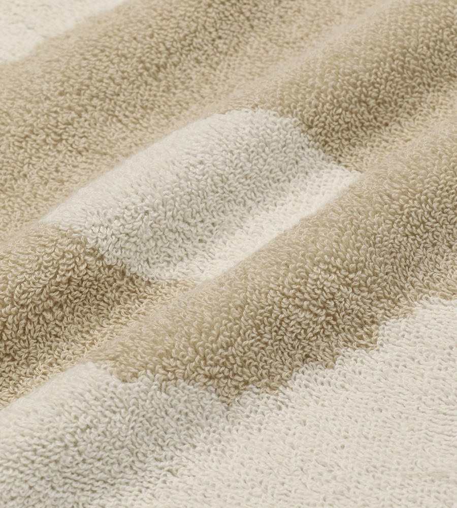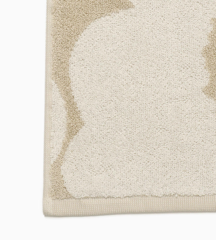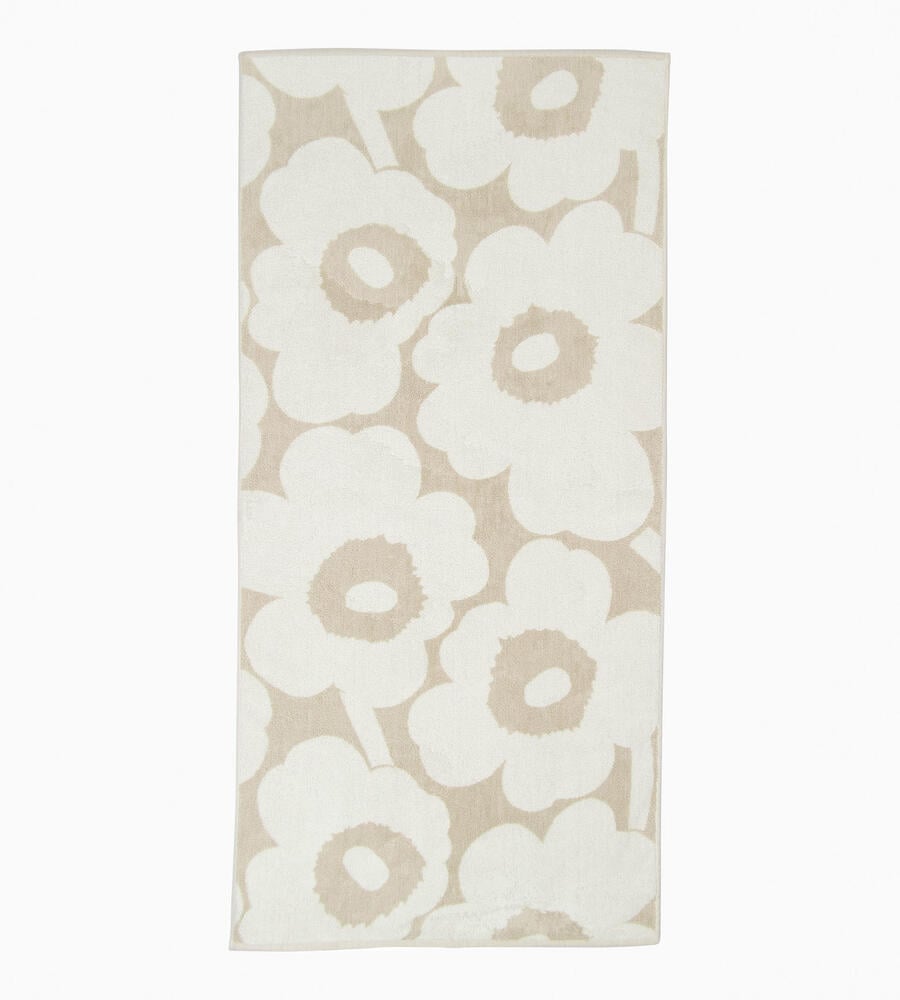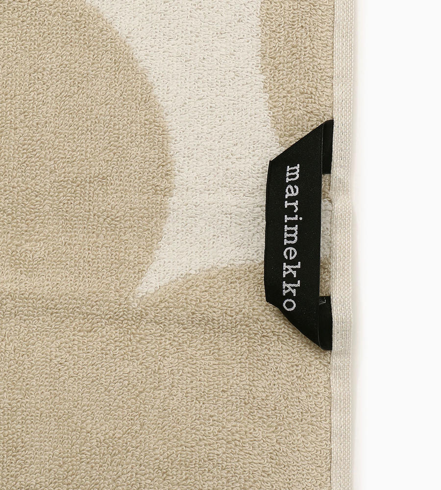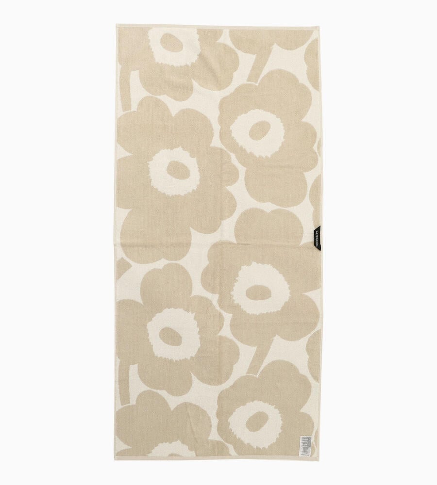 花をモチーフにしたUnikko柄をエレガントなベージュで仕上げたバスタオル。柔らかなコットン素材は使い心地も抜群。裏面中央にはブランドロゴ入りのループ付き。
