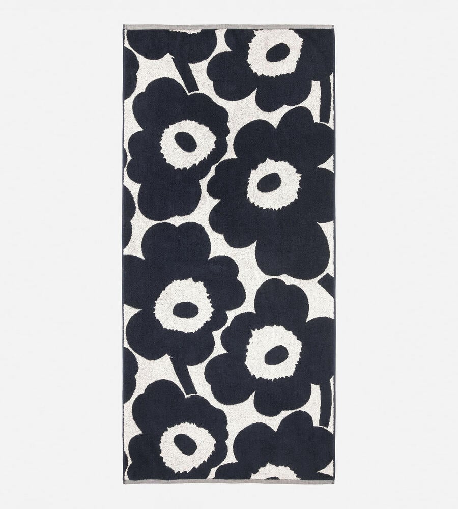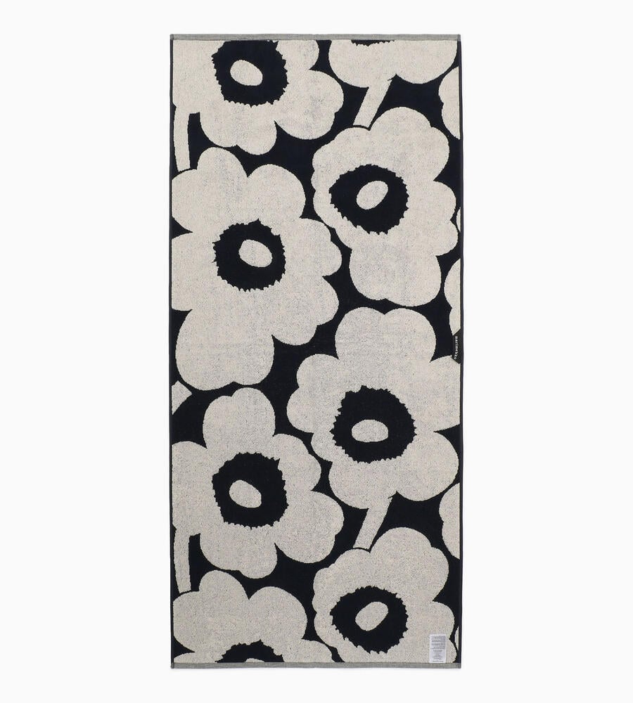 花をモチーフにしたUnikko (ウニッコ)柄をシックなカラーコンビで落ち着いた印象に仕上げたバスタオル。コットンと麻のブレンド素材を採用。裏面にはブランドロゴ入りのループが付いており、フックに掛けられる便利な仕様となっています。