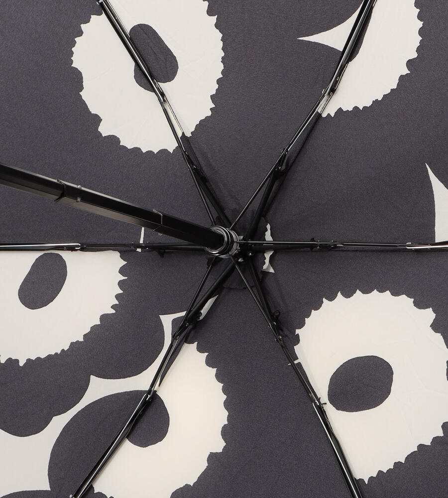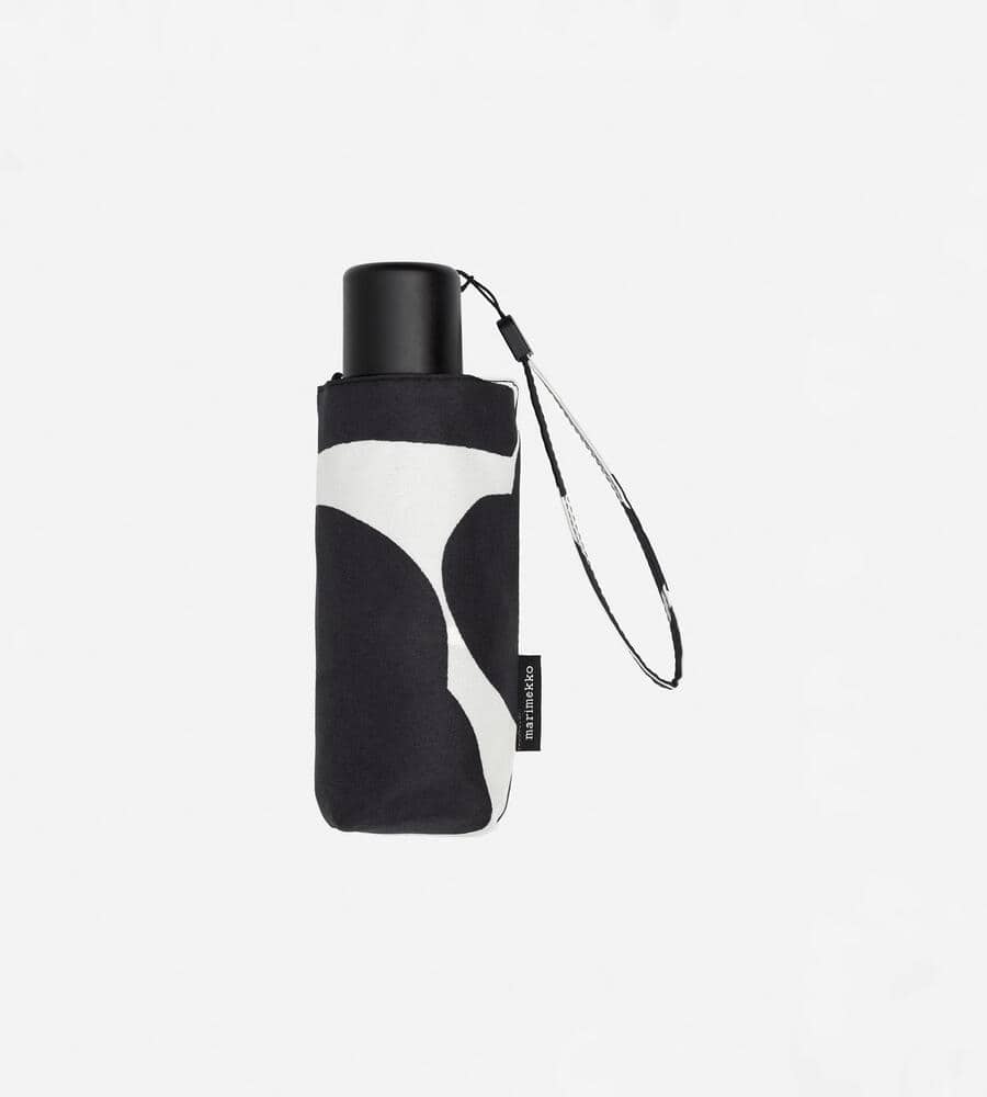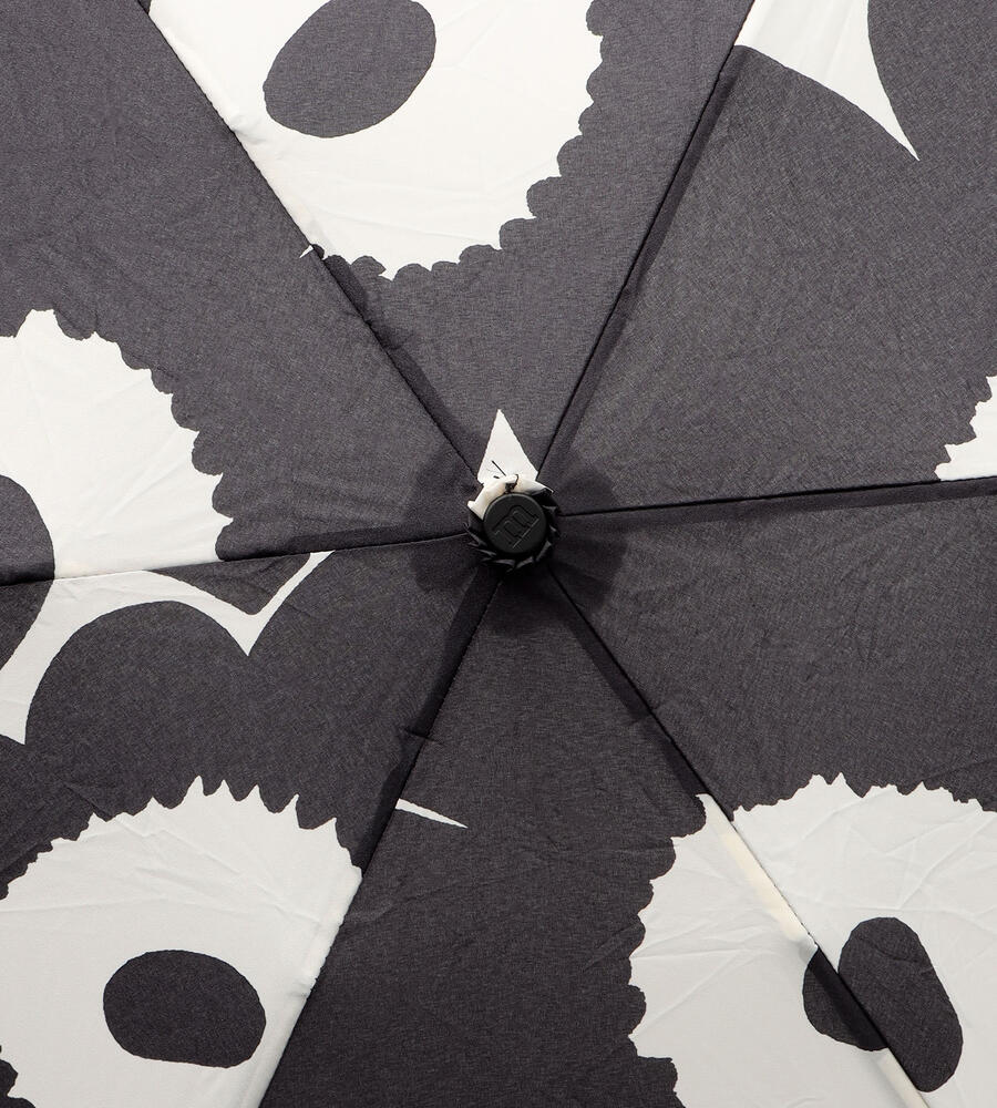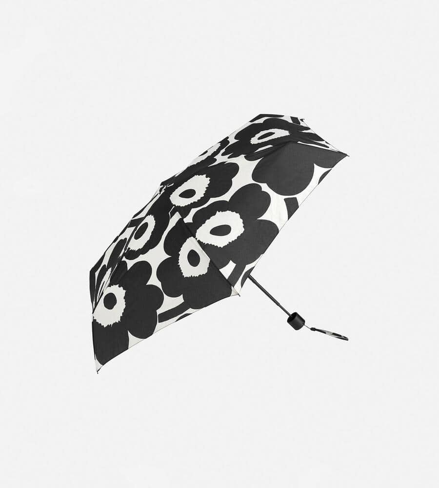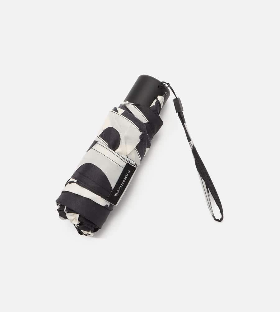 マリメッコを象徴するウニッコ柄の折りたたみ傘。モノトーンカラーでどんな装いにも馴染み、大きな花のプリントが雨の日の気分を晴れやかにしてくれそうなアイテムです。くるっとまとめやすい太めのベルト、バッグに入れて携帯しやすい軽量コンパクトなサイズなど機能面も優秀。同柄の専用カバー付きです。