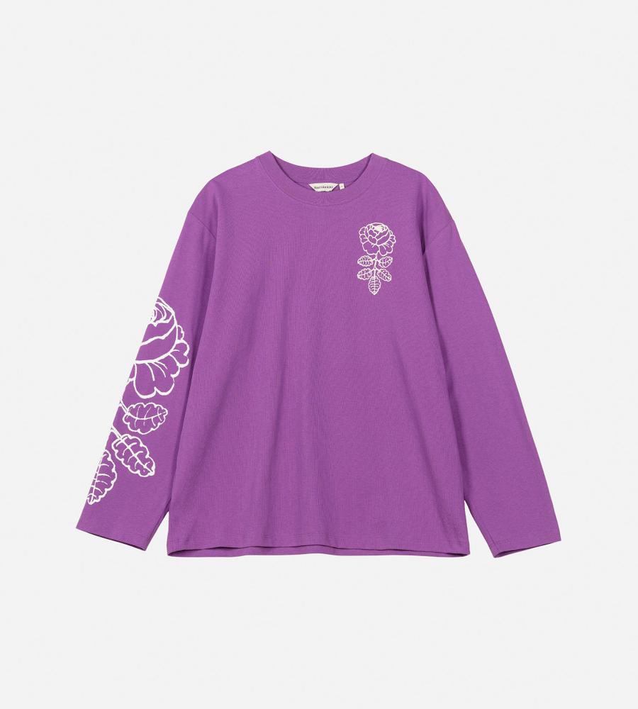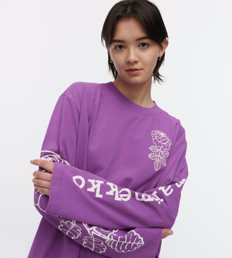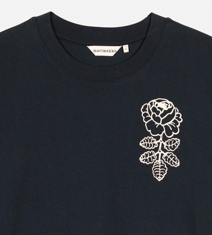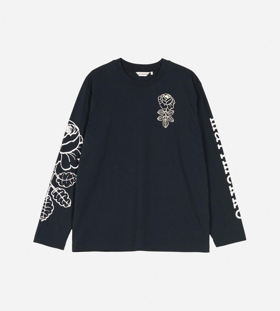 胸元とスリーブの花柄使いが可愛いカットソー。シンプルなワンツーコーデも、存在感ある仕上がりに。裾をボトムインすることで、雰囲気を変えてスタイリングを楽しめます。