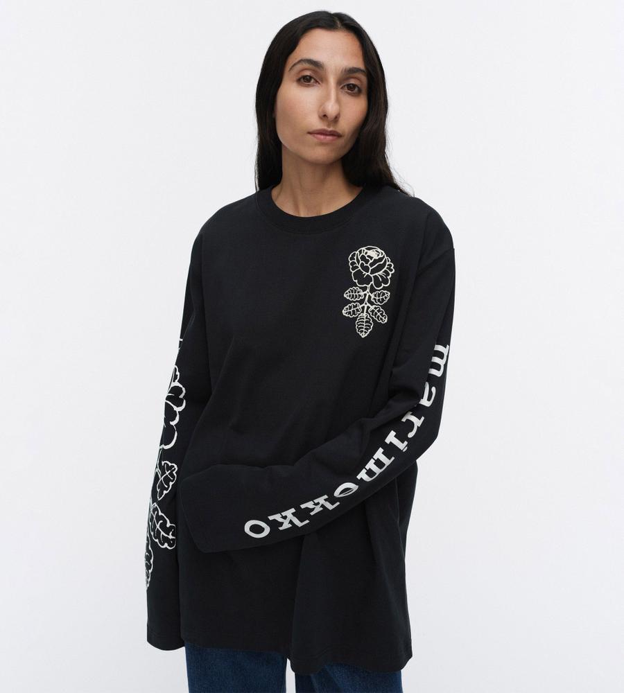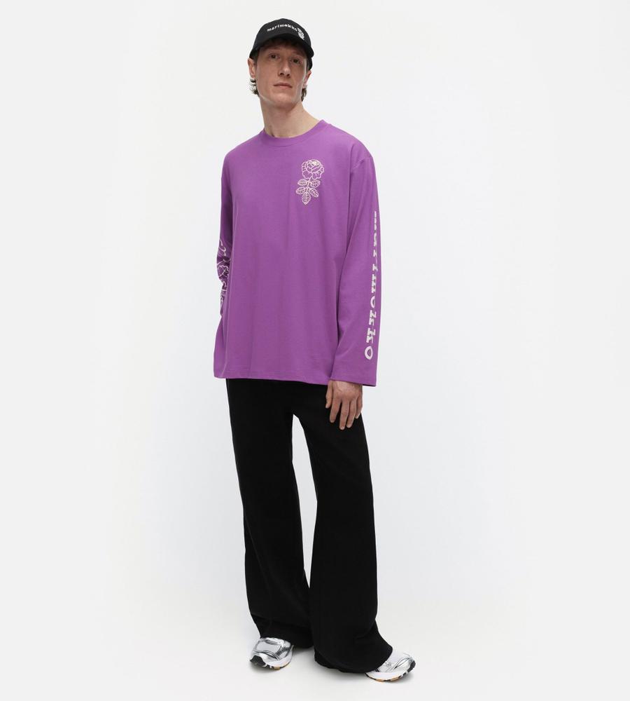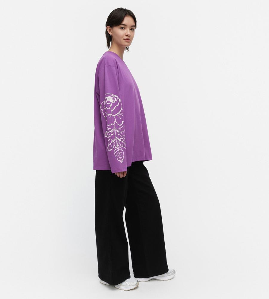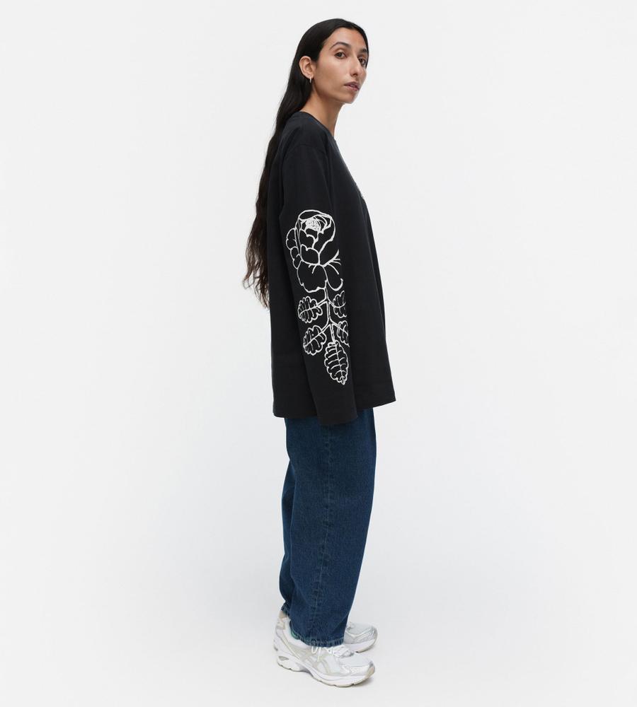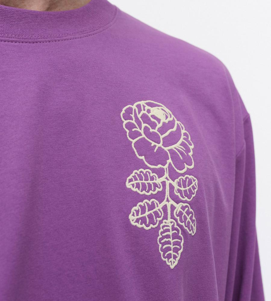 胸元とスリーブの花柄使いが可愛いカットソー。シンプルなワンツーコーデも、存在感ある仕上がりに。裾をボトムインすることで、雰囲気を変えてスタイリングを楽しめます。