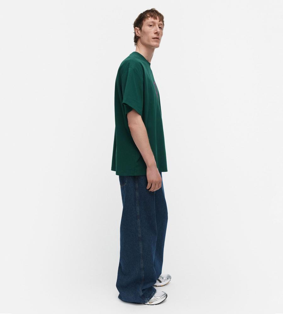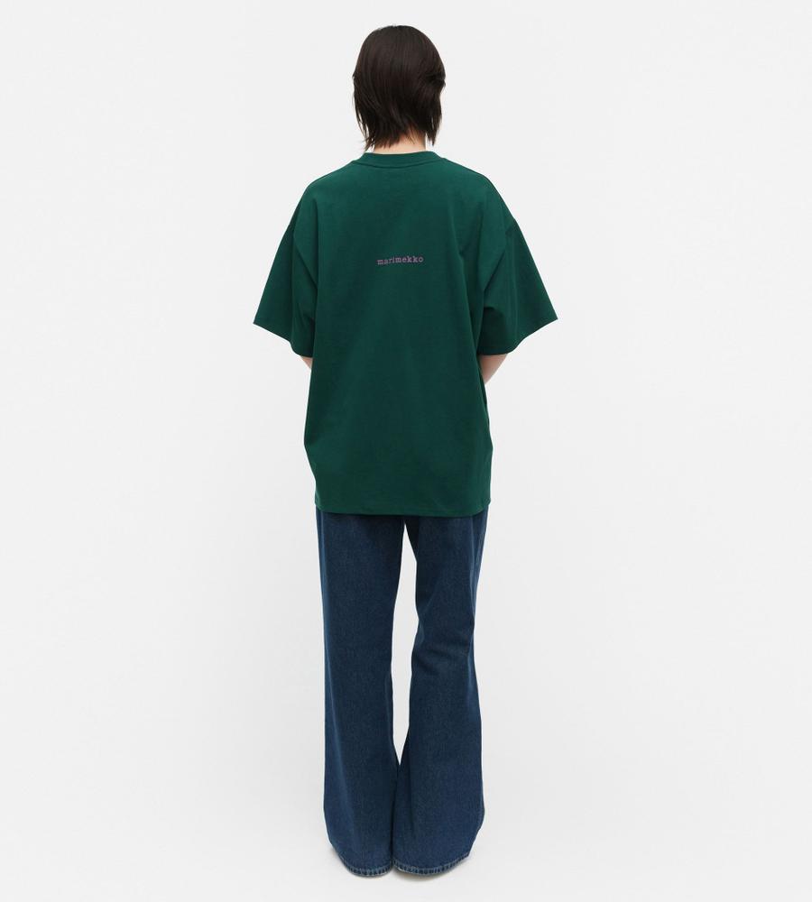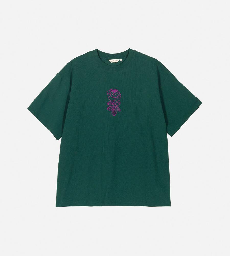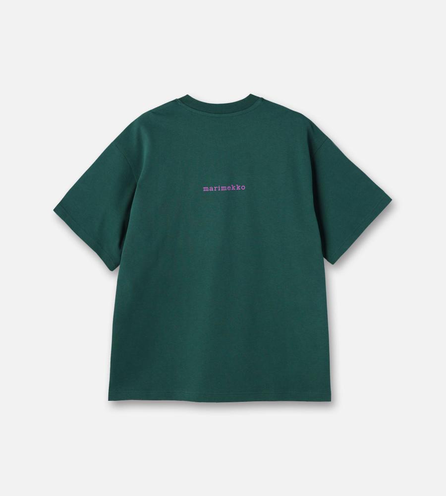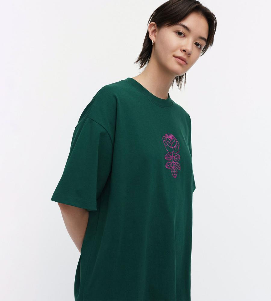 モードカジュアルを楽しみたい日にぴったりのTシャツ。前後ともにワンポイント効かせているため、さりげない自分らしさのある着こなしを演出できます。肩の落ちるシルエットは、リラックスして過ごしたい日にもおすすめです。