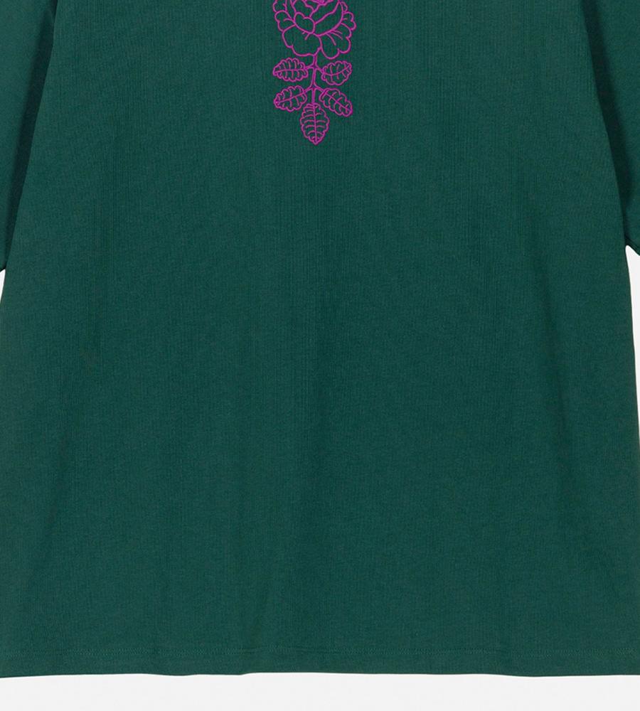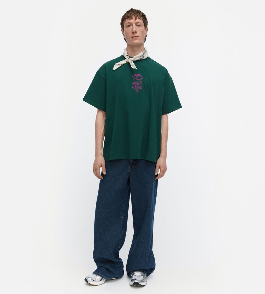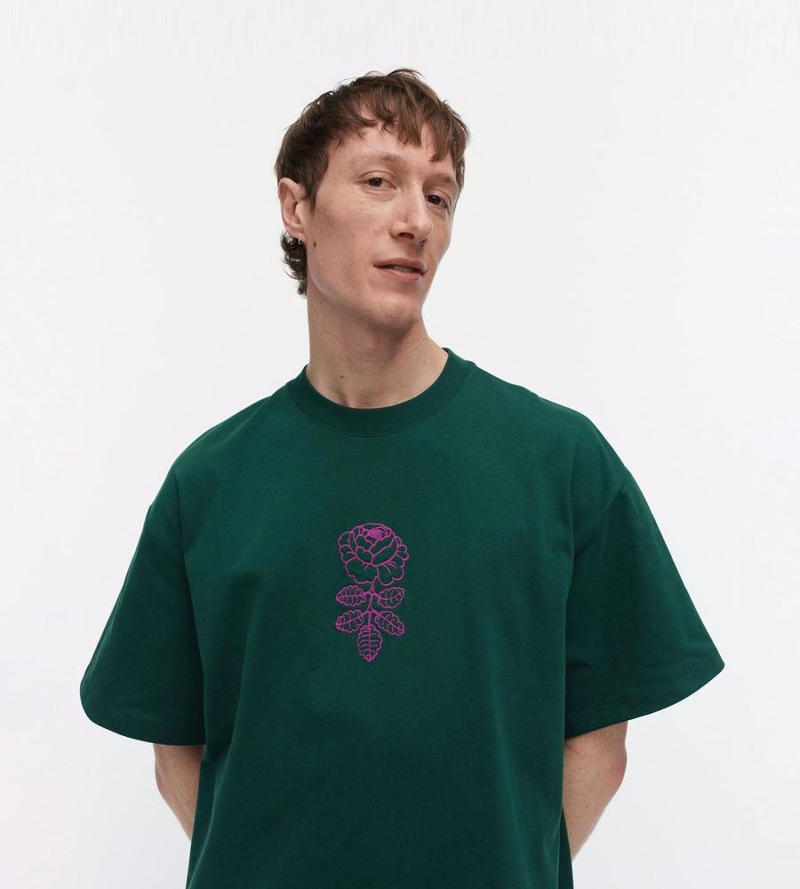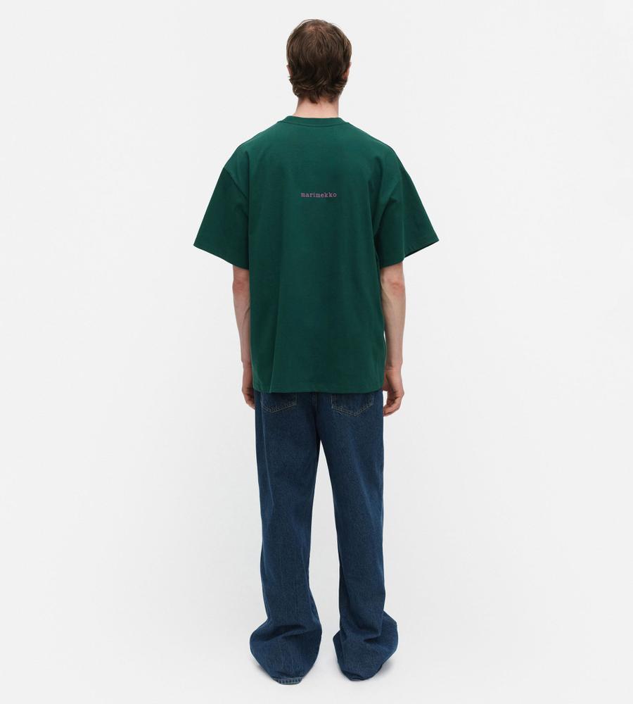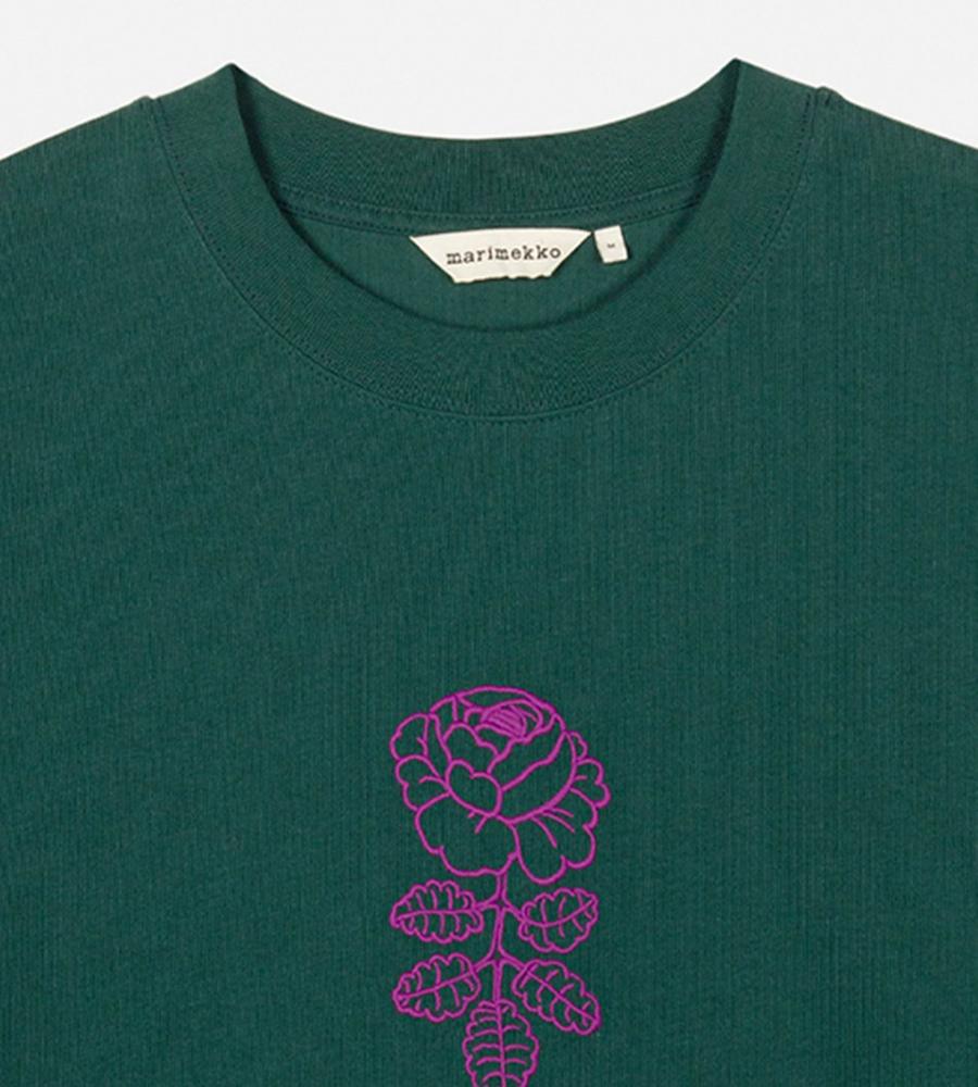 モードカジュアルを楽しみたい日にぴったりのTシャツ。前後ともにワンポイント効かせているため、さりげない自分らしさのある着こなしを演出できます。肩の落ちるシルエットは、リラックスして過ごしたい日にもおすすめです。