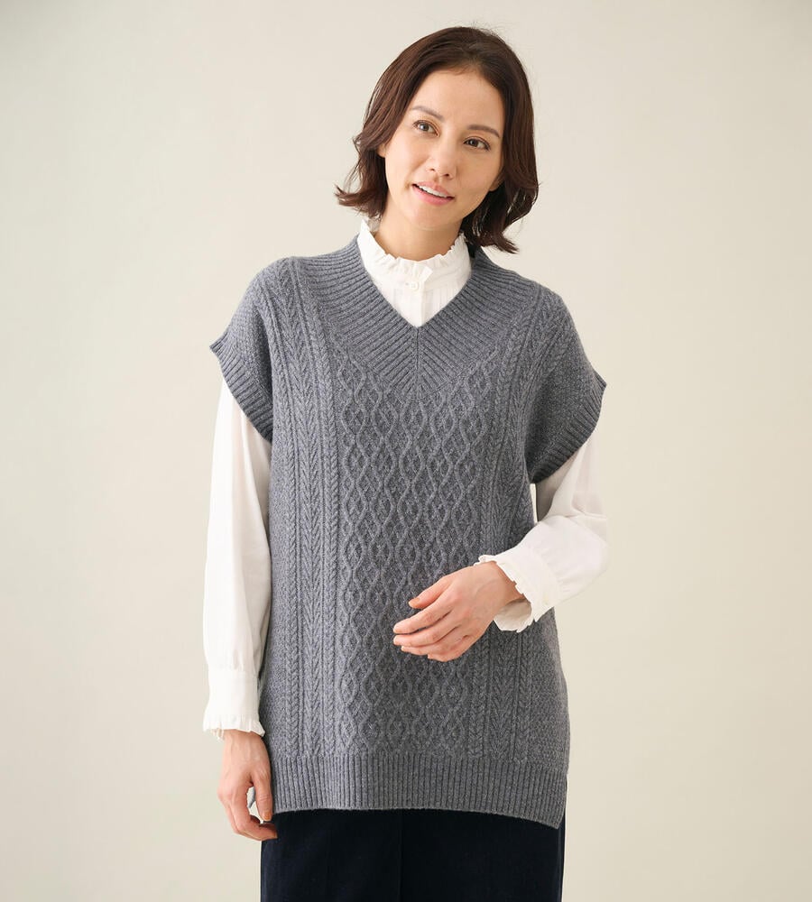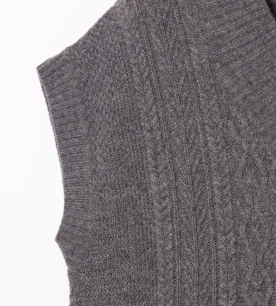 ゆったりシルエットがモダンなニットベスト。さまざまなパターンのケーブル編みをミックスした、表情豊かな一枚です。肩幅を取っているため、個人差のでやすい肩のラインが気にならないのもポイント。裾は大胆なサイドスリット入りです。襟付きシャツやタートルネックシャツなど、あらゆるトップスに重ねてレイヤードを楽しめます。