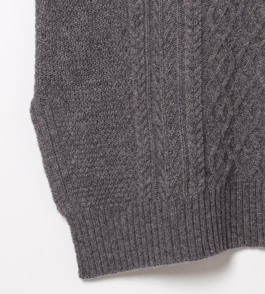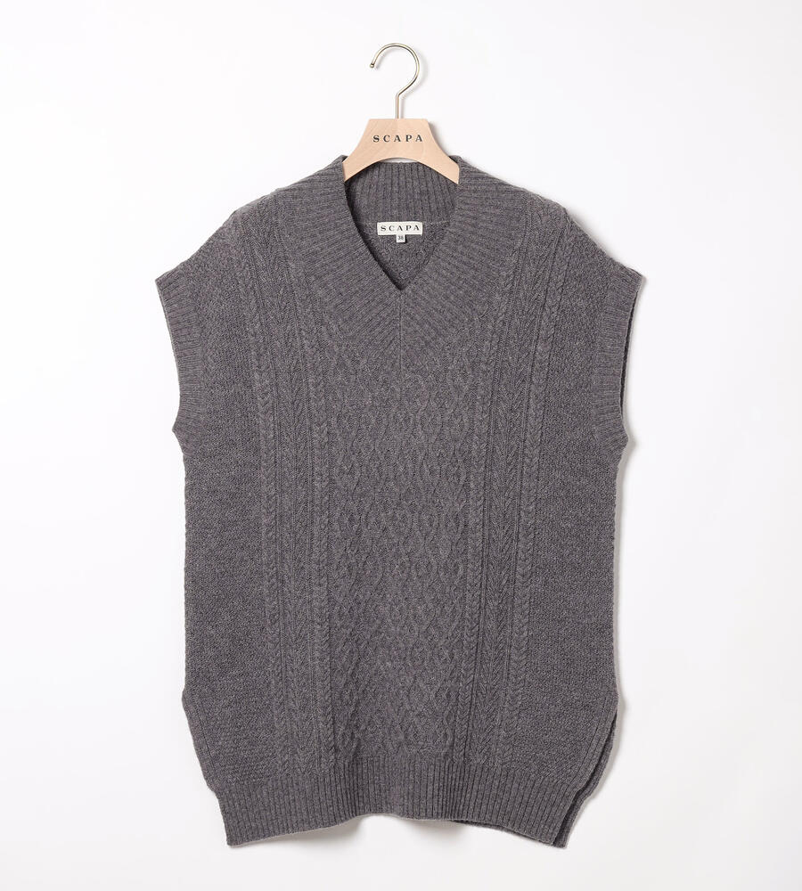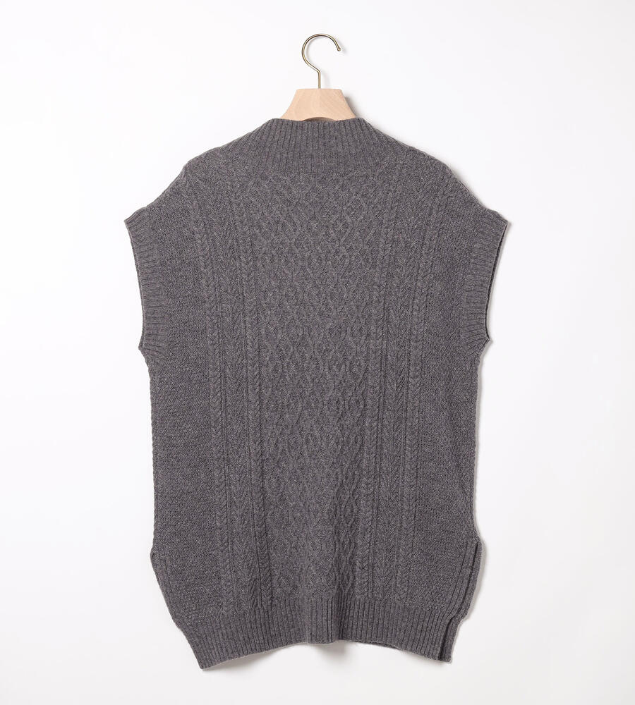 ゆったりシルエットがモダンなニットベスト。さまざまなパターンのケーブル編みをミックスした、表情豊かな一枚です。肩幅を取っているため、個人差のでやすい肩のラインが気にならないのもポイント。裾は大胆なサイドスリット入りです。襟付きシャツやタートルネックシャツなど、あらゆるトップスに重ねてレイヤードを楽しめます。