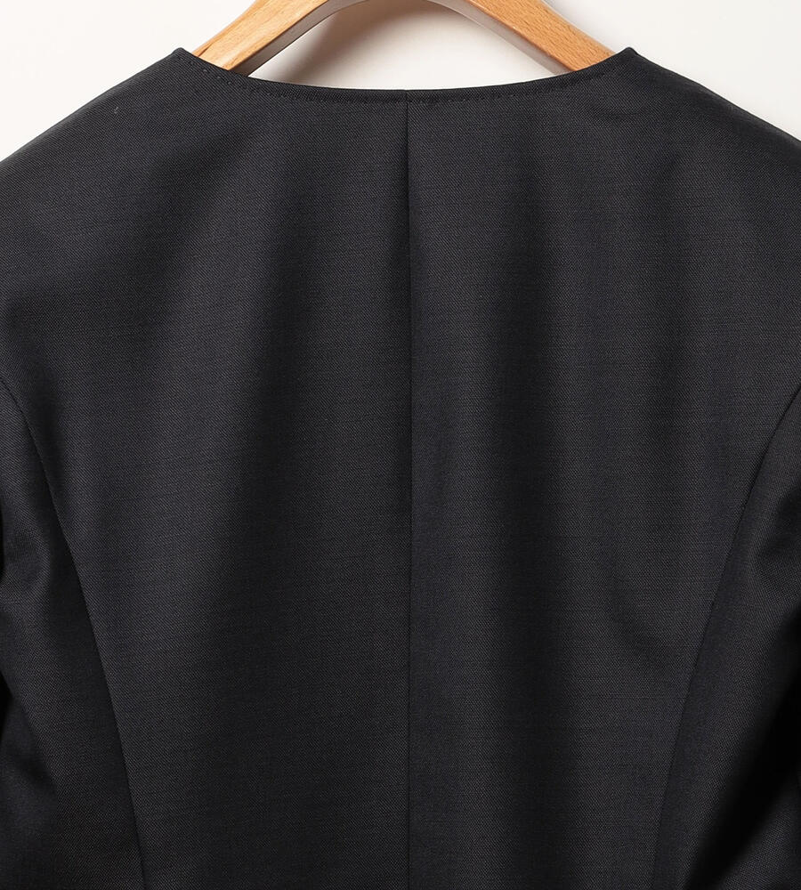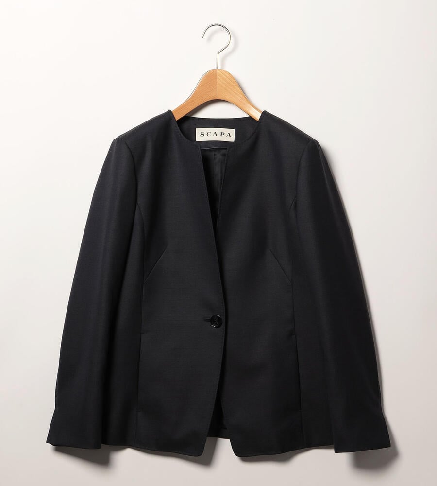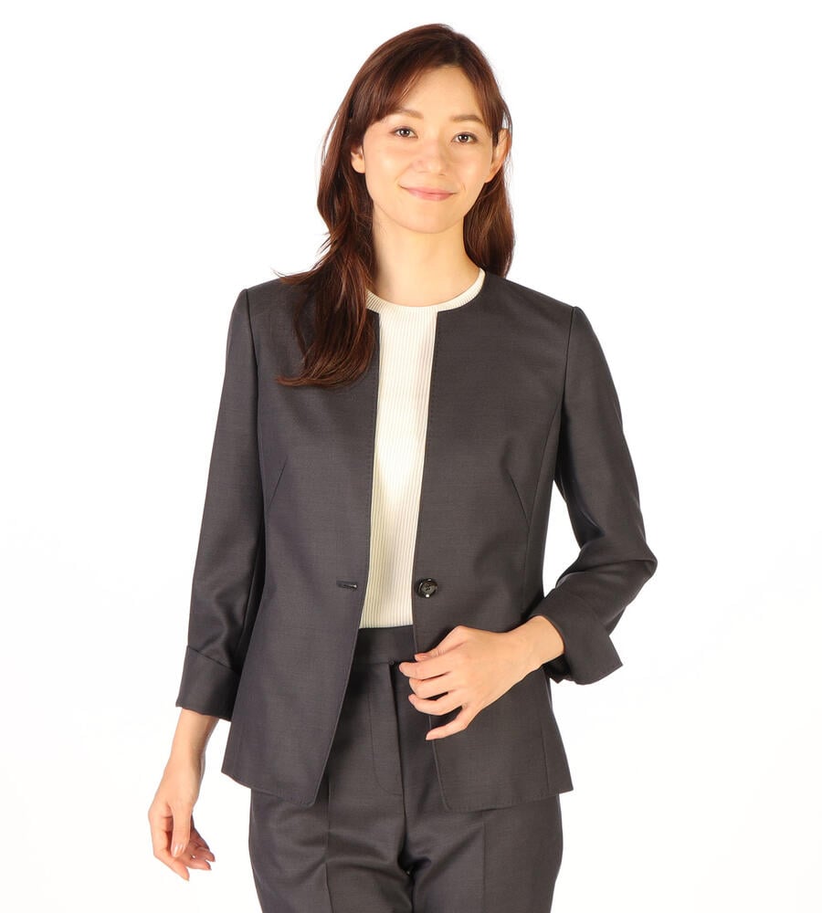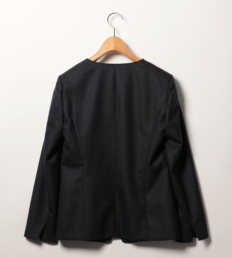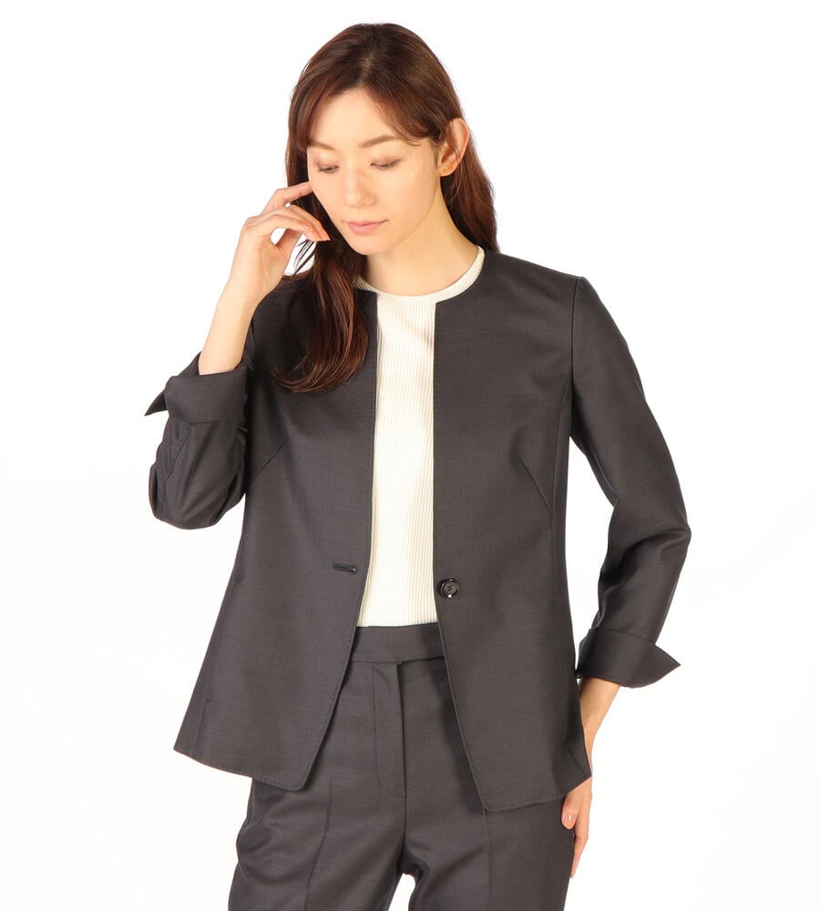 風合いとハリ感のあるウールシャンブレー生地で仕立てた、シックな雰囲気のジャケット。襟のないノーカラーのスッキリしたシルエットで様々なトップスと好相性。袖口はスリット入りで、折り返してスタイリッシュに着こなせます。一つボタンのシンプルなデザインで、お手持ちのボトムと合わせてエレガントな着こなしが実現します。