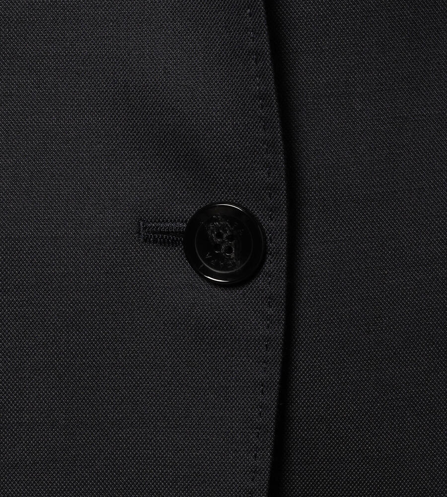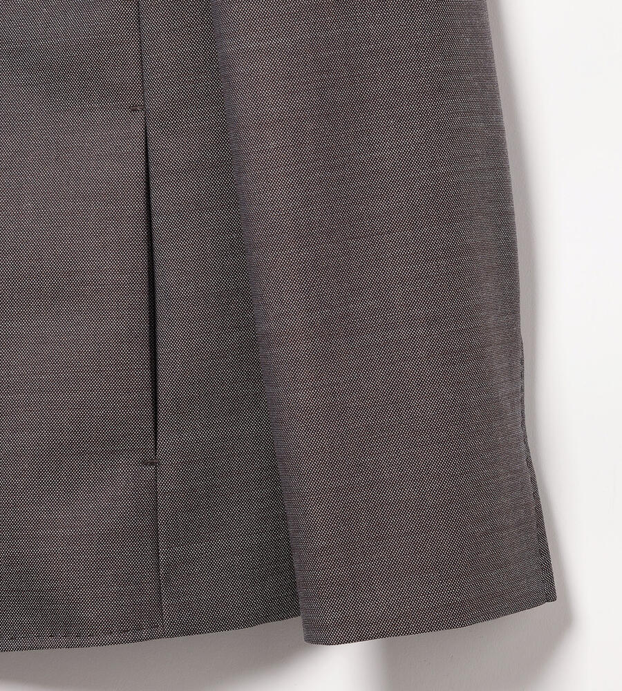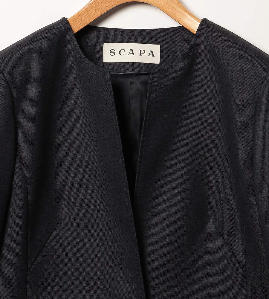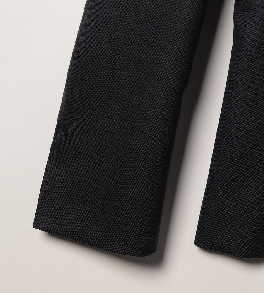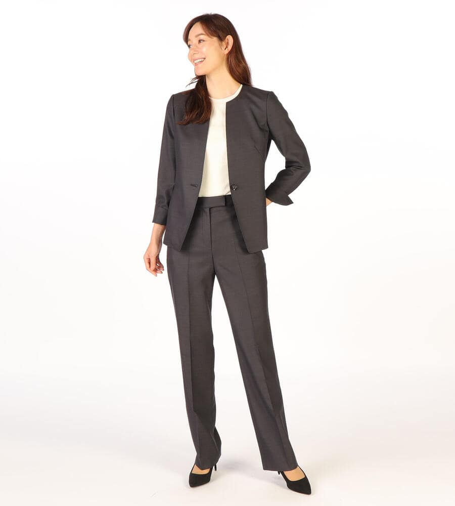 風合いとハリ感のあるウールシャンブレー生地で仕立てた、シックな雰囲気のジャケット。襟のないノーカラーのスッキリしたシルエットで様々なトップスと好相性。袖口はスリット入りで、折り返してスタイリッシュに着こなせます。一つボタンのシンプルなデザインで、お手持ちのボトムと合わせてエレガントな着こなしが実現します。