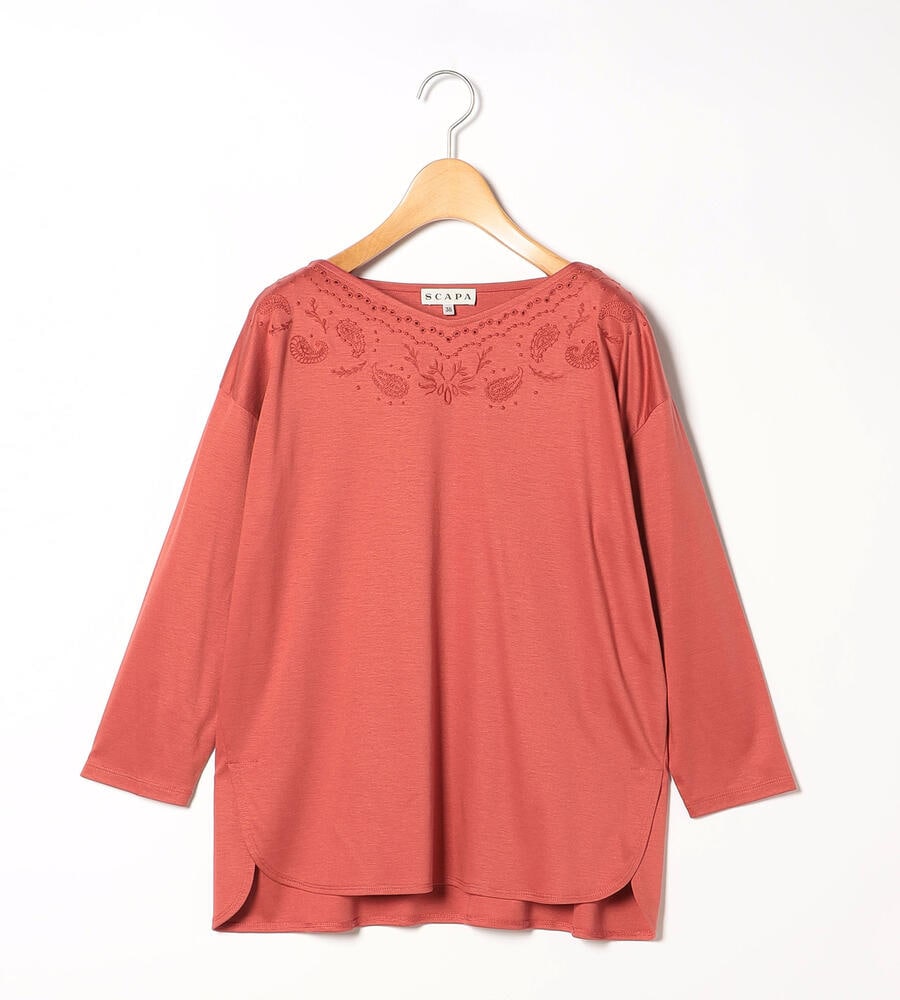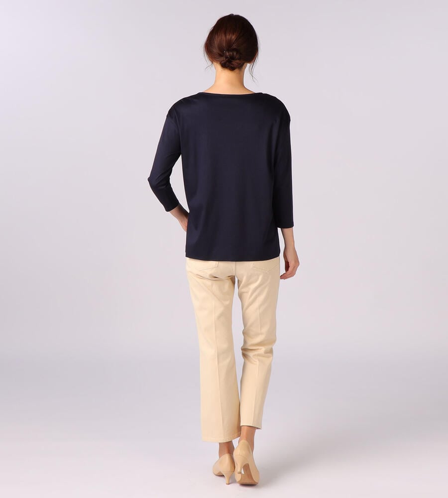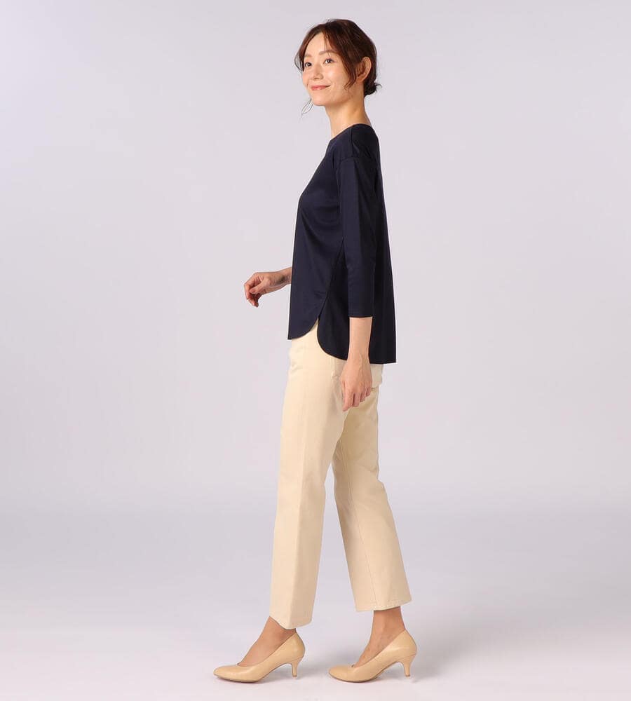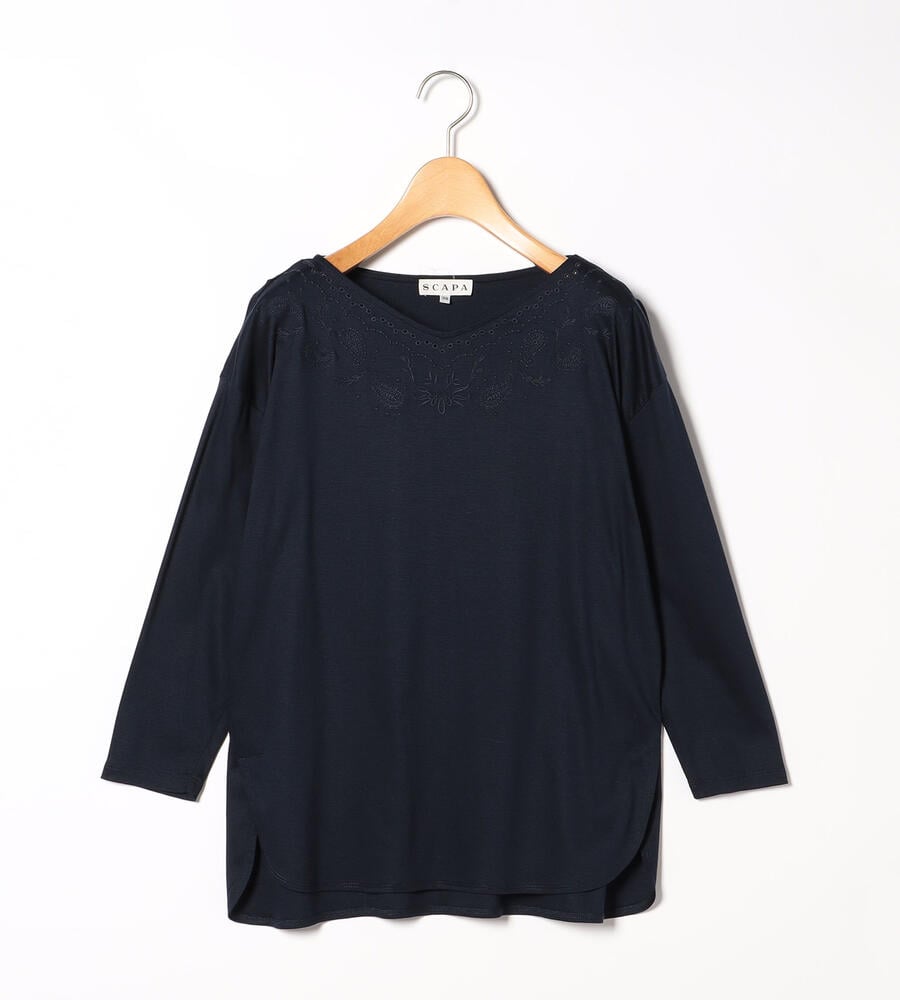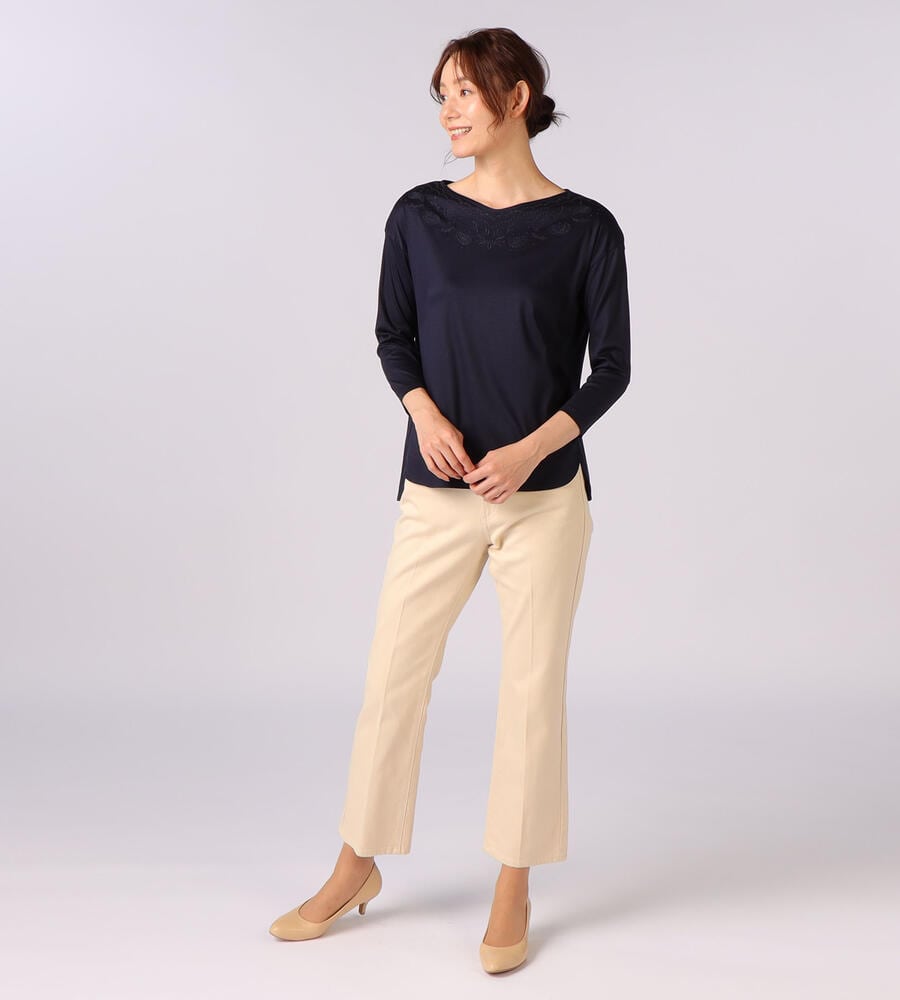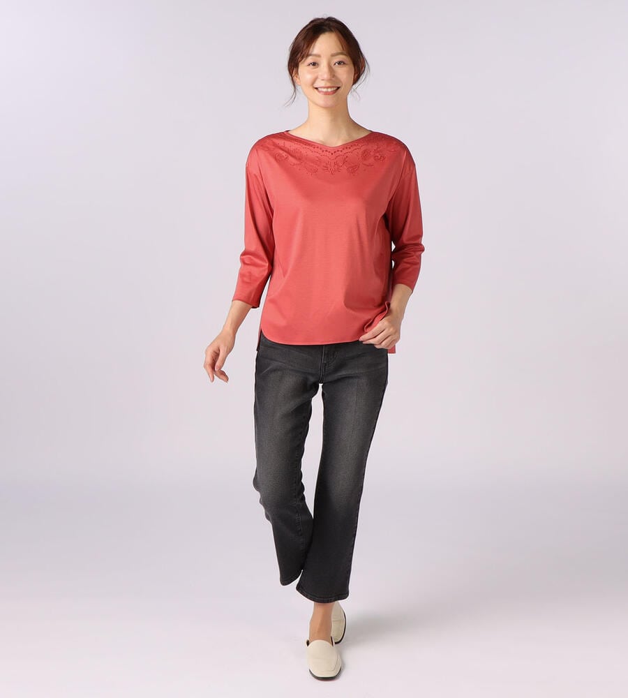 エンブロイダリー刺繍やアイレットを首元に配した七分袖カットソー。ほんのり微光沢感のあるスムース生地で、カジュアルになり過ぎないのが魅力です。シルエットは適度なゆとりがあり、丸みを帯びたサイドスリットやドロップショルダーが今季らしい印象。デニムにもスカートにも相性がよく、汎用性も抜群です。