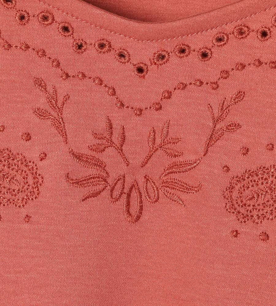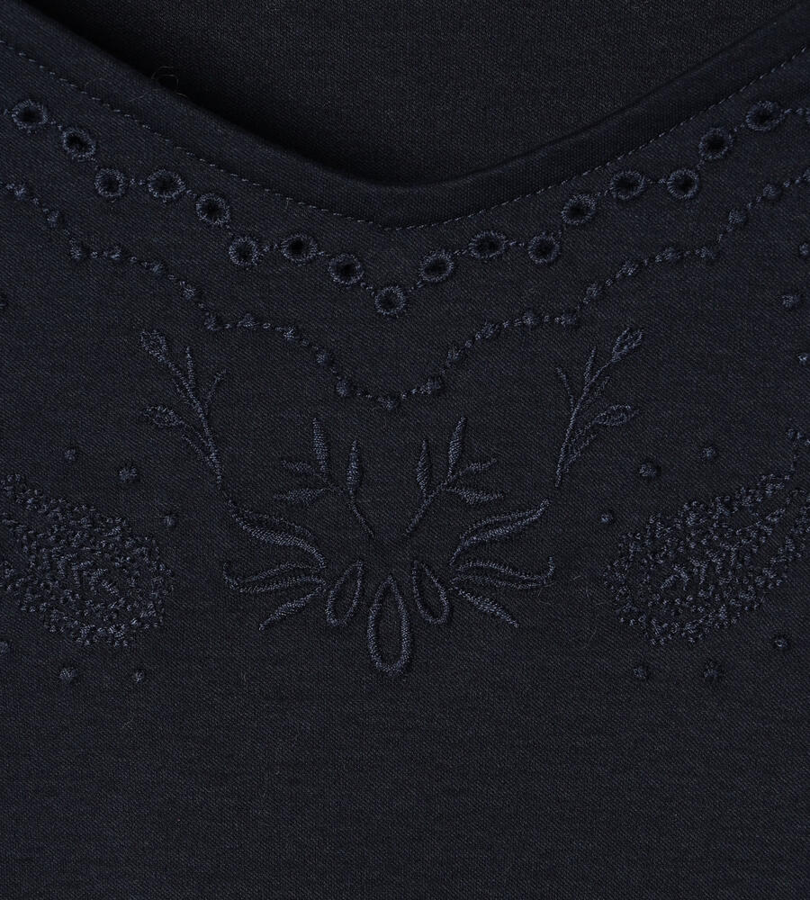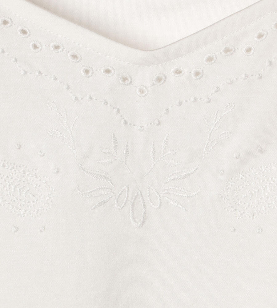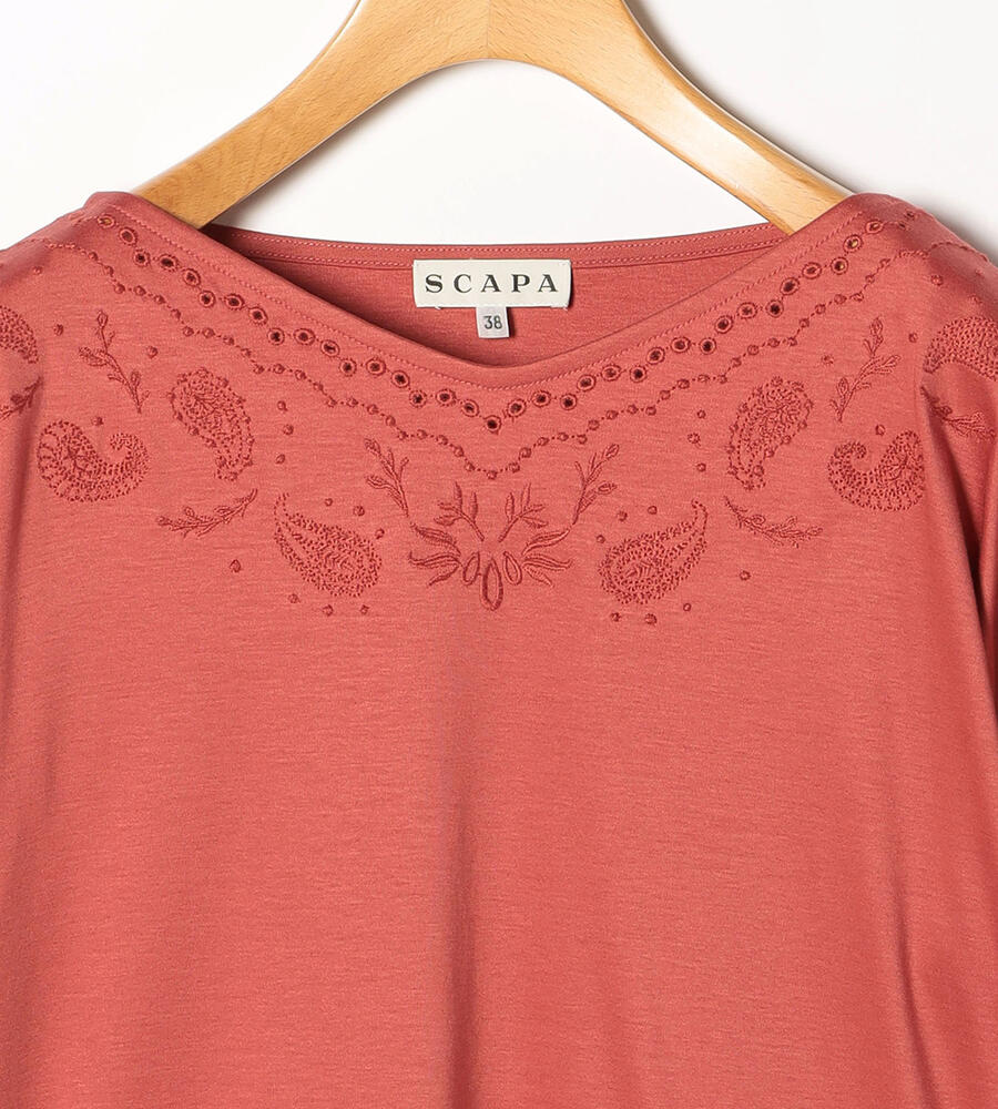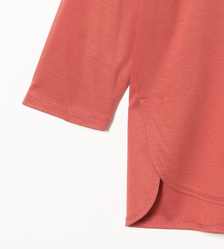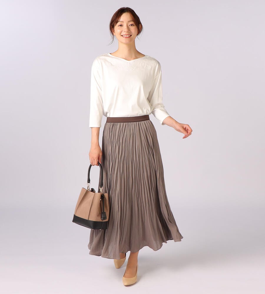 エンブロイダリー刺繍やアイレットを首元に配した七分袖カットソー。ほんのり微光沢感のあるスムース生地で、カジュアルになり過ぎないのが魅力です。シルエットは適度なゆとりがあり、丸みを帯びたサイドスリットやドロップショルダーが今季らしい印象。デニムにもスカートにも相性がよく、汎用性も抜群です。