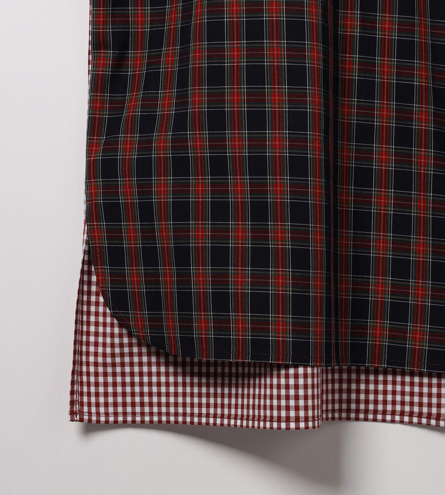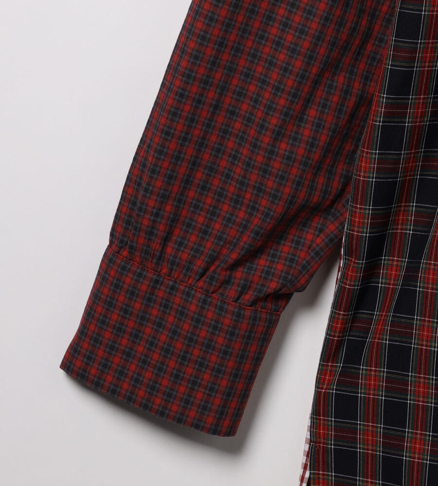 ネック下のギャザーにより、ふわっとした愛らしいシルエットに仕上がった前開きの長袖シャツ。さまざまなチェック柄を組み合わせた、クレイジーパターンのパッチワークデザインとなっています。トラッドなエッセンスを効かせつつ、まるでスリープウェアのようなリラックス感もあって、一枚でしっかりと主張を放つアイテムです。軽いコットン素材で快適に着用できます。