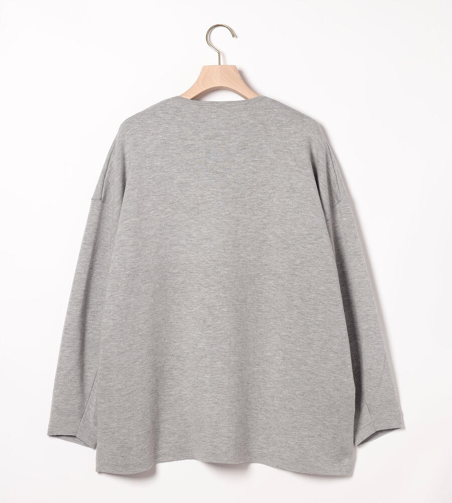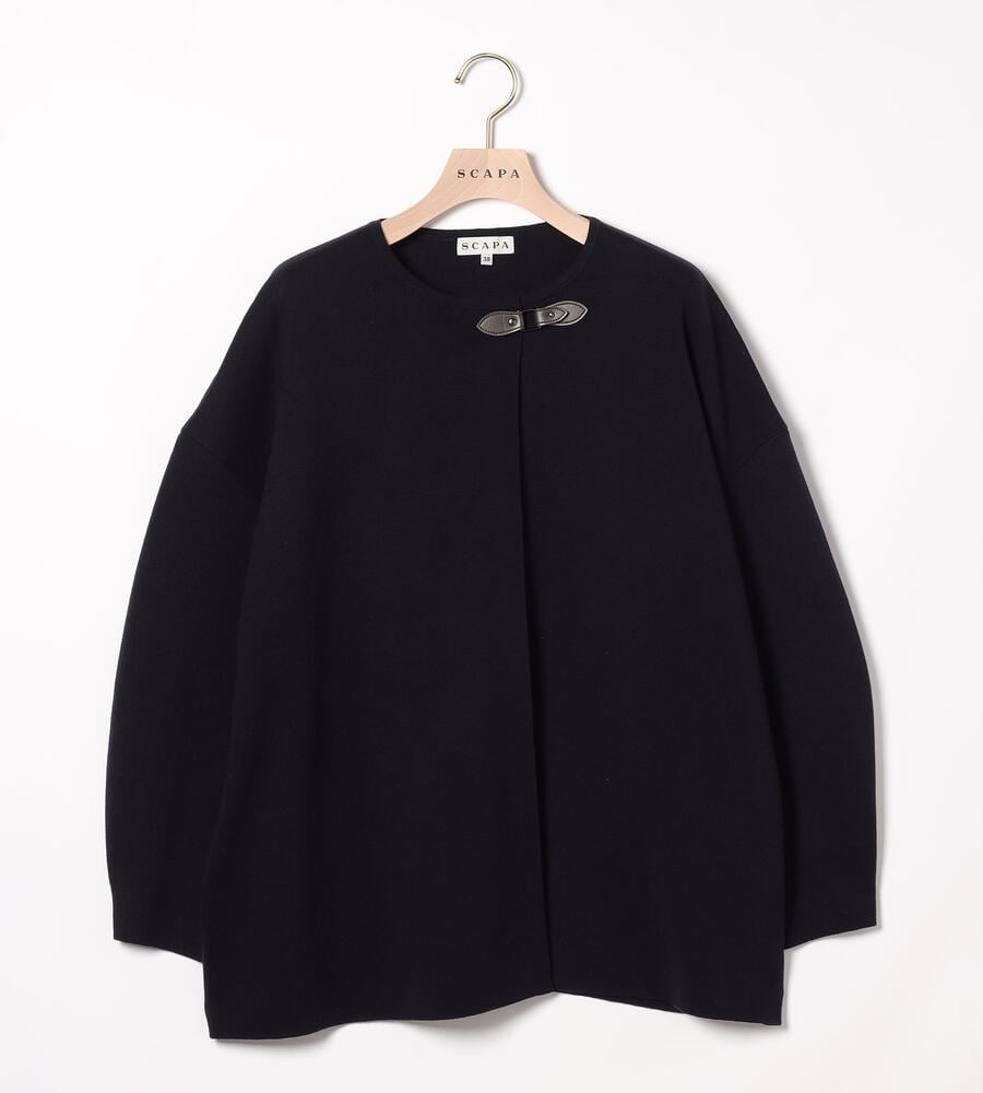 秋冬シーズンのコーディネートで重宝する長袖ニットジャケット。ノーカラーのすっきりとした首周りで様々なトップスと好相性。首元のレザー風ミニベルトの留め具がスタイリッシュなデザインアクセント。ゆとりのあるシルエットと袖も今年らしいポイント。シンプルなデザインで様々な着こなしにマッチするアイテムです。