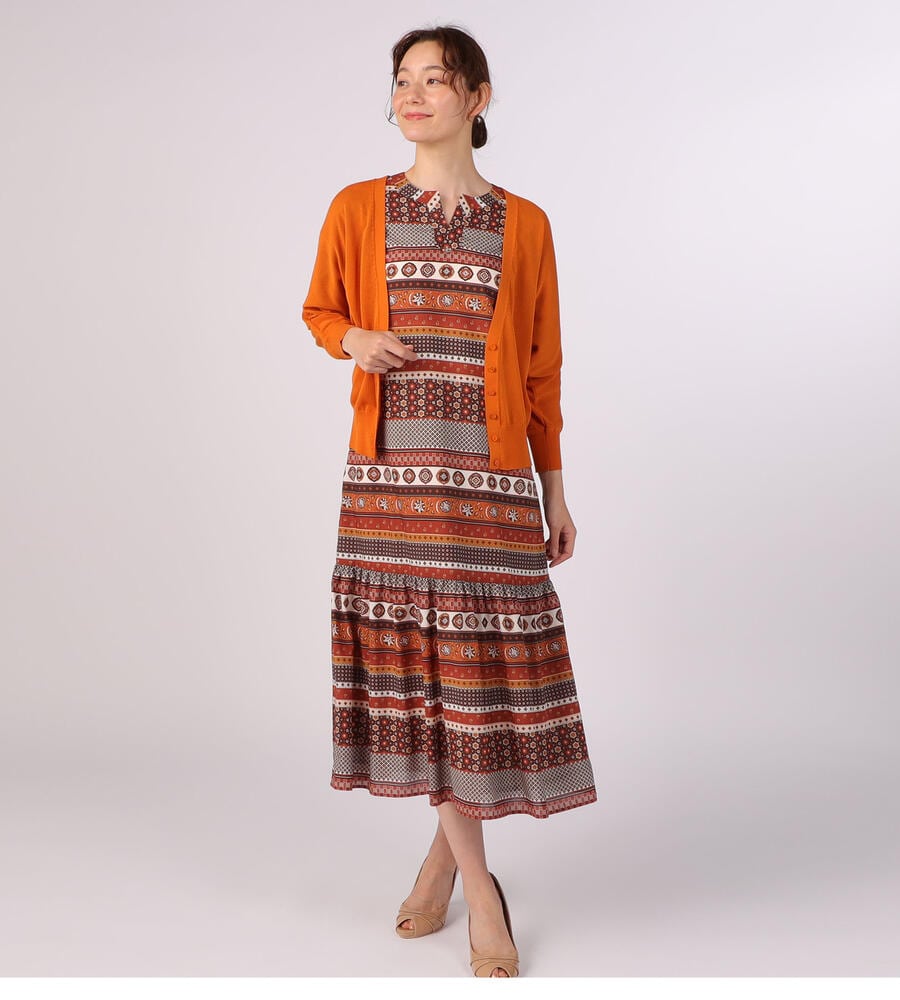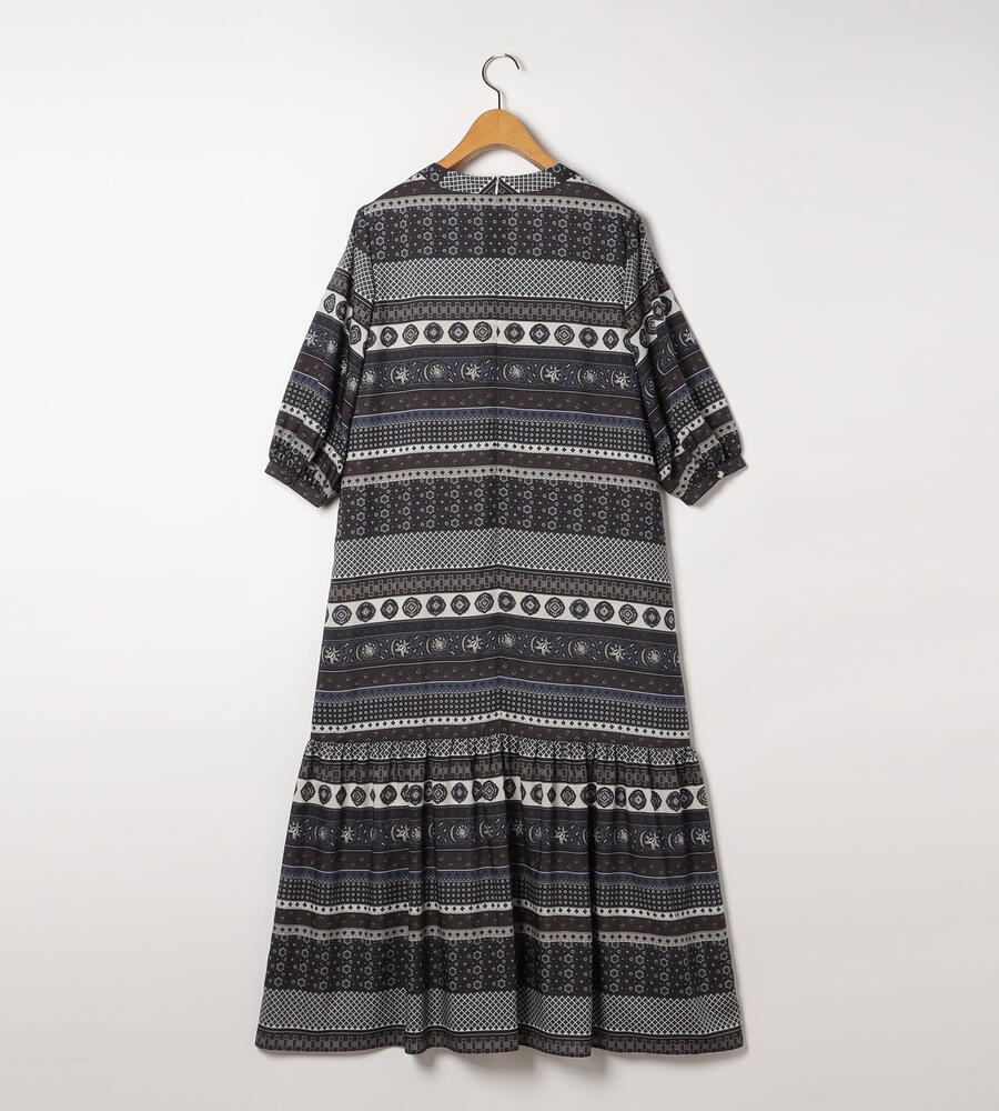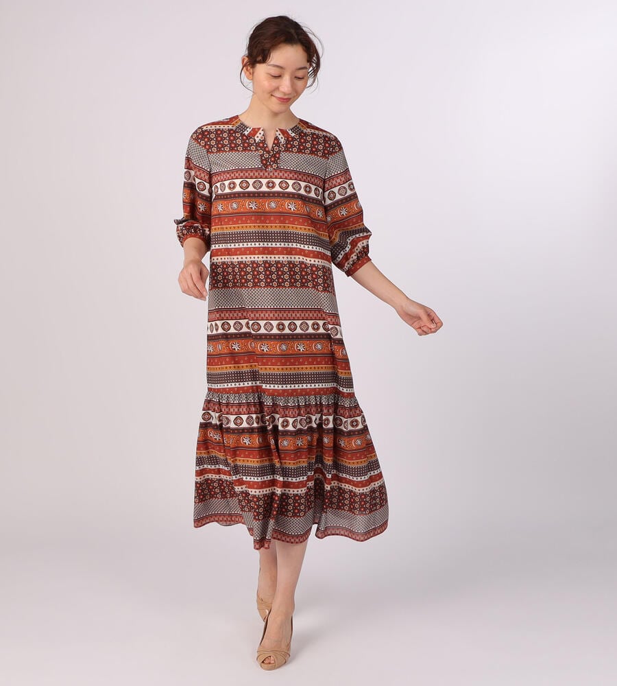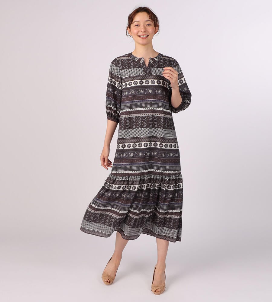 個性的な小紋柄をボーダーに並べた、存在感たっぷりの被りワンピース。女性らしさたっぷりの長め丈は、動くたびに花びらのように揺れ動くシルエットが魅力です。ボリュームを感じる裾広がりのラインとすっきりとしたネックラインで、バランスの取れた1枚に仕上がりました。