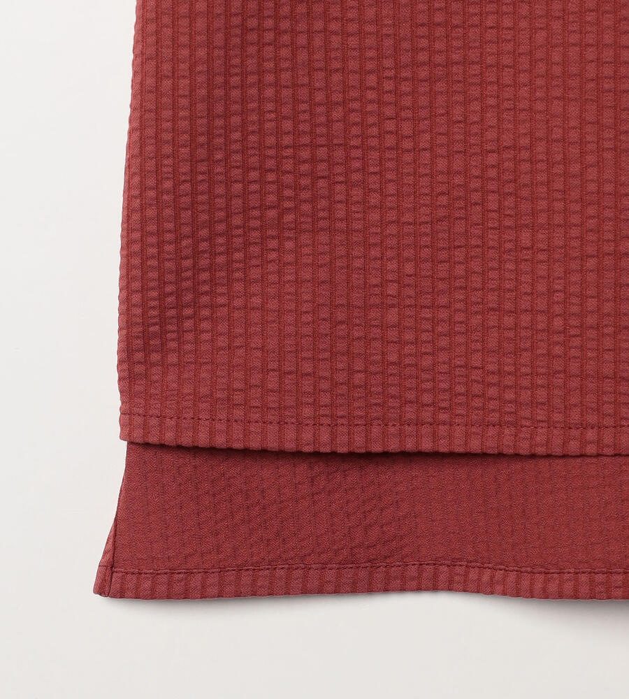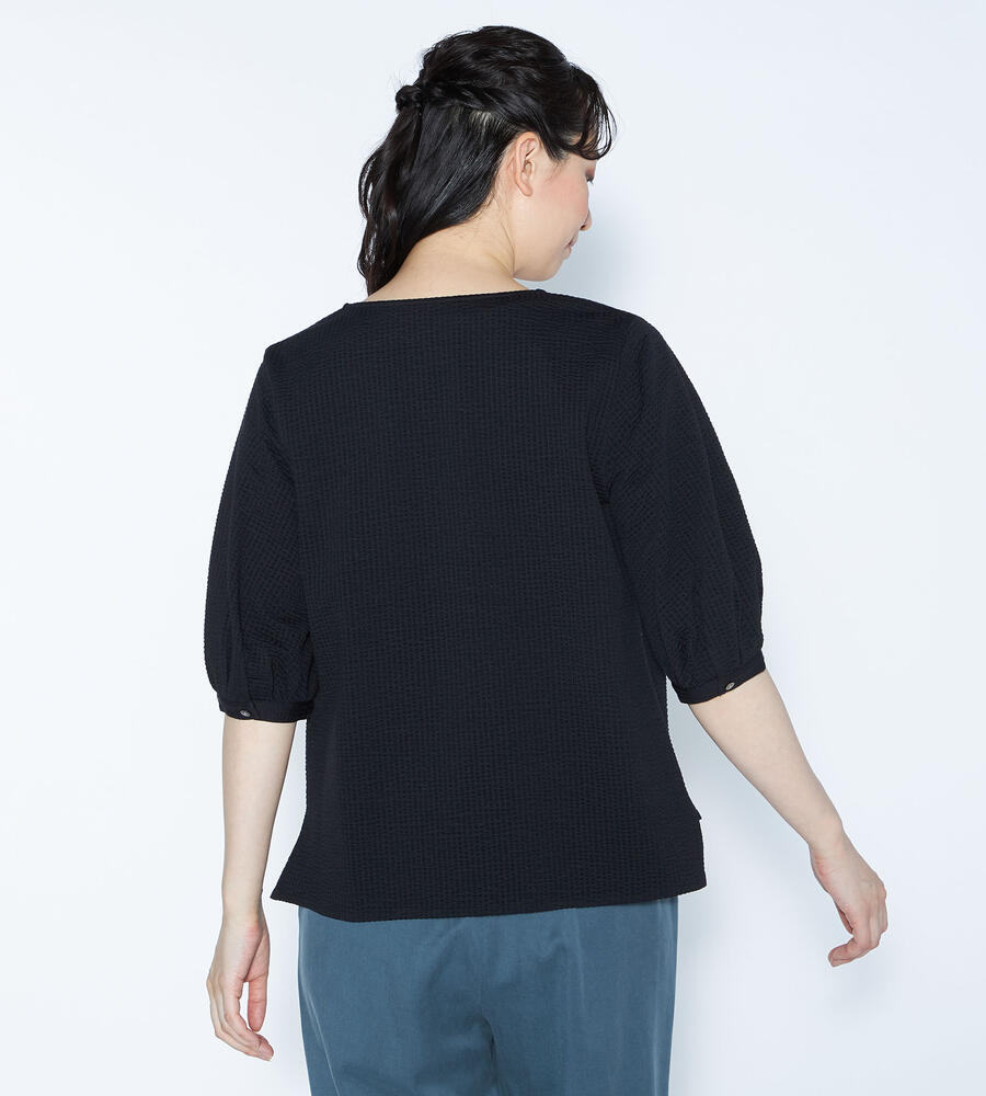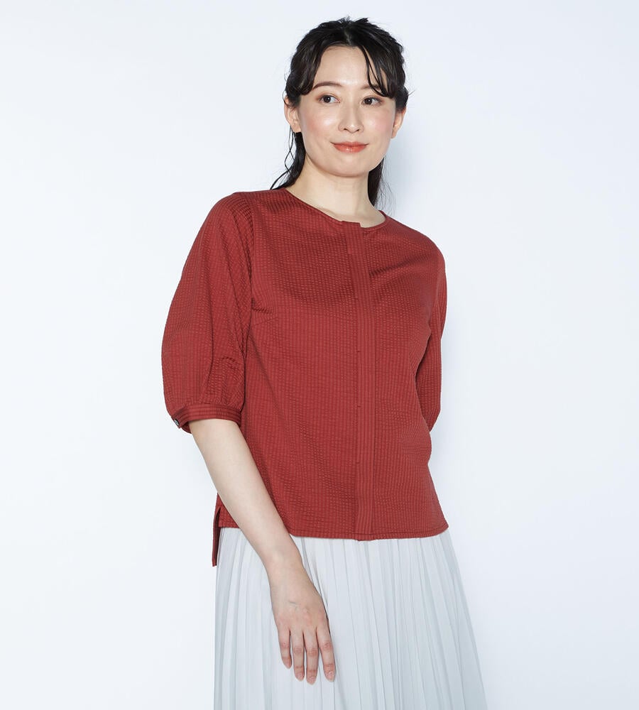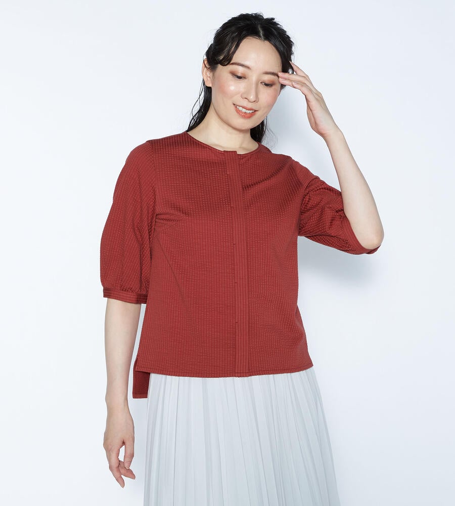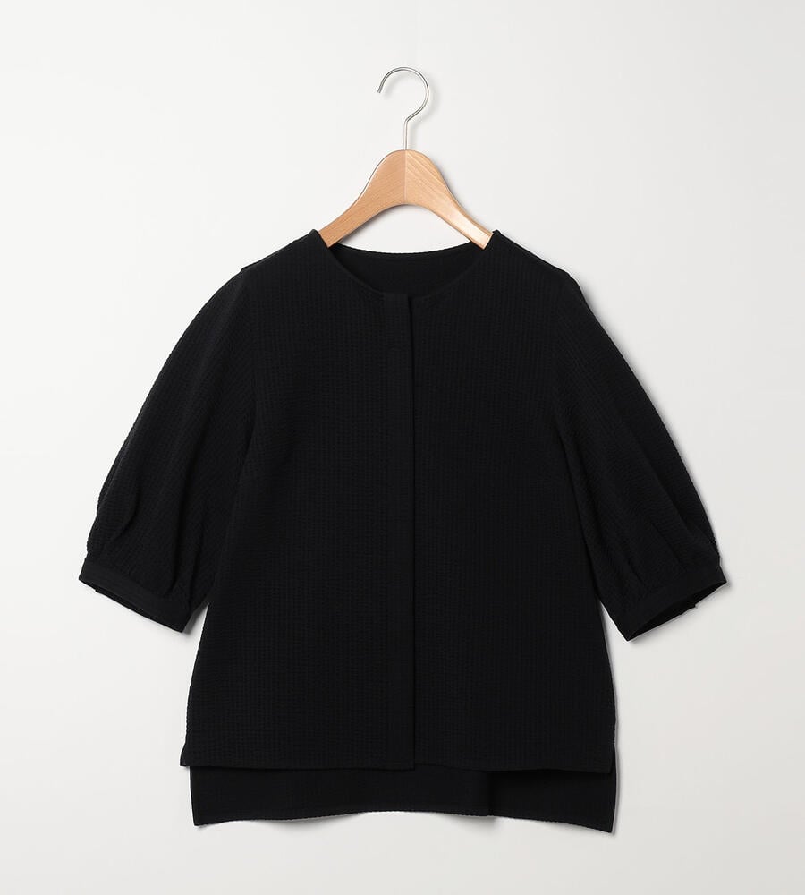 コットン混のシアサッカー地を用いたトップスです。サッカー地の畝によるストライプ柄で、クリーンな着こなしを楽しめる1点です。ふんわりと膨らませた袖とは対照的な、直線的なヘムラインでシャープなエッセンスもプラス。女性らしい柔和さと、クリーンな印象を両立させたアイテムです。フロントの裾だけをインさせるアレンジもおすすめです。