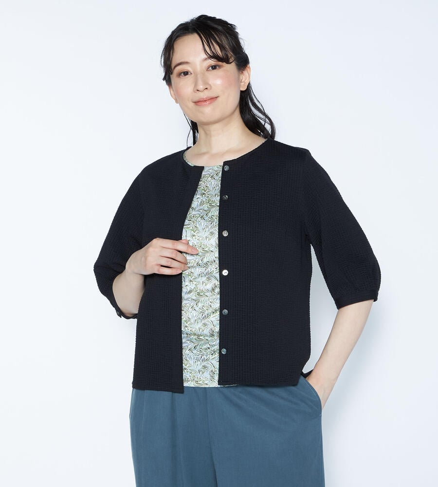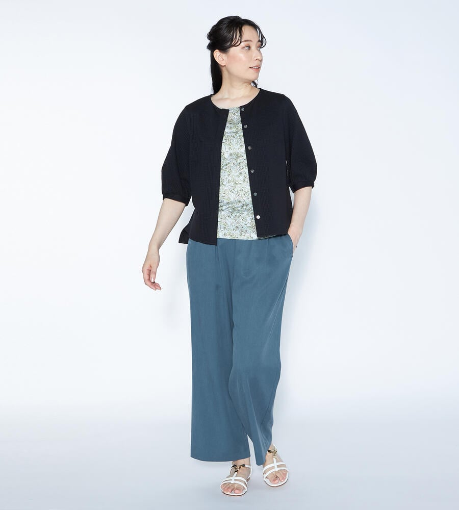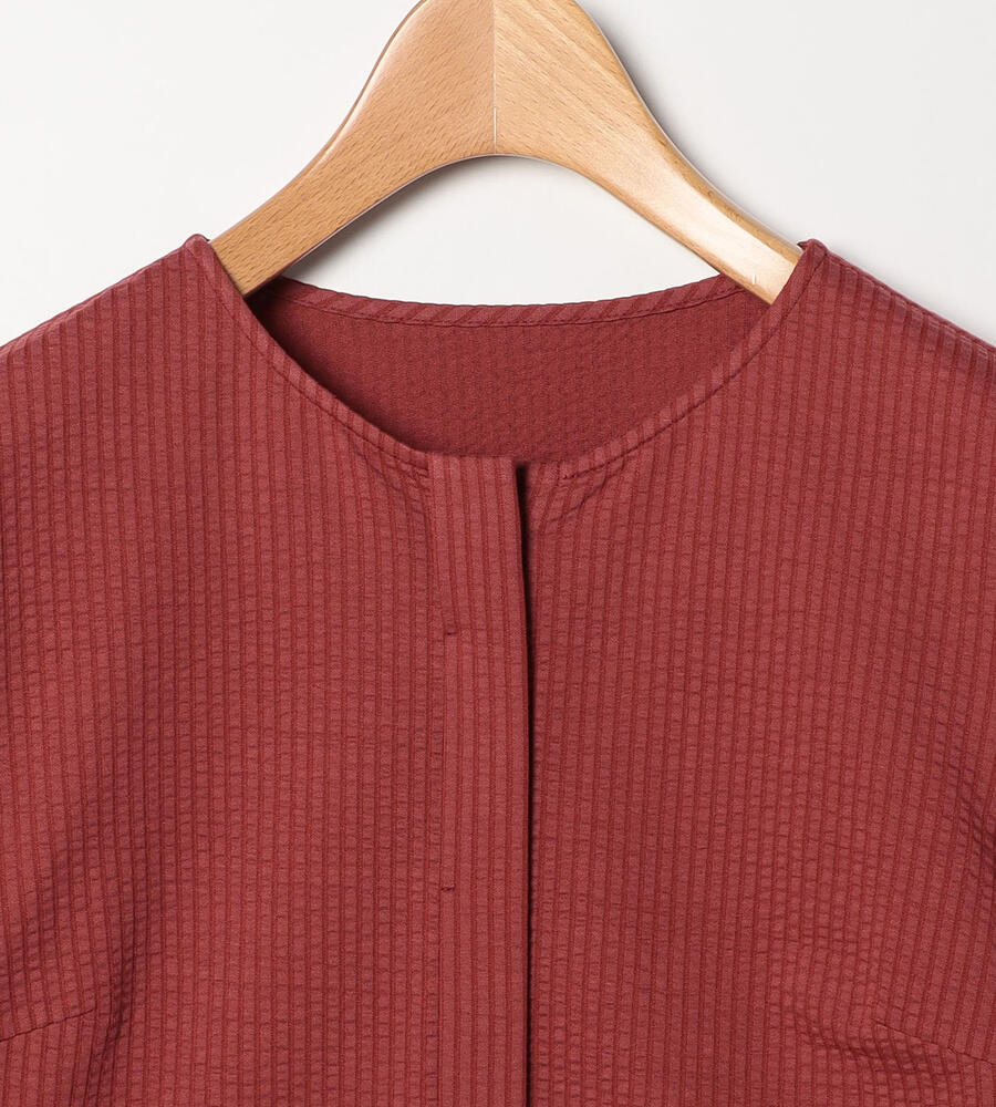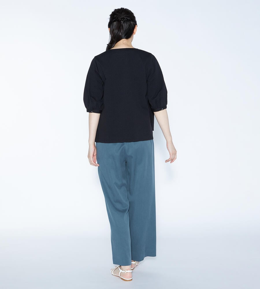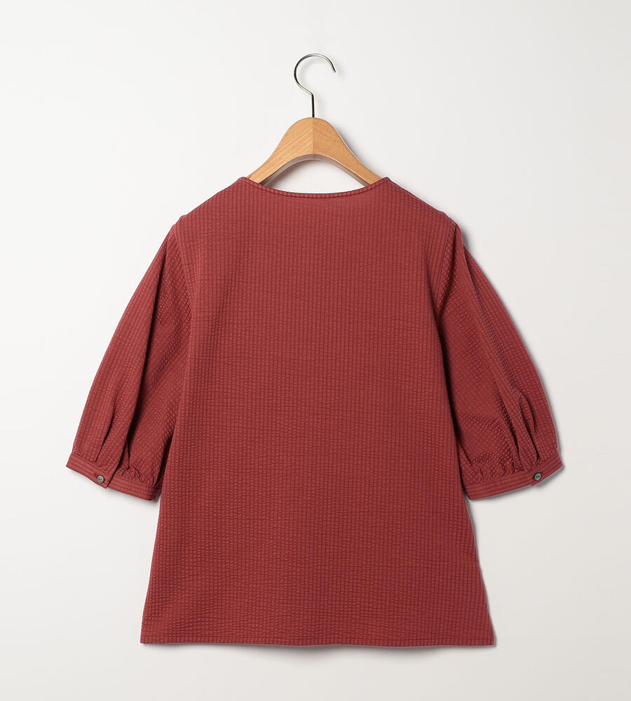 コットン混のシアサッカー地を用いたトップスです。サッカー地の畝によるストライプ柄で、クリーンな着こなしを楽しめる1点です。ふんわりと膨らませた袖とは対照的な、直線的なヘムラインでシャープなエッセンスもプラス。女性らしい柔和さと、クリーンな印象を両立させたアイテムです。フロントの裾だけをインさせるアレンジもおすすめです。