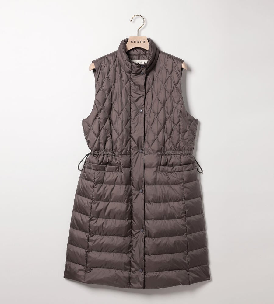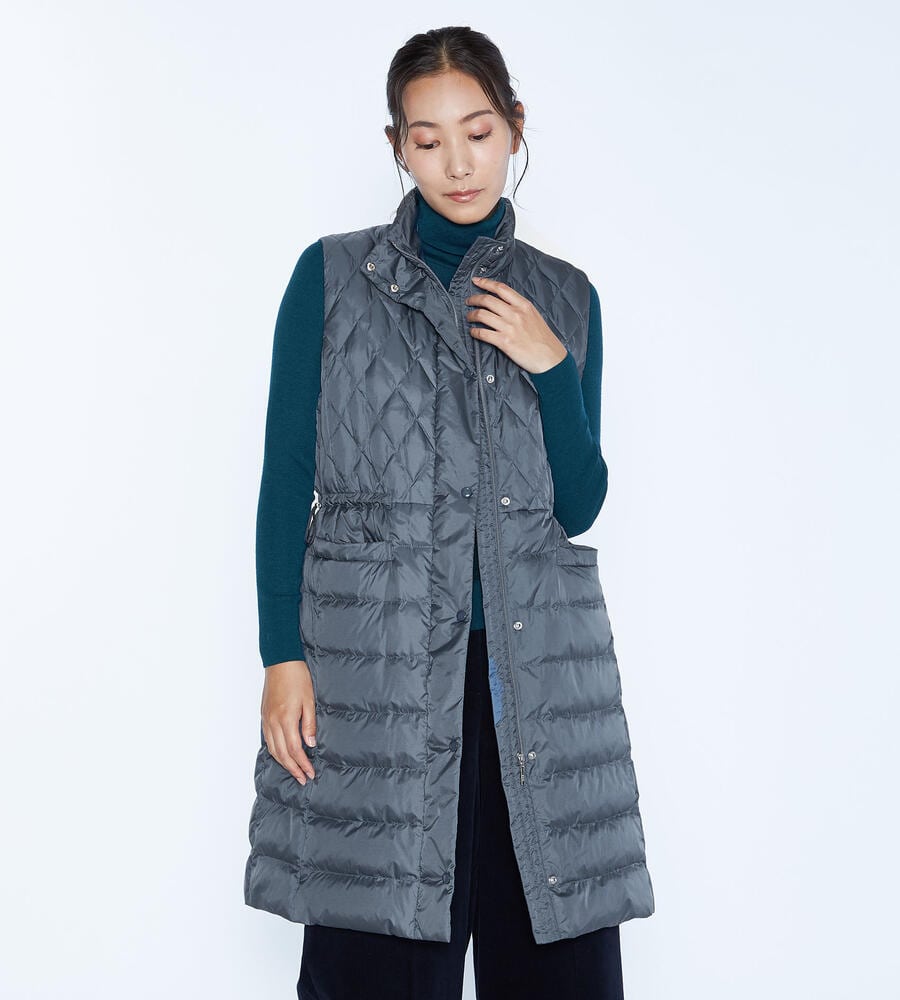 ダイヤ柄とボーダー柄のキルトを用いて、表情豊かに仕上げたベスト。ダウンとフェザーを用いており、軽いながらも暖かな着心地を味わえます。インに厚手のものを合わせやすいよう、アームホールを広く開けているのもポイント。ウエストをぎゅっと絞ることで、フェミニンな着こなしを楽しめます。