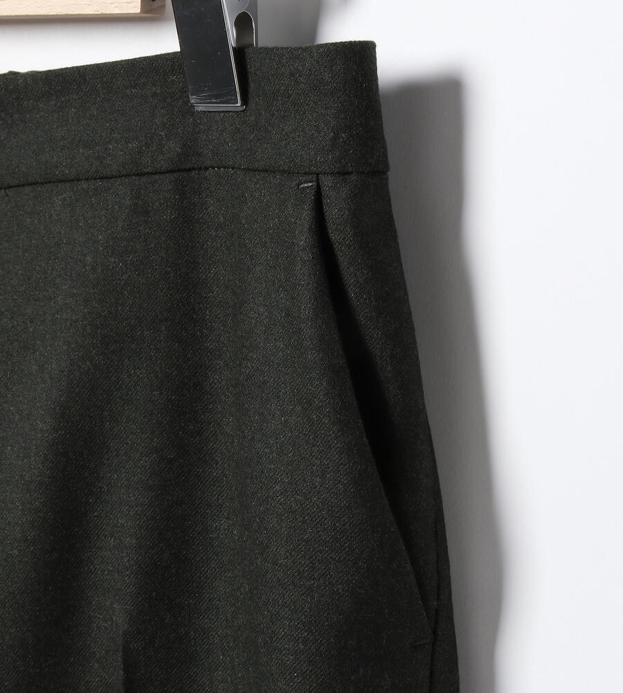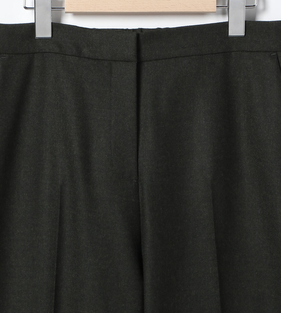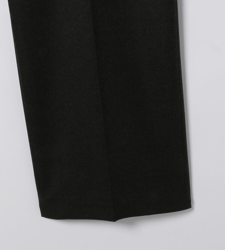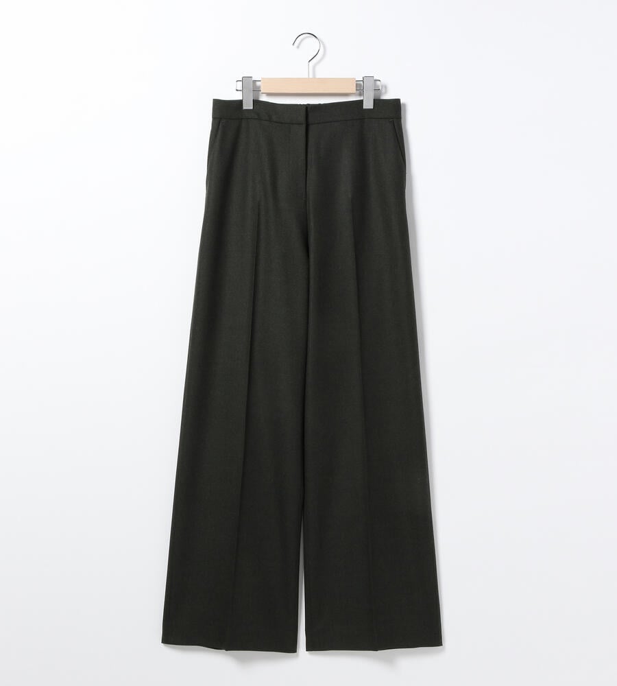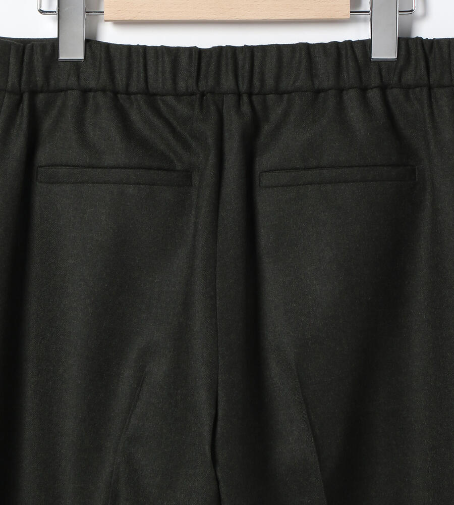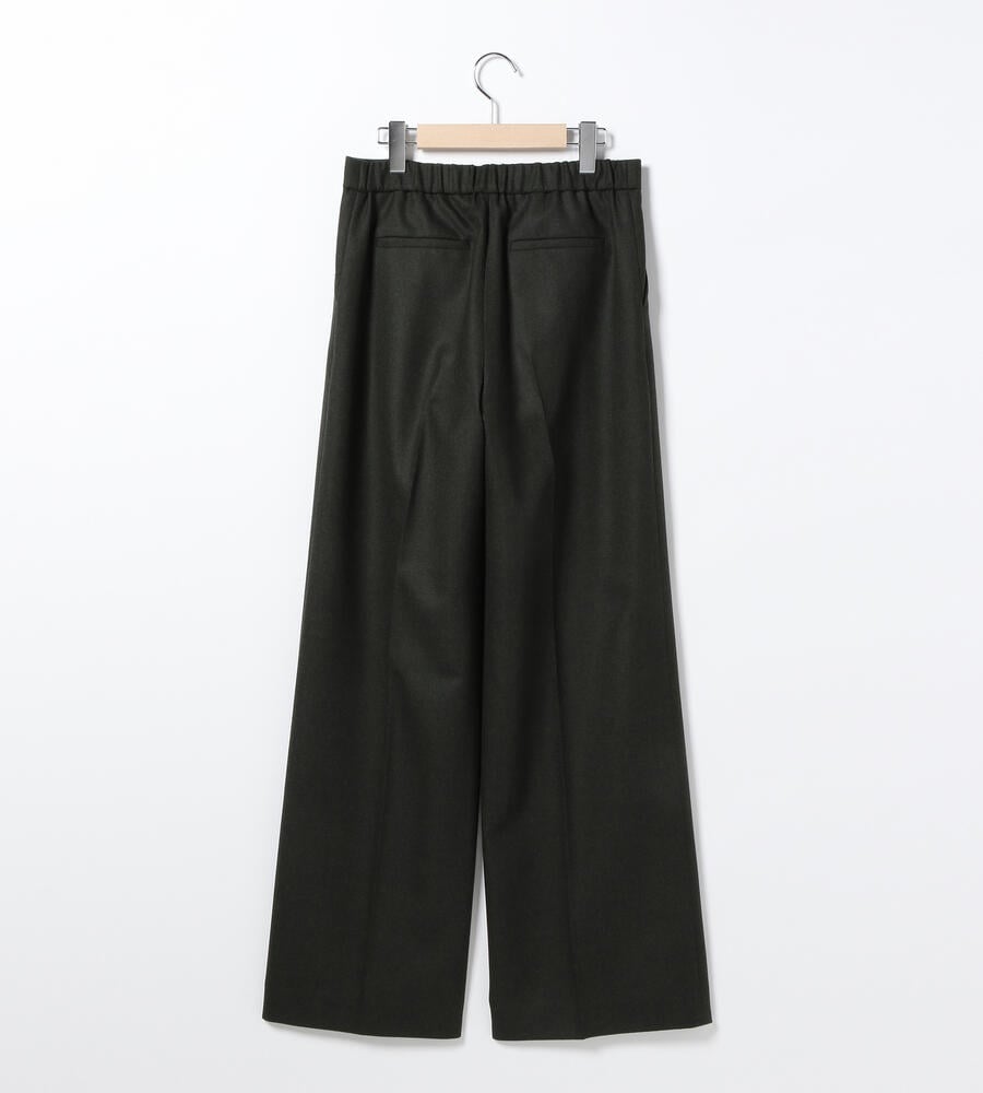 裾に向かって広がるワイドなシルエットでエレガントな表情に仕上げたストレッチフラノパンツ。サイドとバックにポケットが配置され、センタープレスがスラリとした脚のラインを演出。ウエストはゴムを採用することでコンフォートな着心地を叶えています。