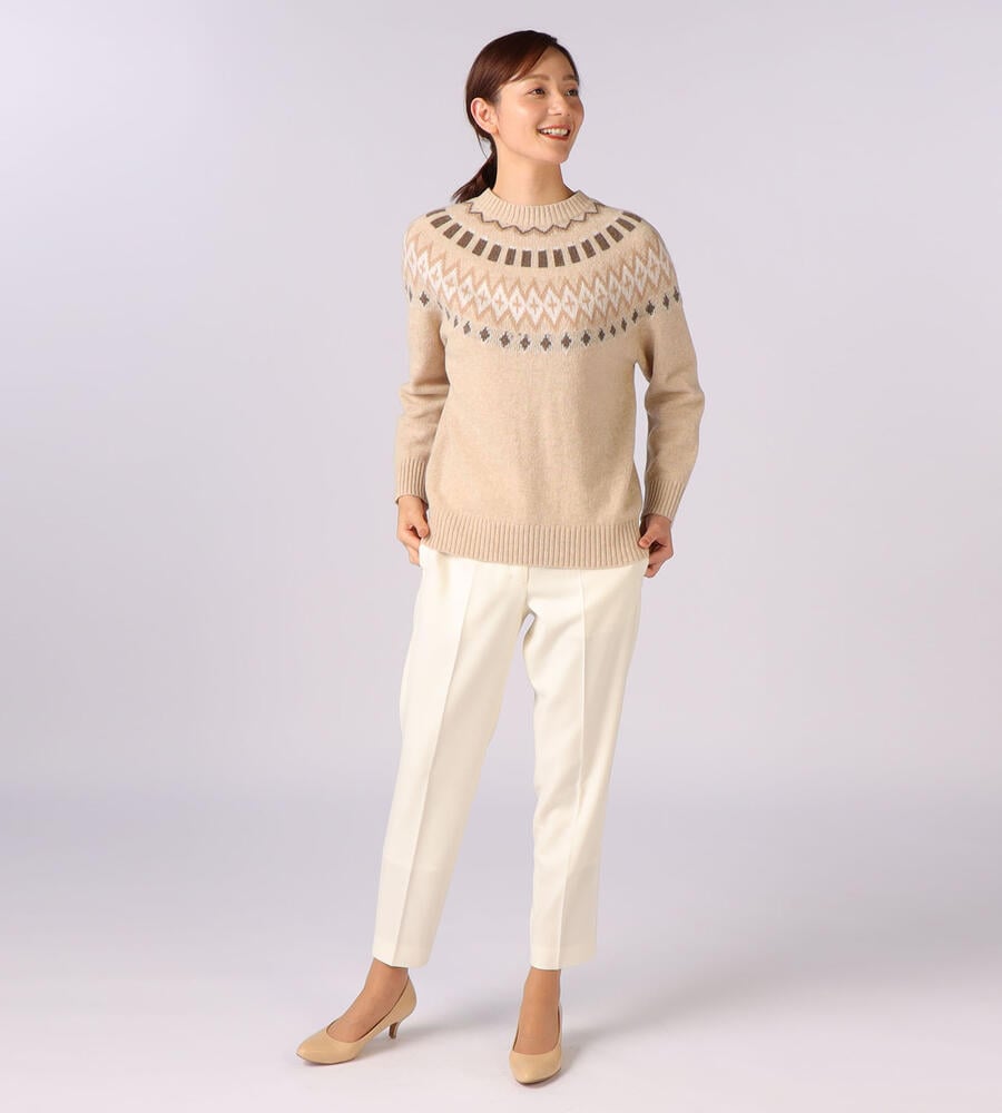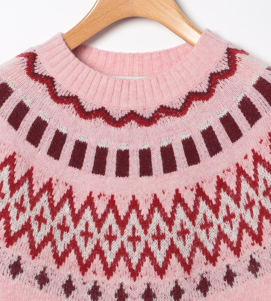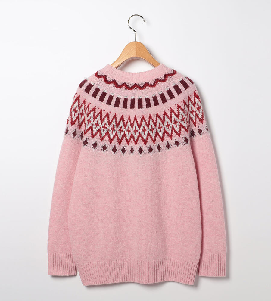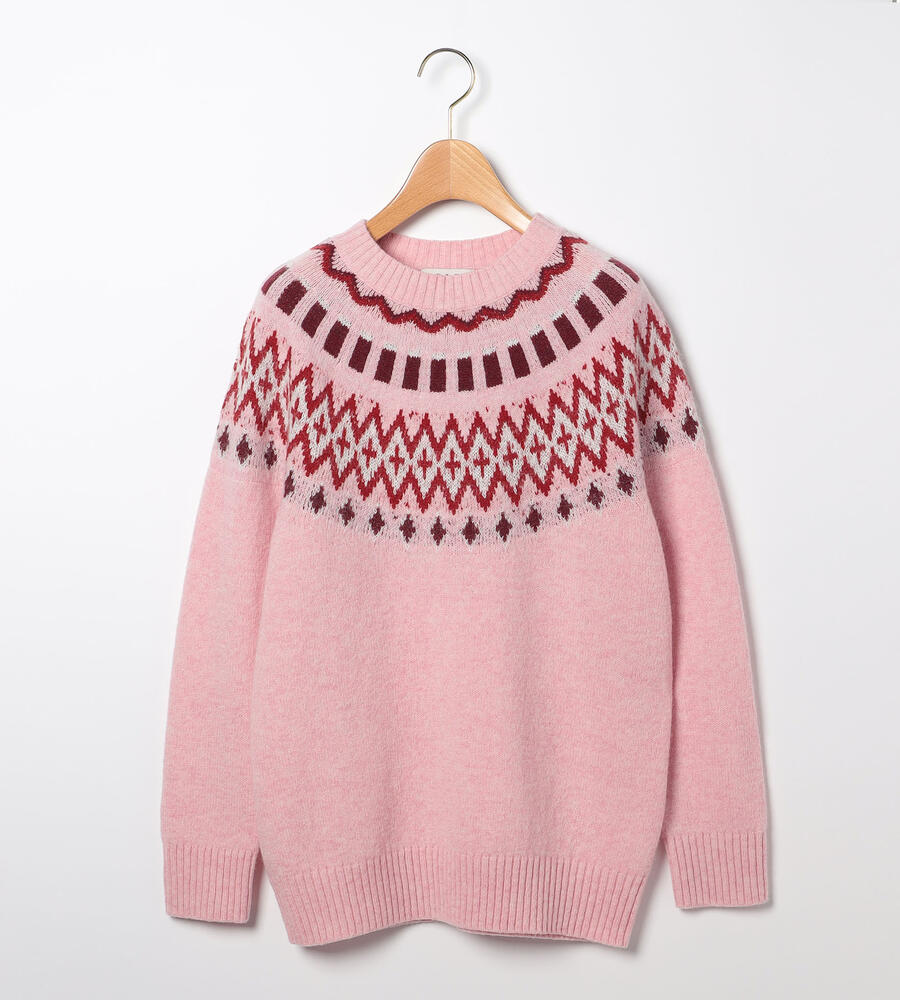 英国の伝統的なフェアアイル柄をあしらった、長袖クルーネックニットです。明るいカラーリングにより、重くなりがちな秋冬シーズンの着こなしにアクセントをプラスしてくれるアイテム。シンプルな無地のボトムとはもちろん、チェック柄とも好相性。上質なウール素材で暖かく、長くご愛用いただきたいニットです。