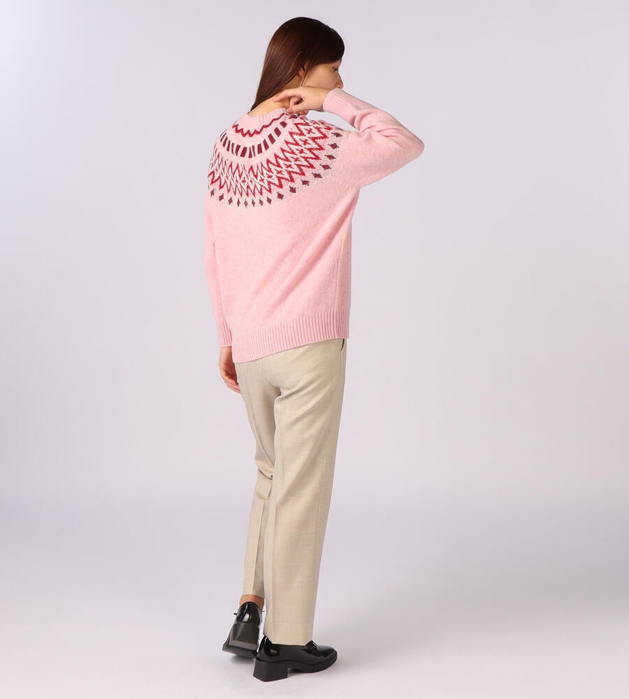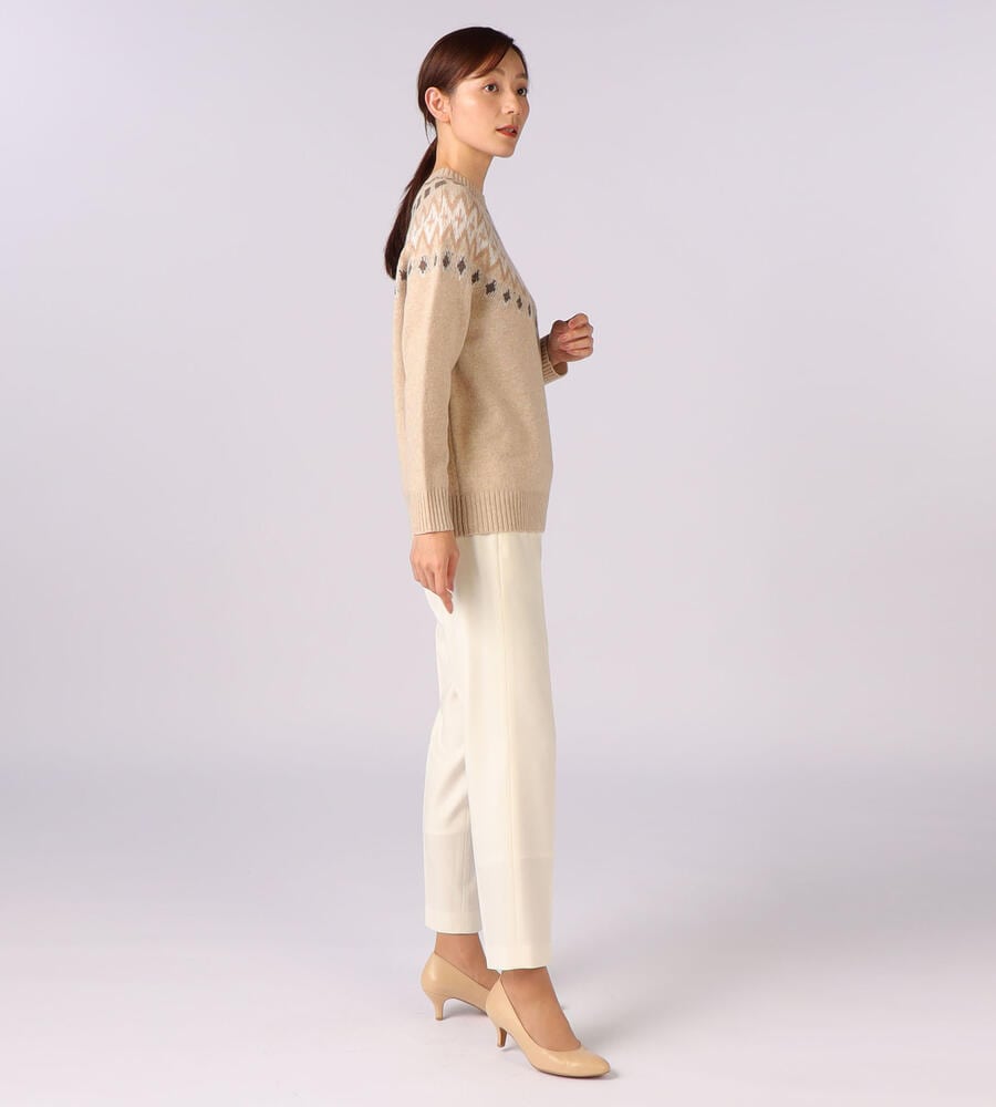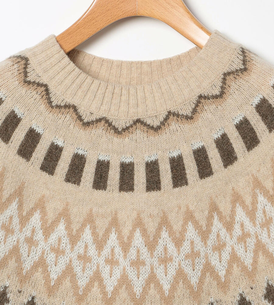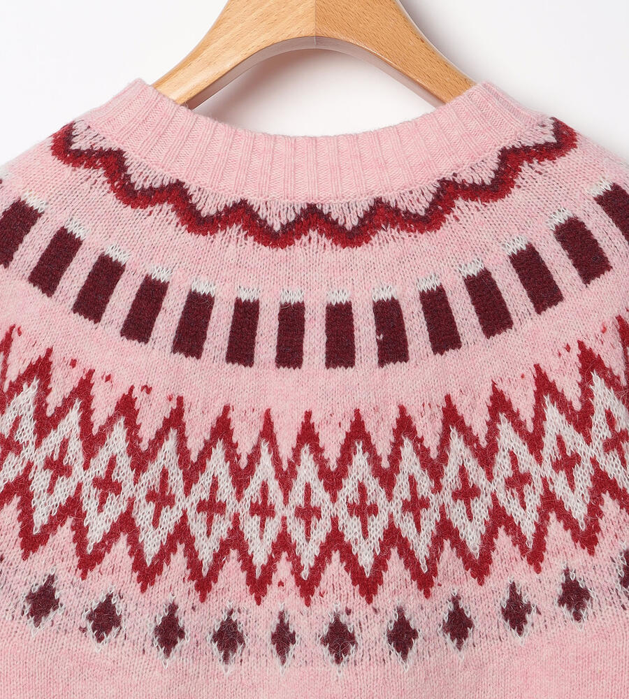 英国の伝統的なフェアアイル柄をあしらった、長袖クルーネックニットです。明るいカラーリングにより、重くなりがちな秋冬シーズンの着こなしにアクセントをプラスしてくれるアイテム。シンプルな無地のボトムとはもちろん、チェック柄とも好相性。上質なウール素材で暖かく、長くご愛用いただきたいニットです。
