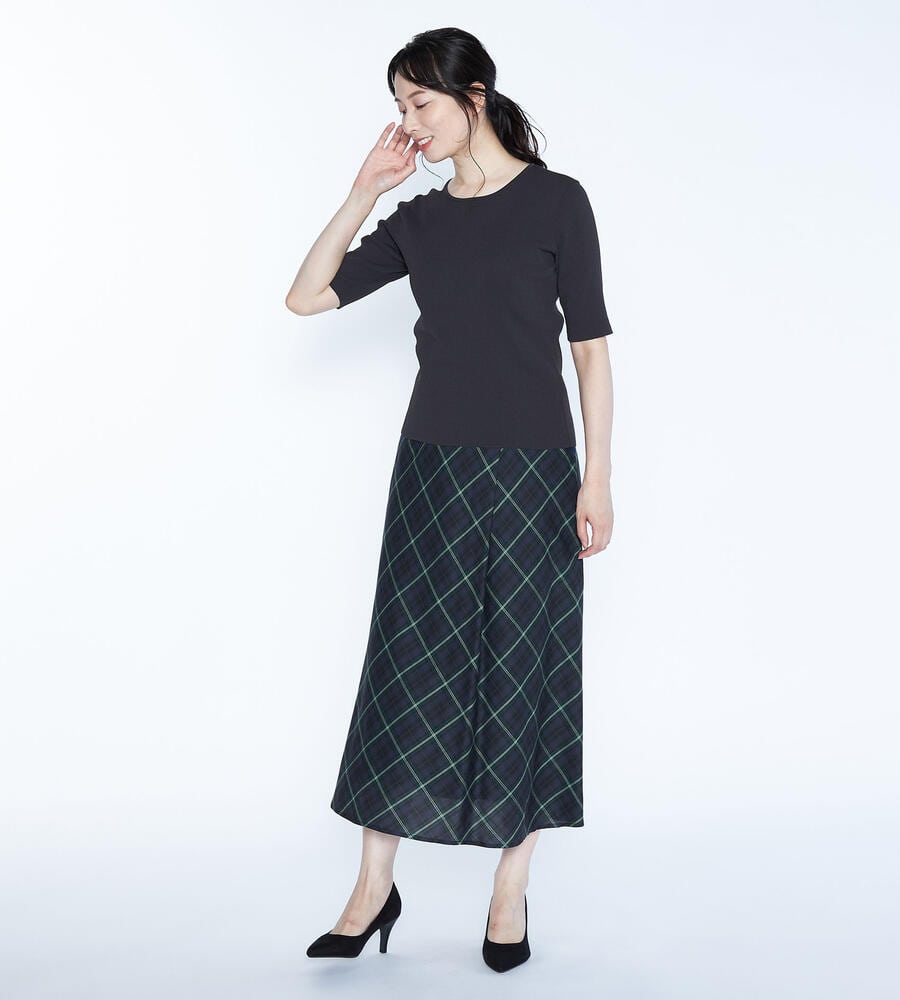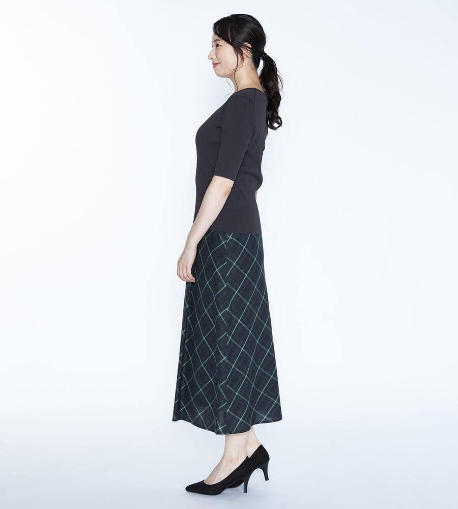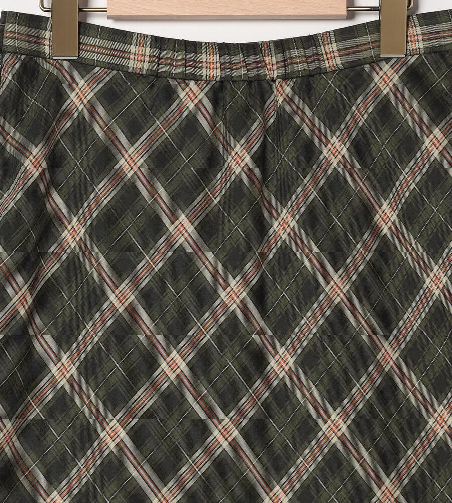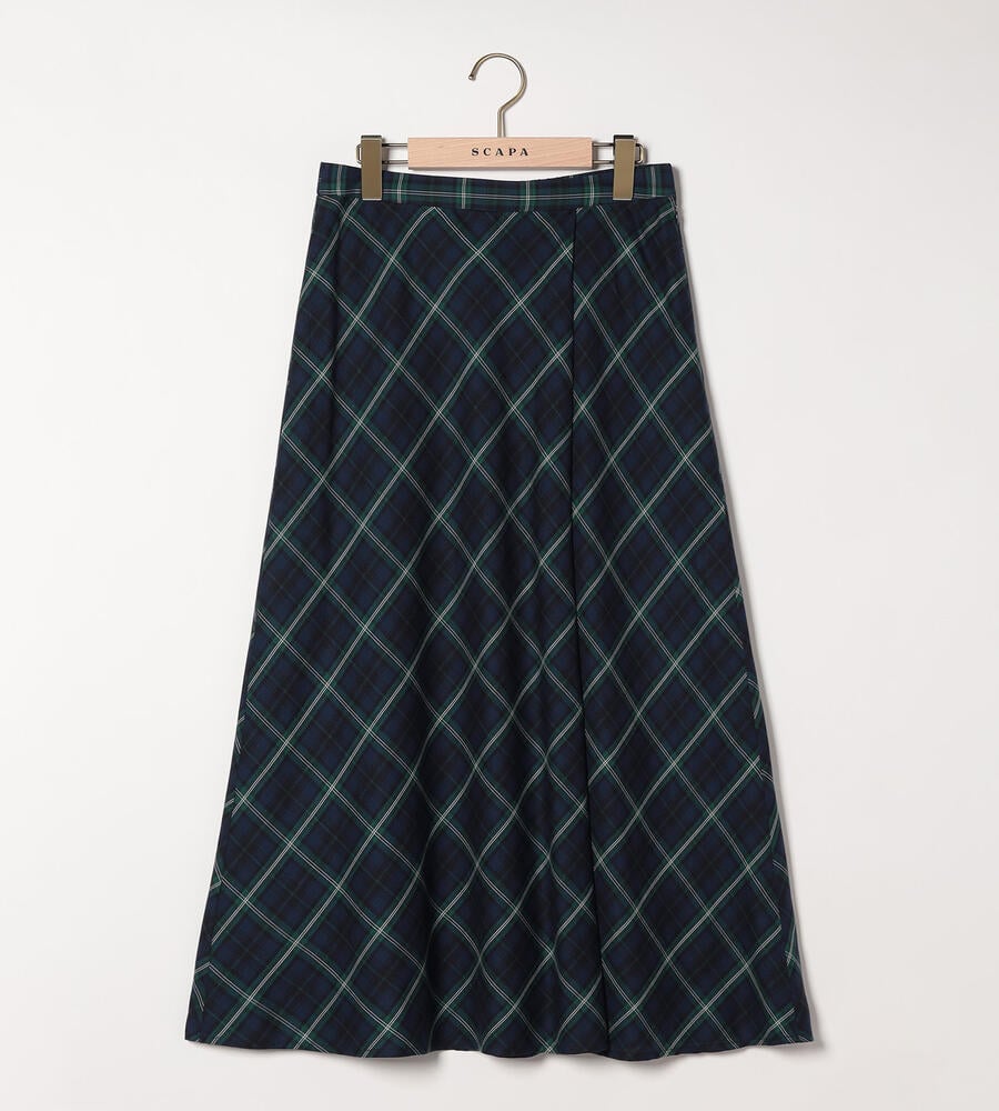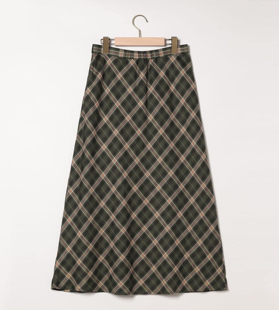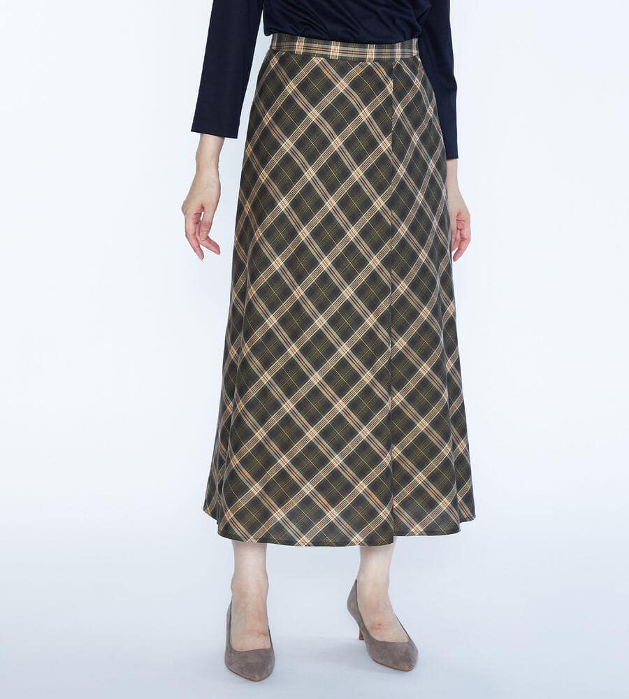 トラッド感とモードな雰囲気のバランスが良いバイアスチェック柄のスカート。左前にタックを施したキルト風のシルエットです。風合いは柔らかく、ドレープや揺れ感がきれいに出て女性らしさが引き立ちます。上品に穿きこなせる長めの丈感。後ろウエストにゴムが入り、フィット感良く身に着けられます。