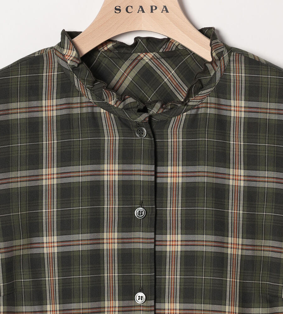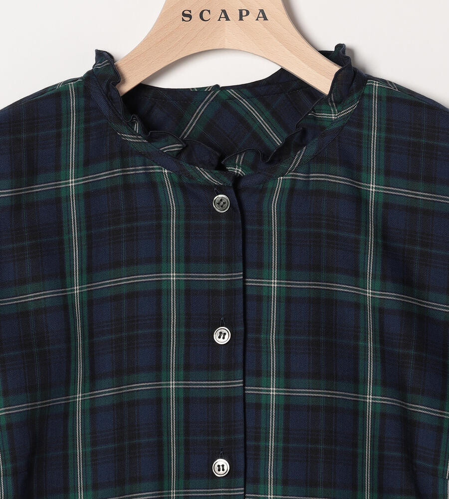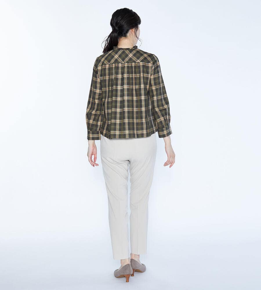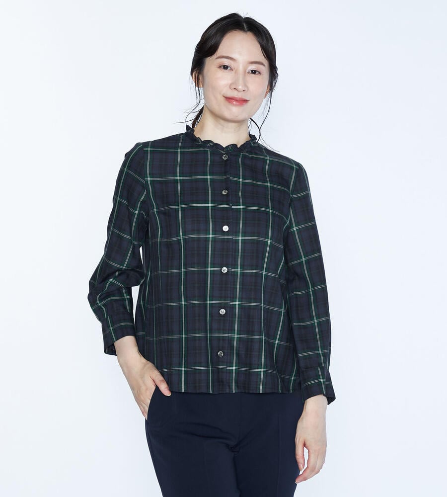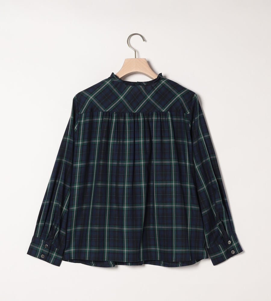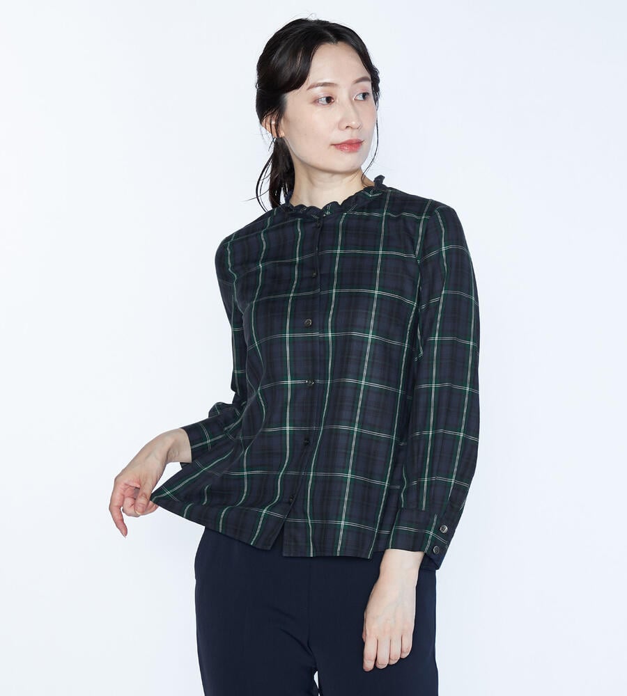トラディショナルに着こなせるチェック柄の長袖ブラウス。シックな印象の配色は秋のコーディネートにもぴったりです。ボリューム控えめのフリルスタンドカラーが女性らしさをさりげなくプラスします。バックヨークの切り替えにはギャザーが施されて後ろ姿も印象的。肌触りが柔らかく、きれいなドレープ感も魅力です。