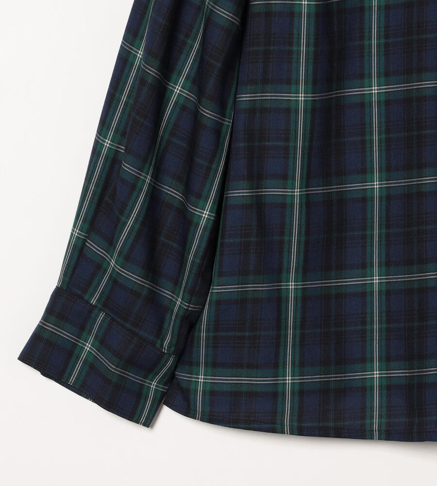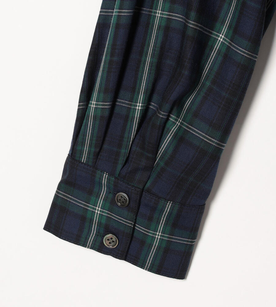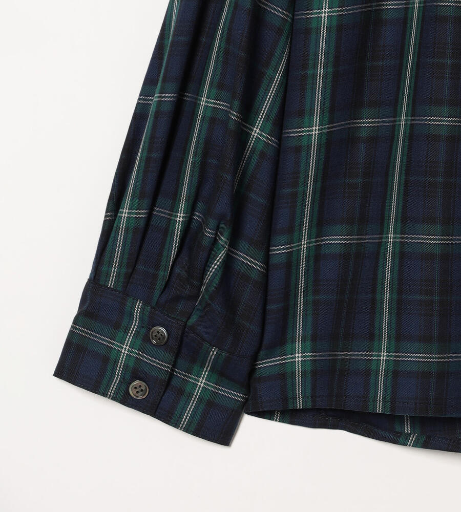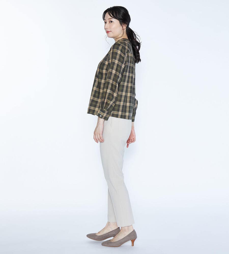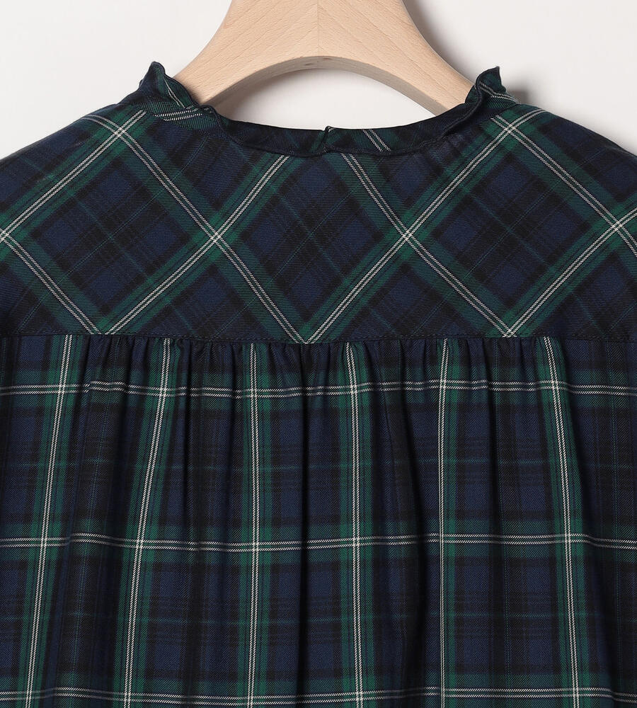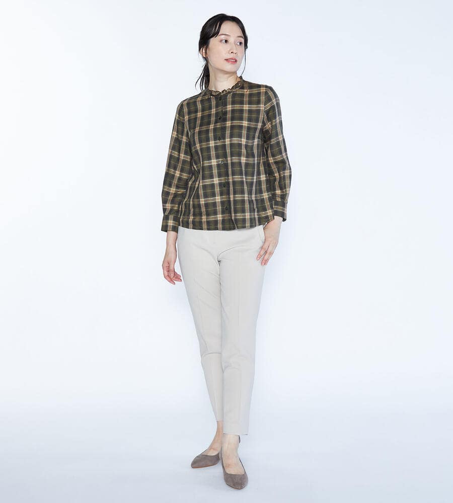 トラディショナルに着こなせるチェック柄の長袖ブラウス。シックな印象の配色は秋のコーディネートにもぴったりです。ボリューム控えめのフリルスタンドカラーが女性らしさをさりげなくプラスします。バックヨークの切り替えにはギャザーが施されて後ろ姿も印象的。肌触りが柔らかく、きれいなドレープ感も魅力です。