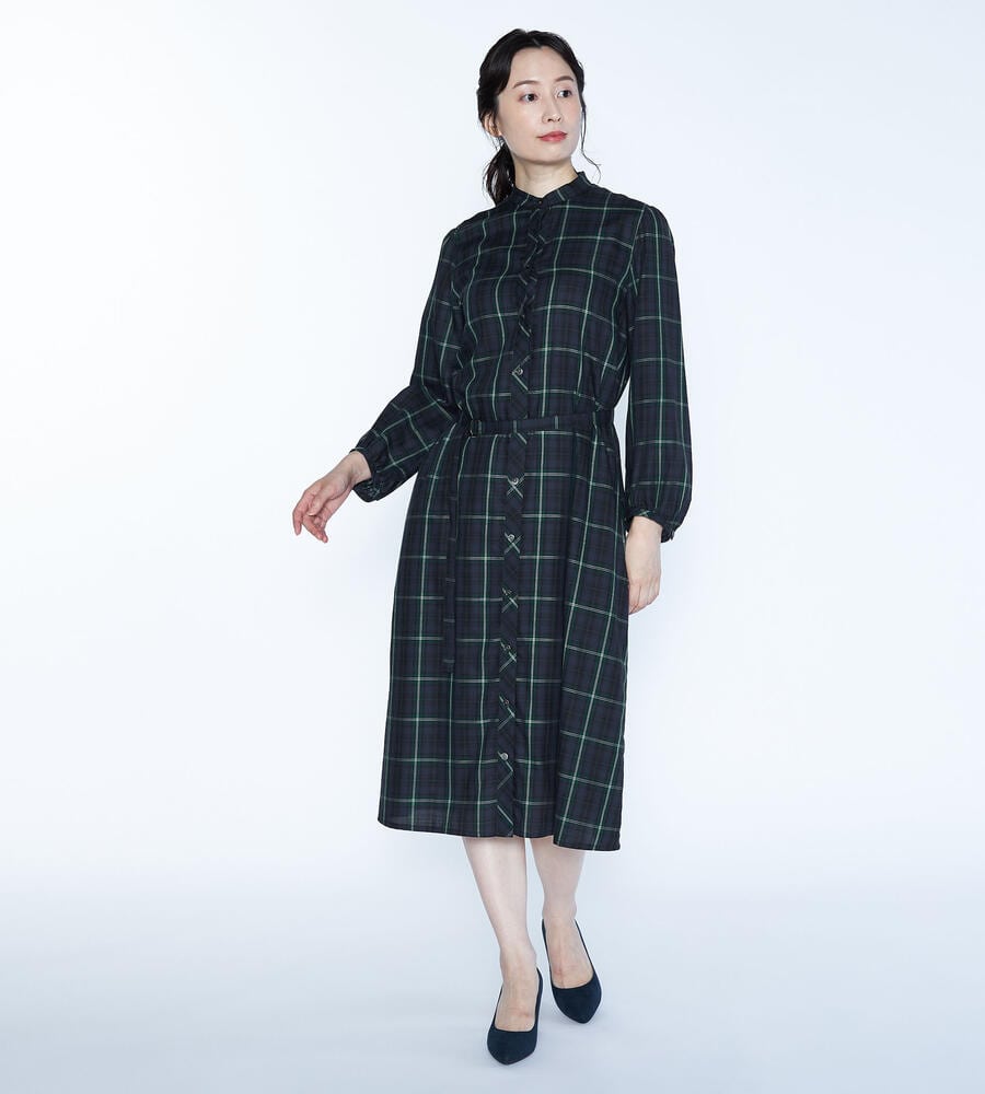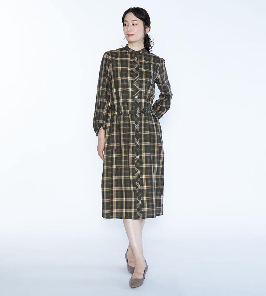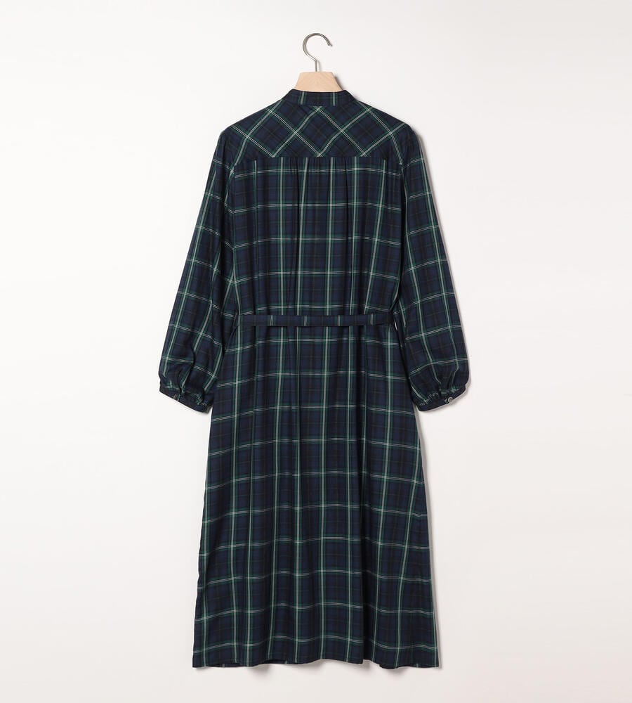 クラシカルな雰囲気が魅力のチェック柄の長袖ワンピース。バックヨークに前立て、袖口はバイアス使いでメリハリを持たせています。顔回りがすっきりと見えるバンドカラーはトレンドにもぴったりです。上品に着こなせる長めの丈感を採用。共布のベルトが付属してウエストマークのアレンジも楽しめます。