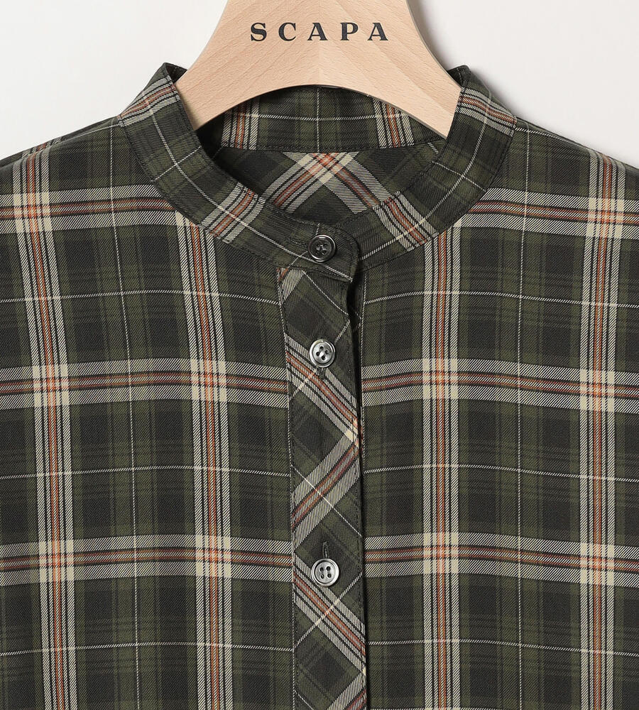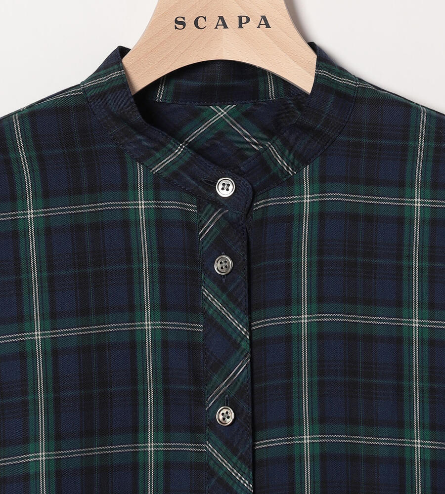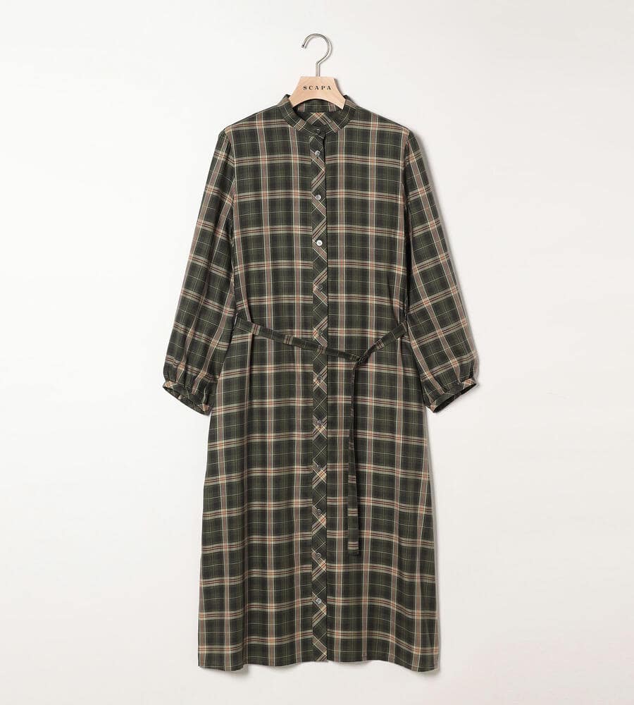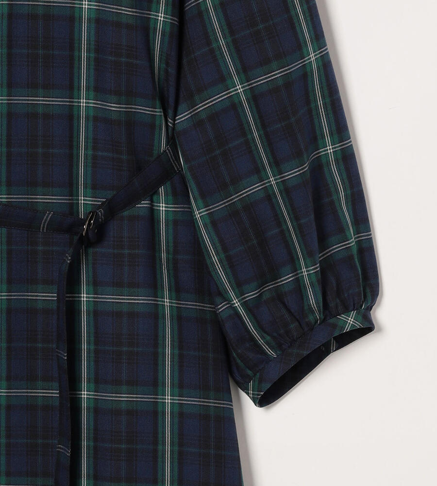 クラシカルな雰囲気が魅力のチェック柄の長袖ワンピース。バックヨークに前立て、袖口はバイアス使いでメリハリを持たせています。顔回りがすっきりと見えるバンドカラーはトレンドにもぴったりです。上品に着こなせる長めの丈感を採用。共布のベルトが付属してウエストマークのアレンジも楽しめます。