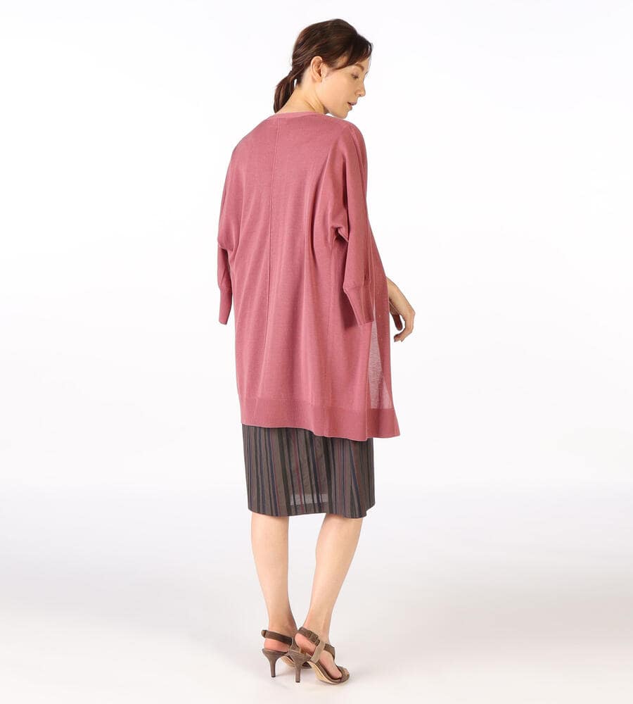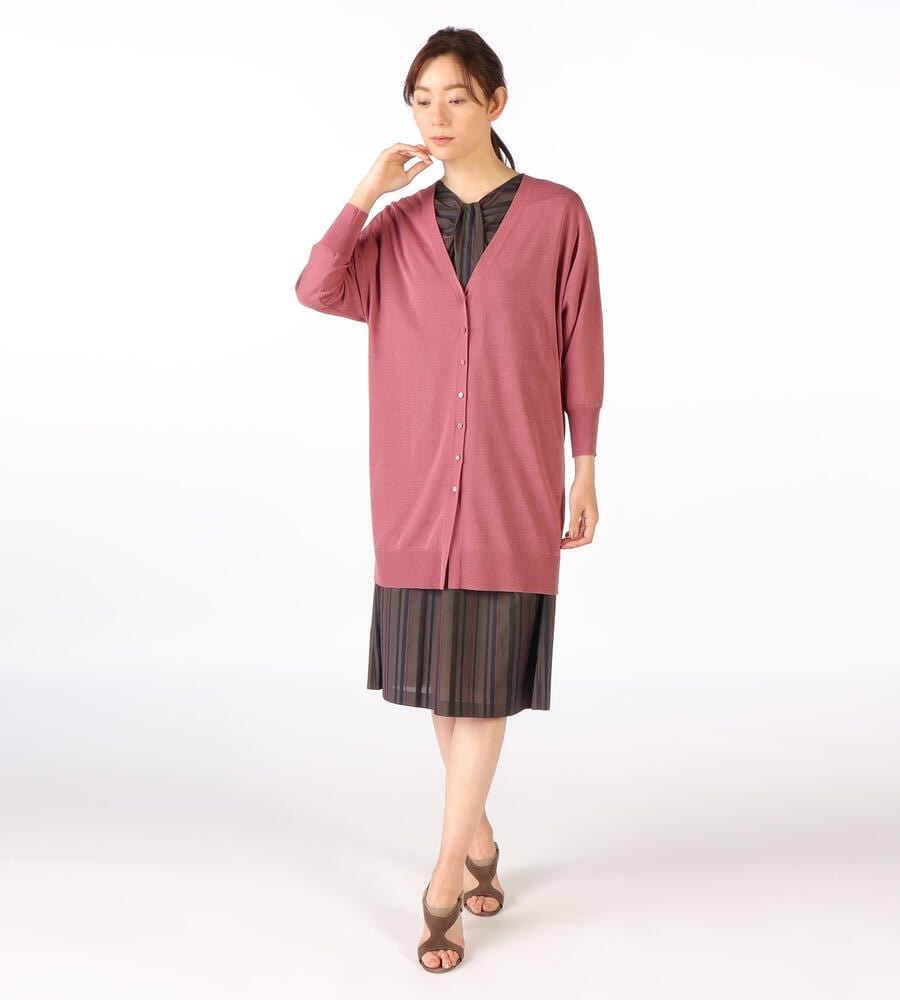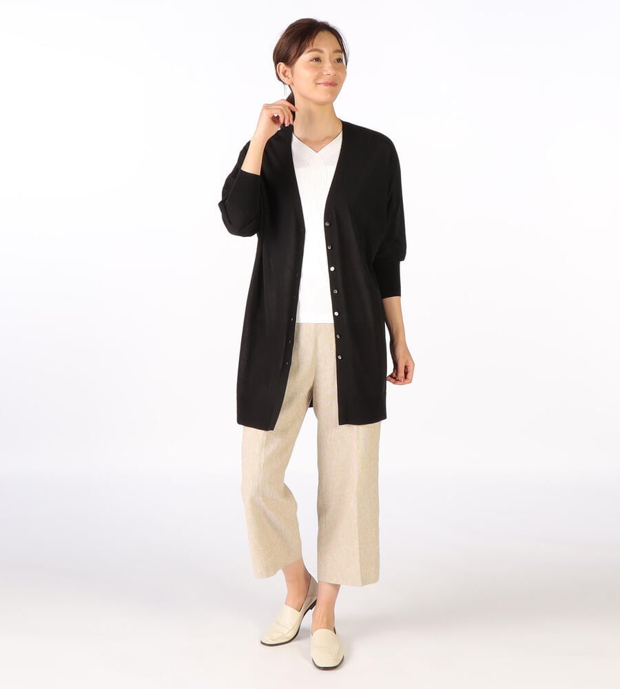 シャリ感のあるコットンアセテートの素材を使った、涼やかな着心地のロングニットカーディガンです。ストンと落ちる締め付けのない身頃で、ストレスフリーに着られます。バックスタイルにセンターシームが入っているため、上品さがプラスされているのもポイントです。シャツ×スカートのきれいめなスタイリングにも合わせられます。