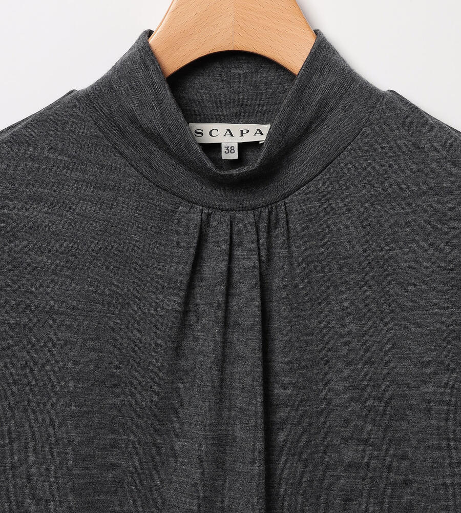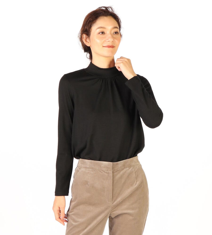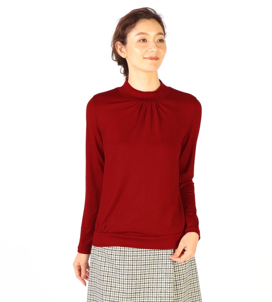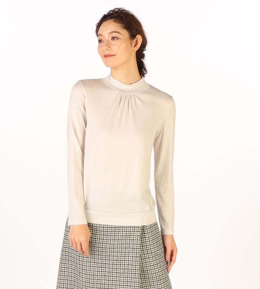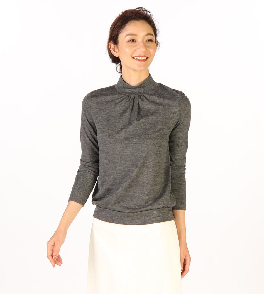 わずかに光沢のある生地でおつくりしたプルオーバー。プチハイネックで上品に仕上げた顔まわりには、控えめにタックをほどこすことで華やかをプラスしました。無地ベースのシンプルなデザインで、合わせるボトムを選ばないのもポイント。トップスとしてはもちろん、ジャケットのインナーとしても相性が良く、カジュアルからオフィスまで幅広くお使いいただけます。