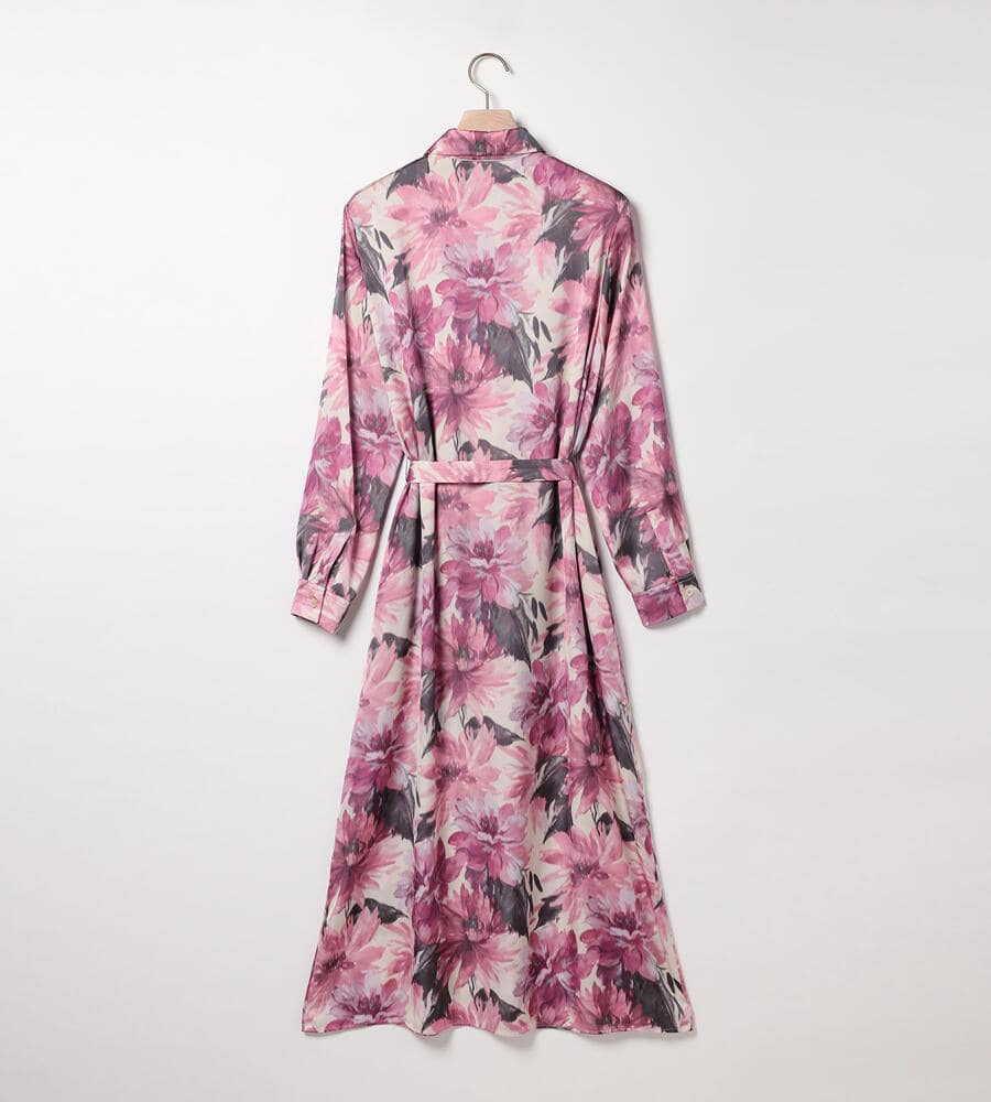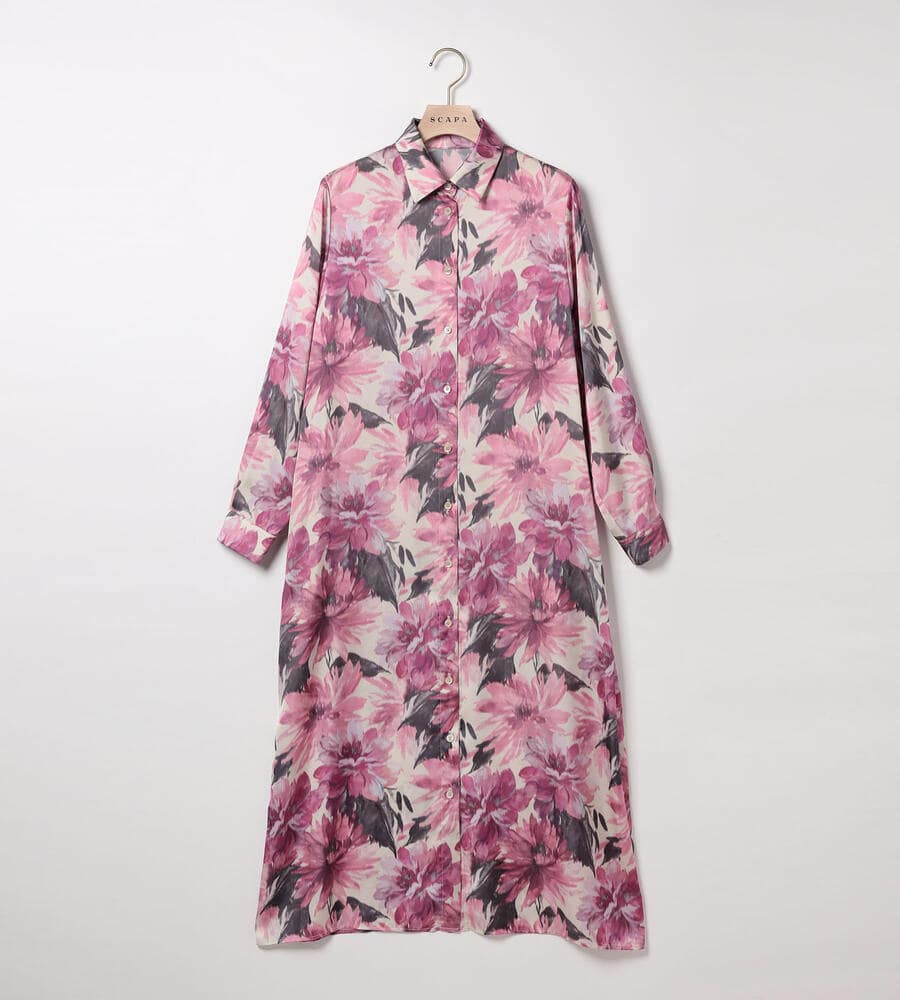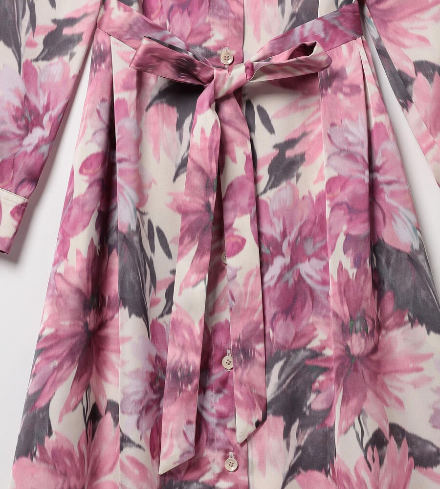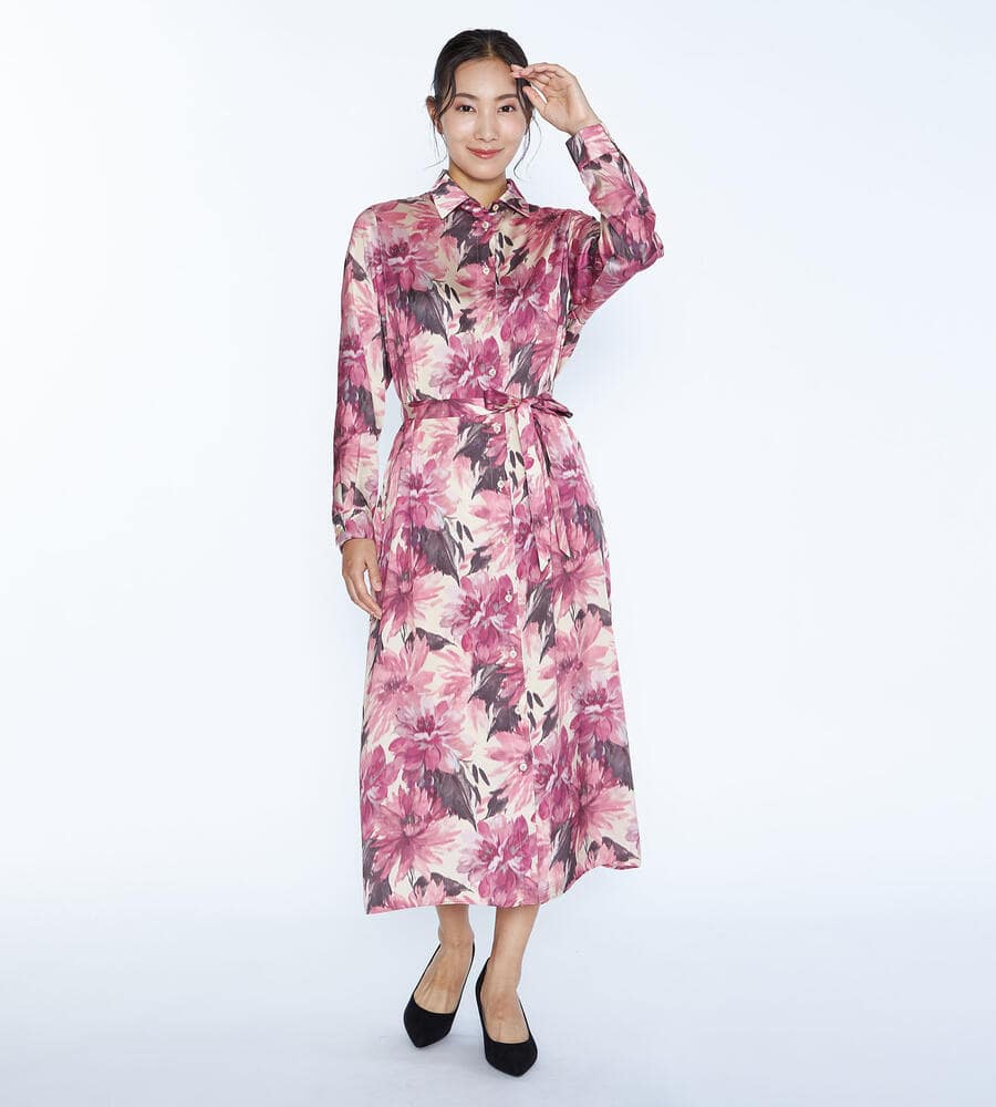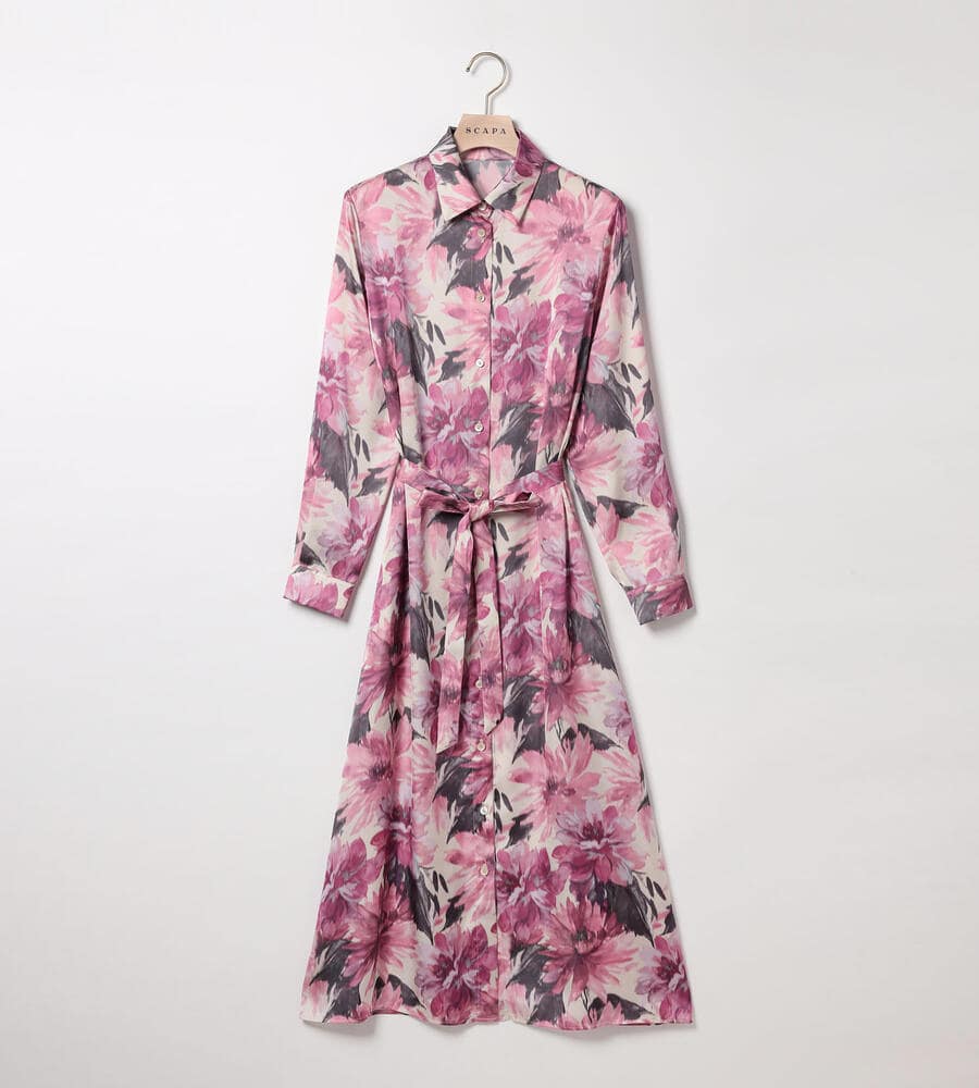 華やかなカラー使いが気分を高めてくれるフラワープリントワンピース。シャツライクなデザイン、程よく裾にフレアを入れたAラインシルエット。しなやかな素材感がエレガントな雰囲気に仕上げてくれるアイテム。ウエストベルトのオンオフでアレンジを楽しめます。