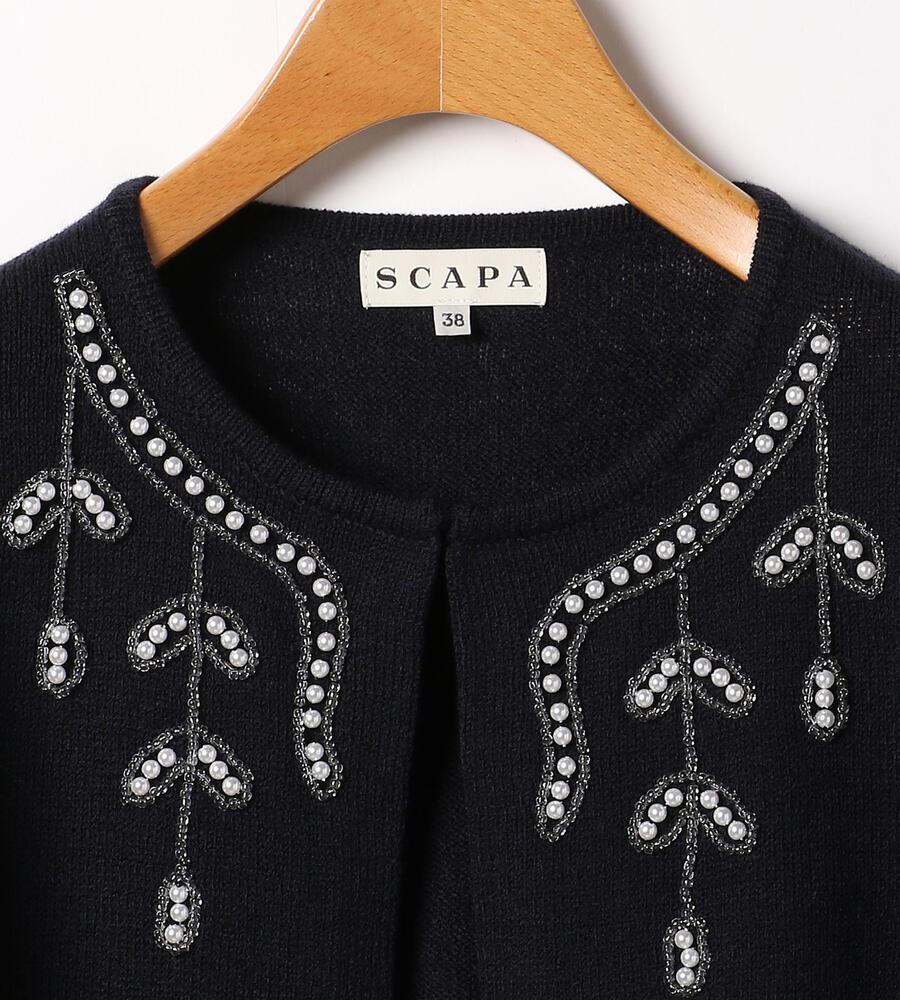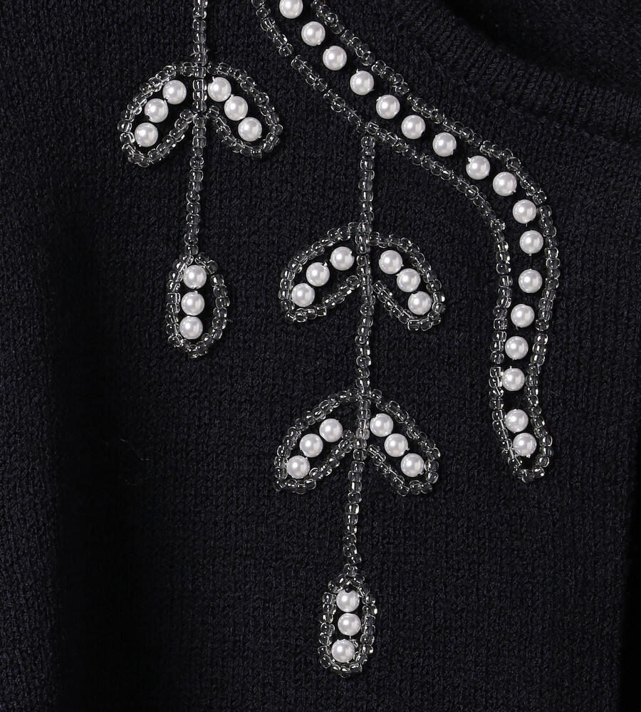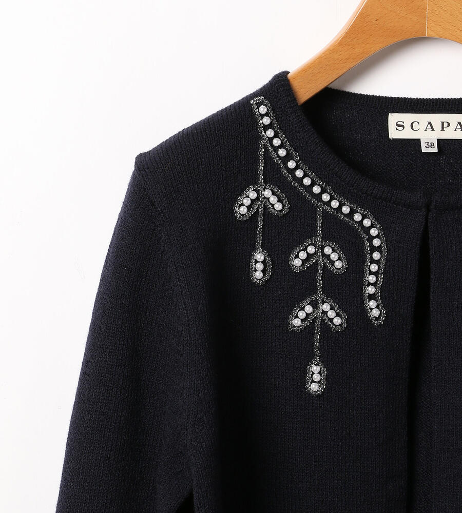 美しいビーズ&パールモチーフがお顔周りに華やぎを添えてくれるニットカーディガン。コンパクトなシルエットで軽やかに着用でき、ノーカラージャケットのような気品を備えた一枚です。フロントは開閉しやすいホックボタン仕様。カットソーやワンピースの羽織りとして秋から春まで幅広く活躍します。