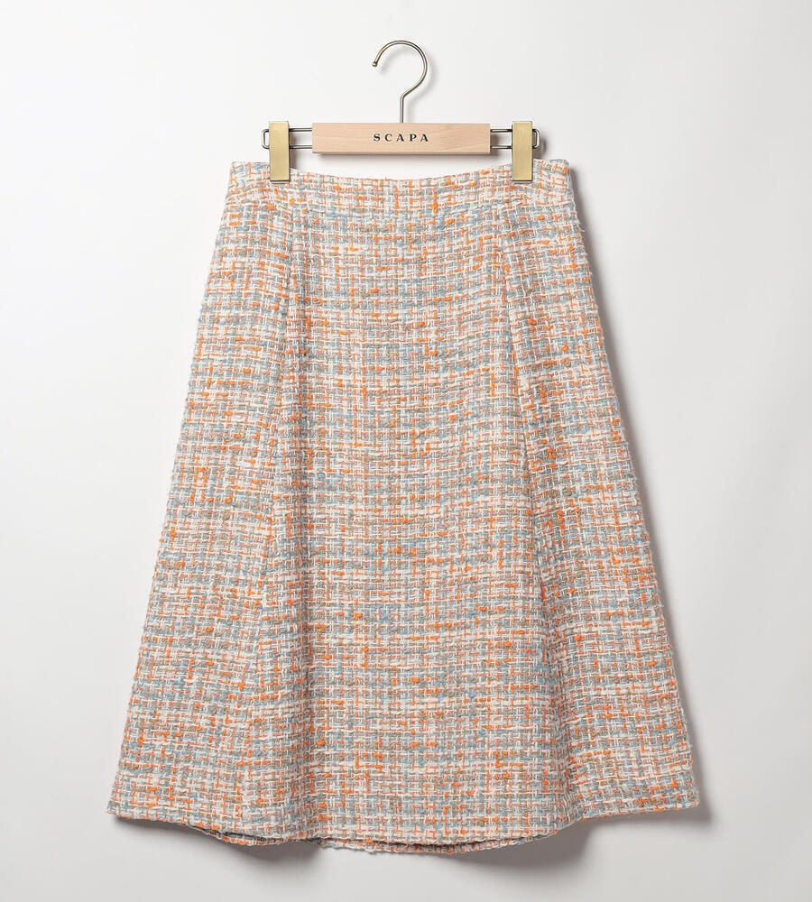 綺麗な色使いが目を引く、ざっくりとしたツイード素材のスカートです。裾に掛けて綺麗な広がりを見せる台形型のシルエット。膝が隠れる程度の着丈は、大人のエレガンススタイルに最適です。同素材のジャケットを合わせたセットアップスタイルで楽しむと、より改まった装いが完成します。