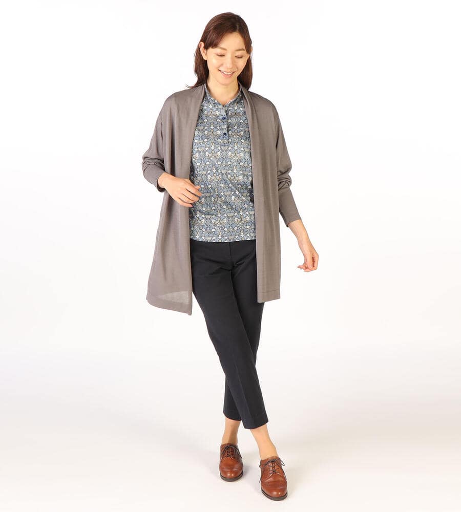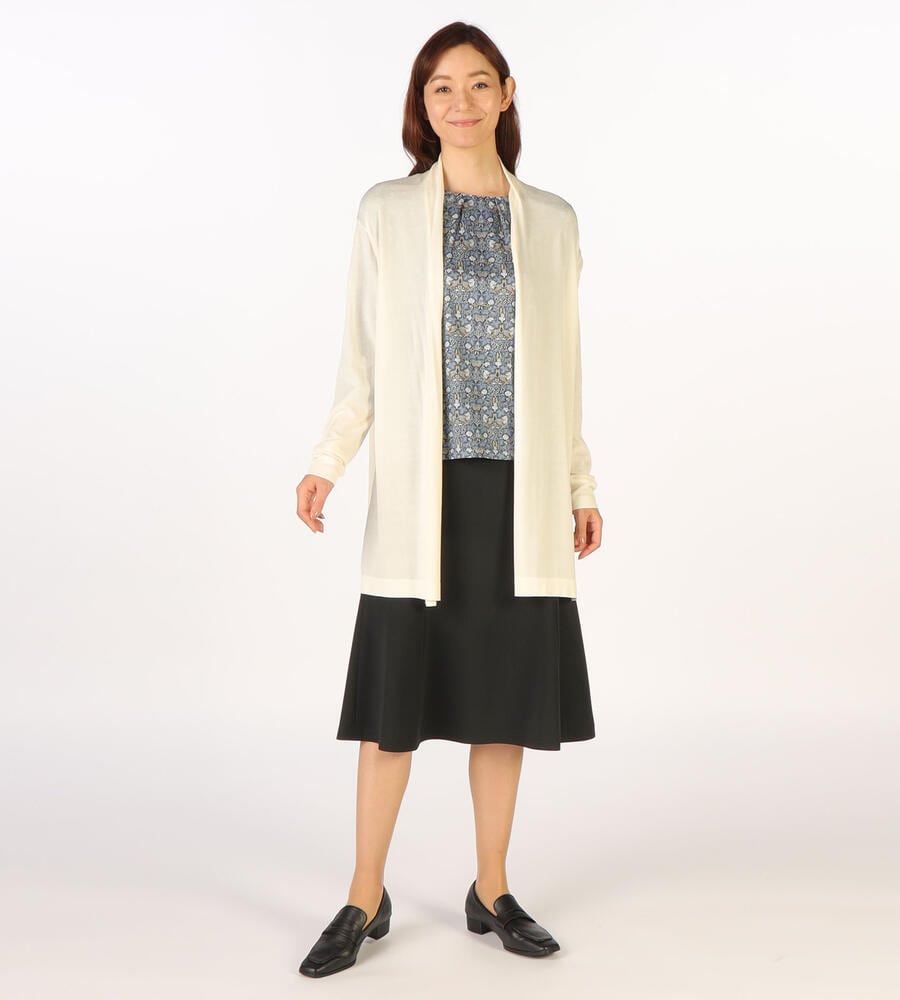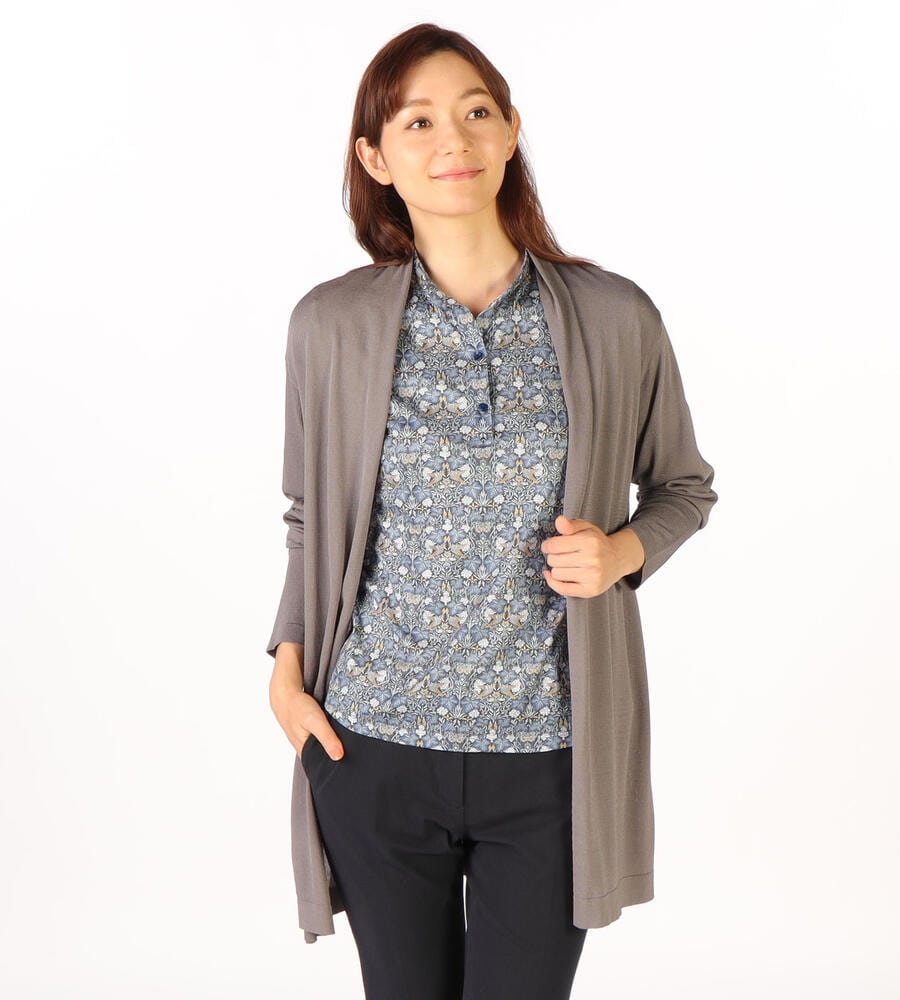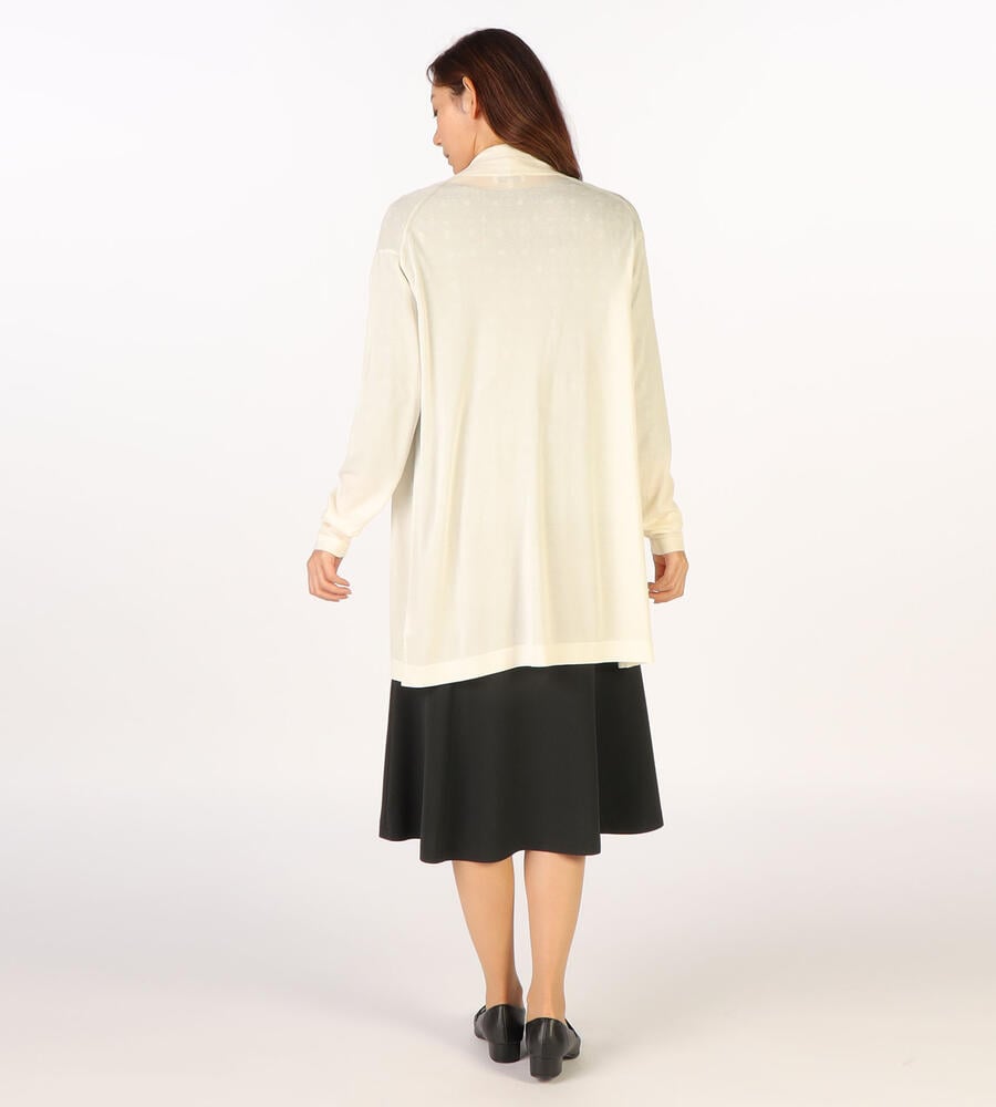 上品な光沢感と鮮やかな発色が魅力の、ブライトストレッチニット素材の長袖ニット。トレンドの、ボタンのないトッパーカーディガン。ストレッチ素材なので、身体の動きに合わせて伸縮し、ストレスフリーな快適な着心地。ゆとりのあるシルエットで様々なスタイルのトップスと好相性。デイリーに活躍するアイテムです。