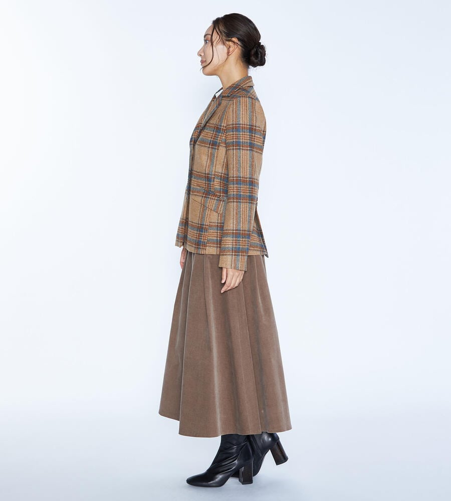 上質さとジェントルな空気感を併せ持つウール素材のチェック柄ジャケット。少し小ぶりなラペルや、上寄りに配置したボタンが、クラシカルな雰囲気を高めます。背面の中央寄りにインパーテッドプリーツを仕込み、後ろ姿を綺麗に見せる仕立て。同素材のスカートとのセットアップもお楽しみいただけます。