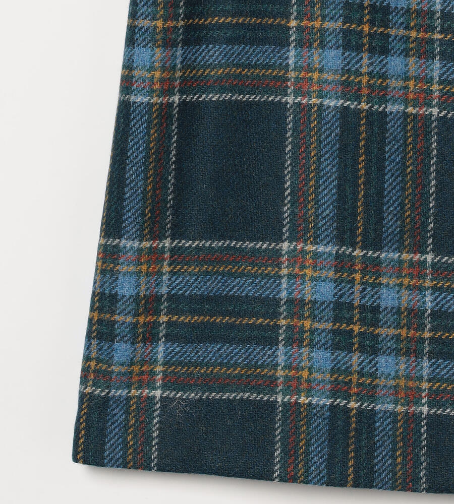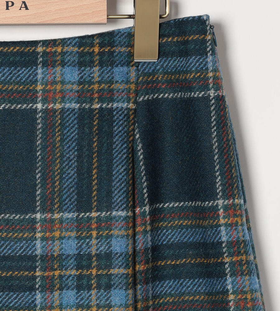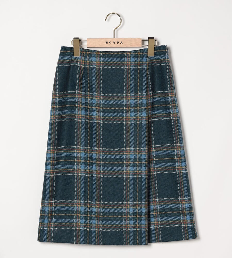 イギリス産の上質なウール素材を用いたスカート。ジェントルな空気感が漂うチェック柄を用いて、正統派の風格ある表情に仕上げています。フロントが重なって見えるラップ風の仕立て。膝が隠れる程度の着丈で、凛とした着こなしを楽しめます。同素材のジャケットを合わせたセットアップスタイルもおすすめです。