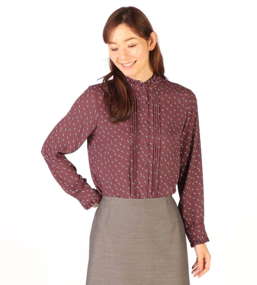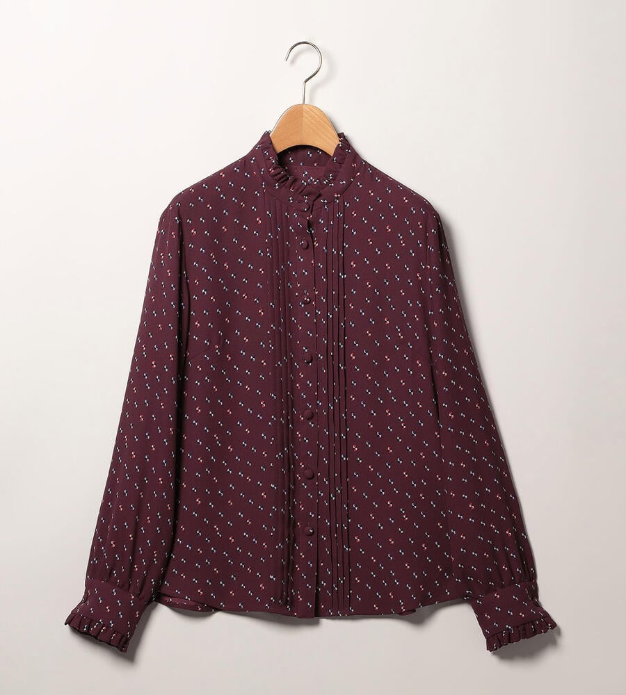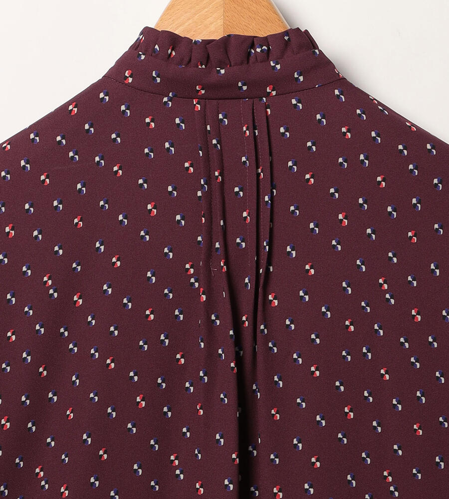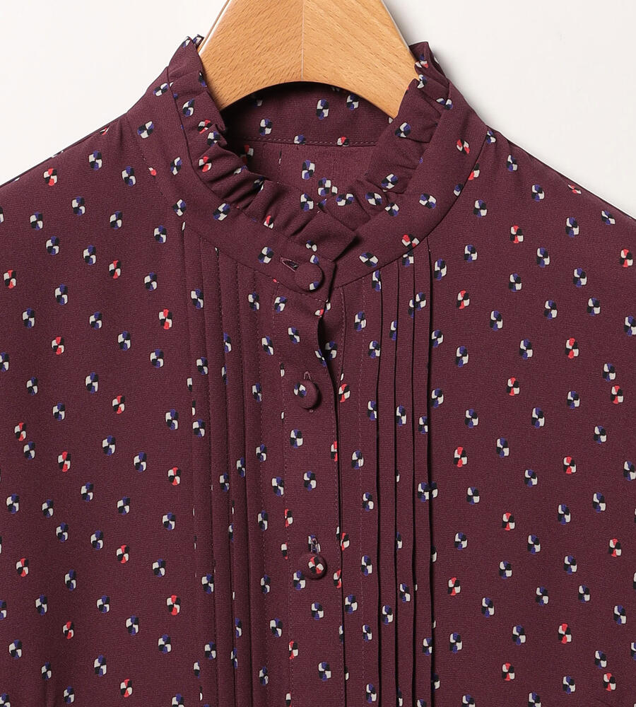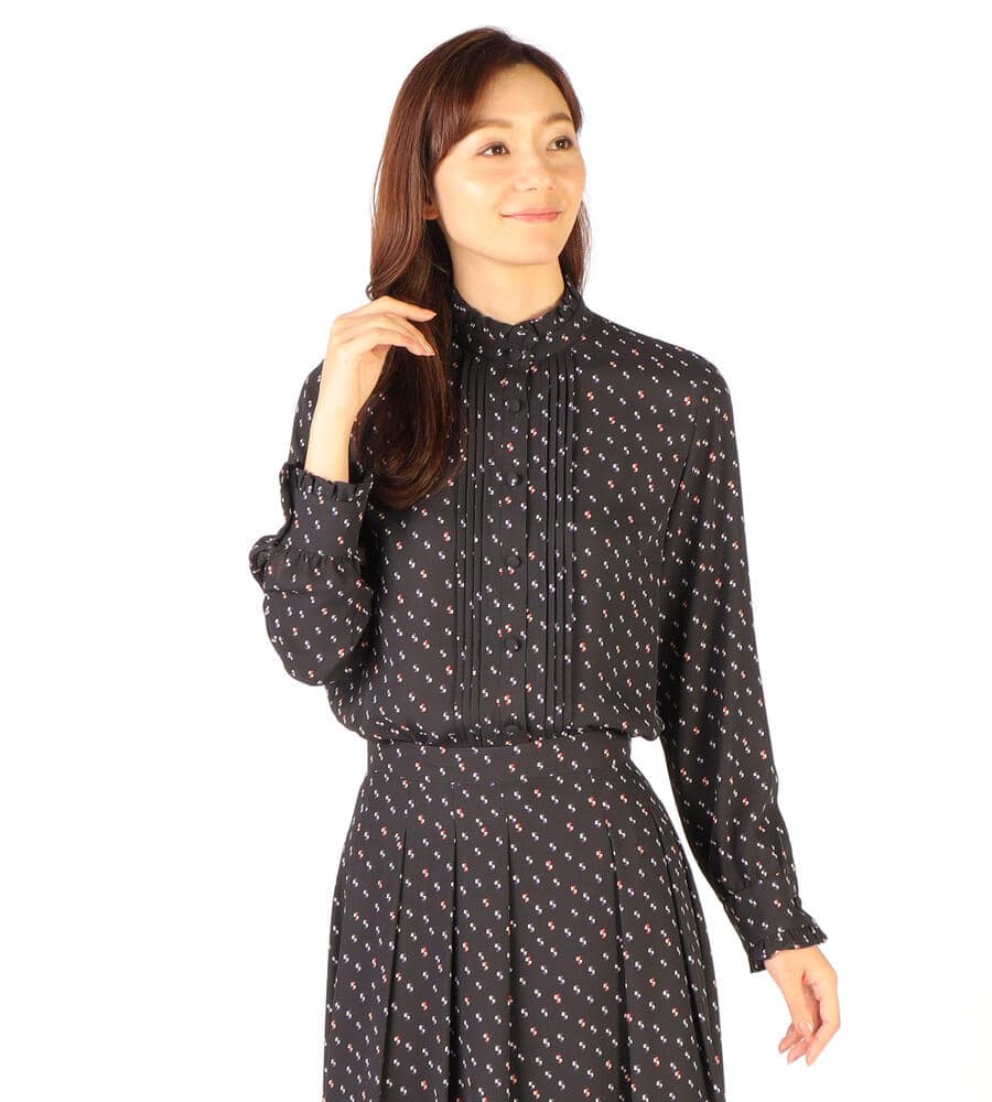 グラフィカルでレトロな雰囲気のドット柄が全面にプリントされた、エレガントな長袖ブラウス。ピンタック入りのフロントが上品かつ、華やかなムード。袖口とスタンドカラーの襟元のフリル、コロンとしたくるみボタンも愛らしいデザインポイント。スタイリッシュなスタイリングが完成するアイテムです。